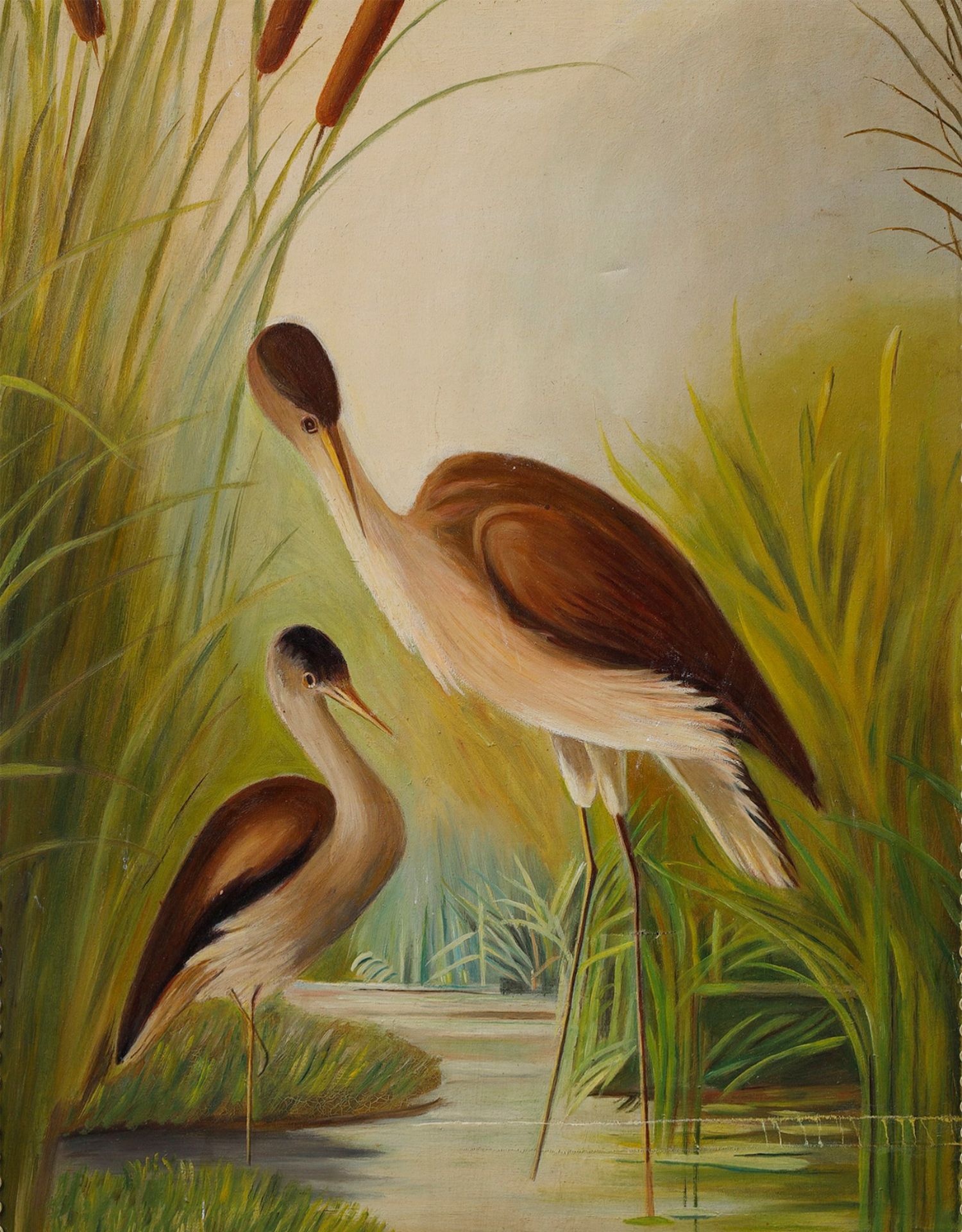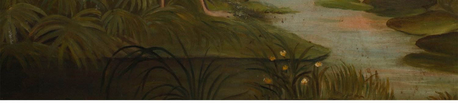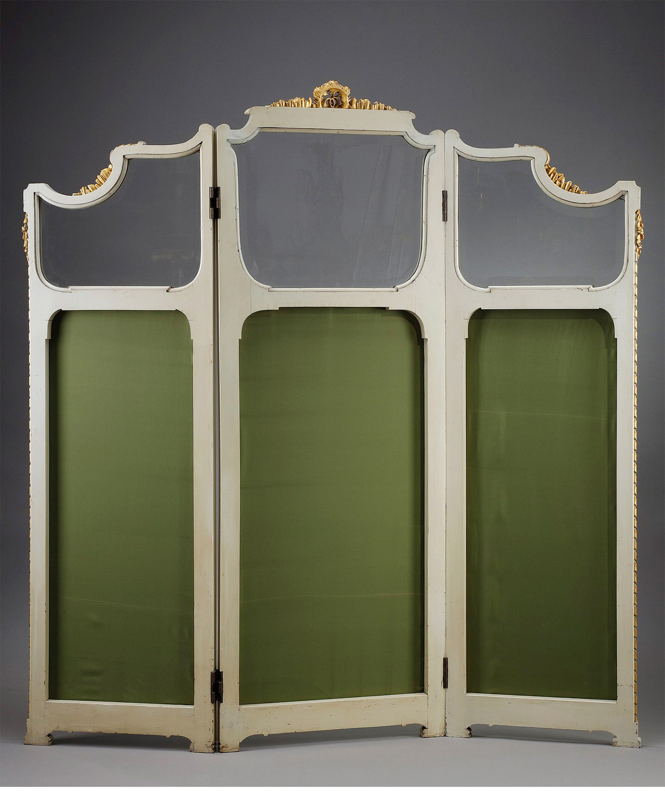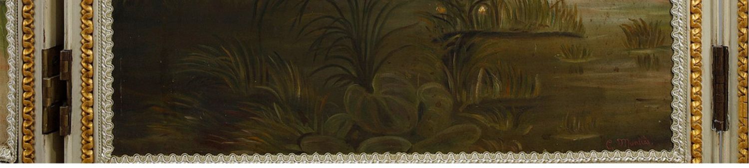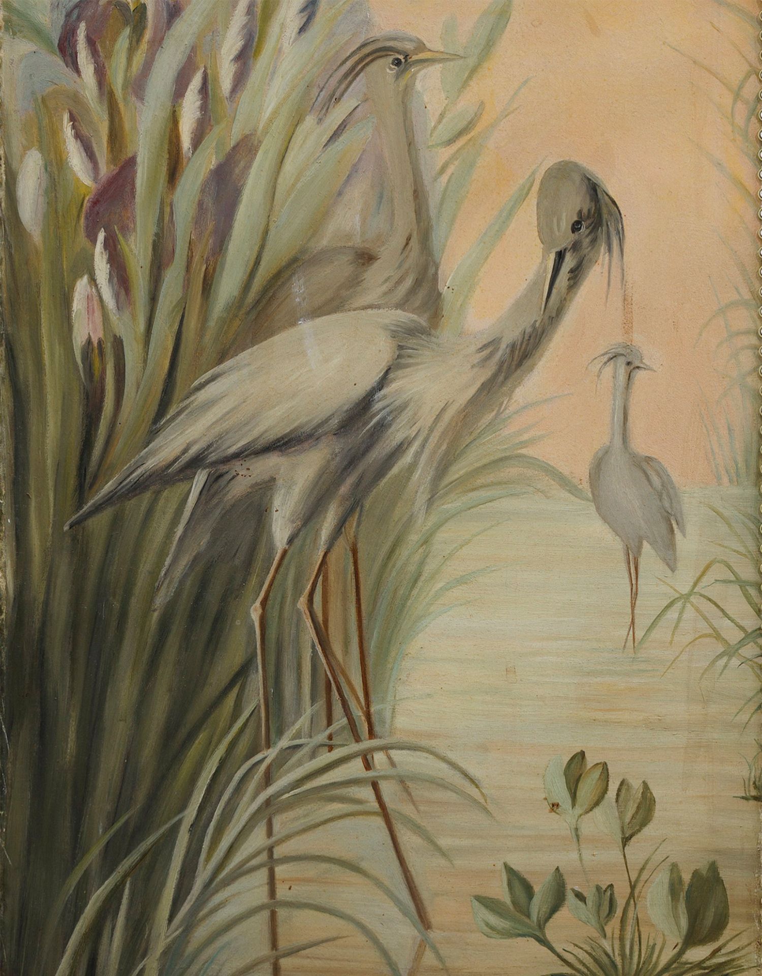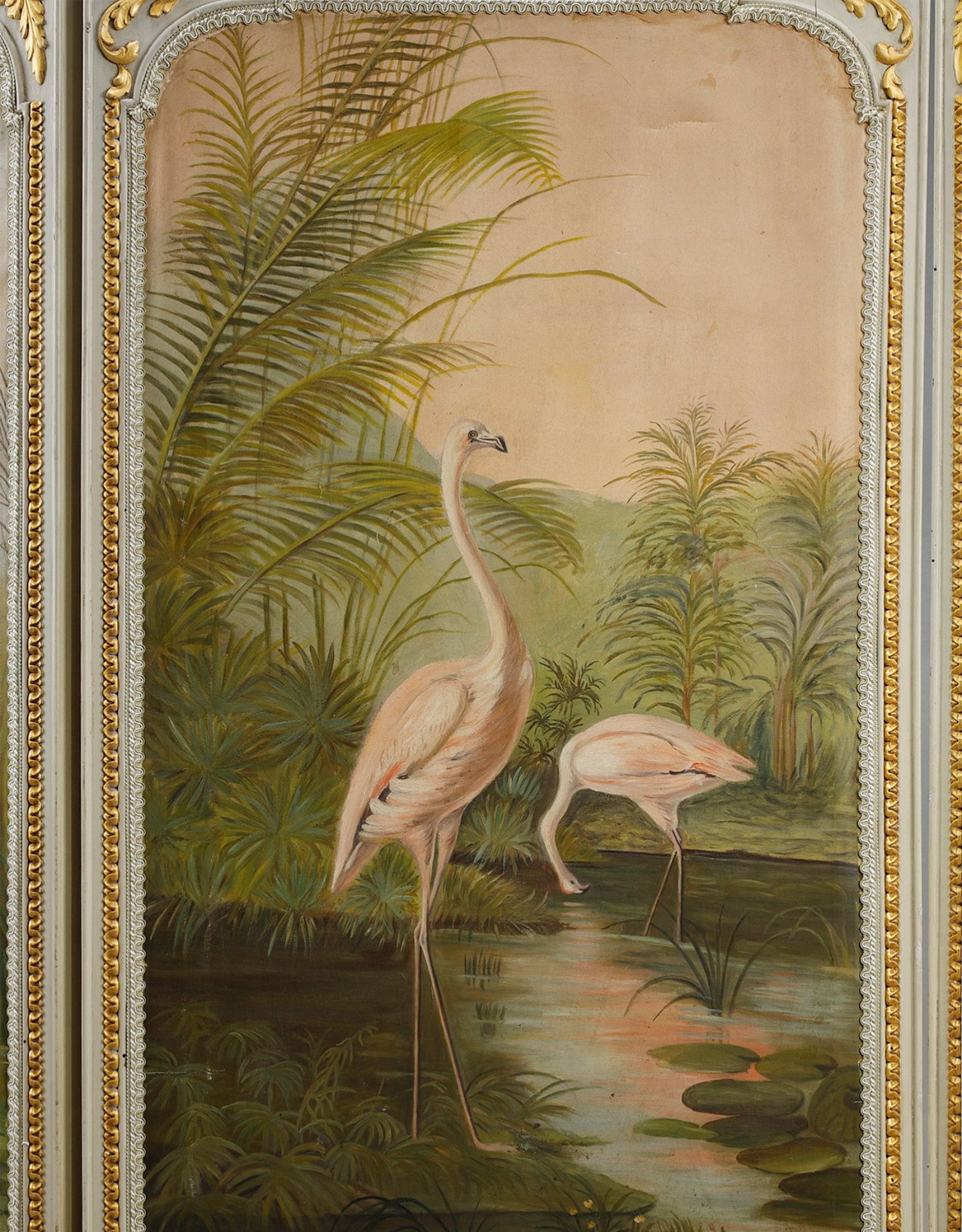 独角鹿西洋古董玻璃修漆木鎏金雕花边框水岸鸟鹤布面手绘三页屏风