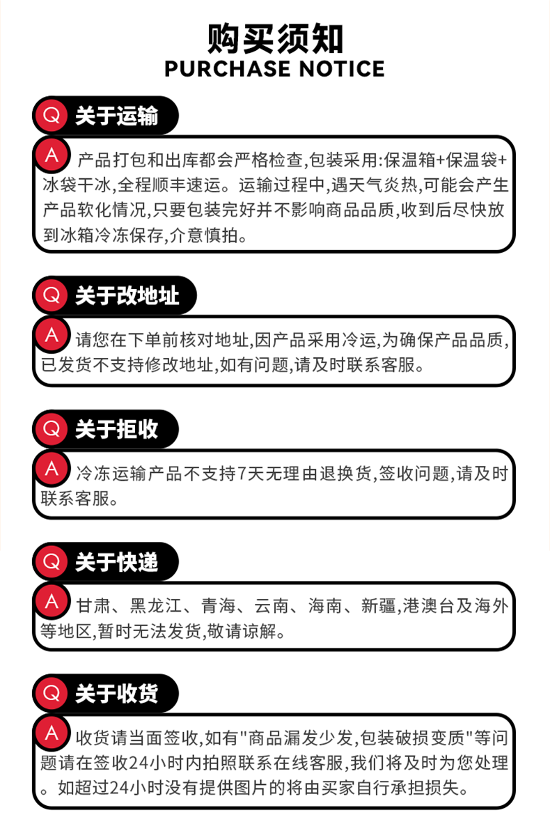 【售后】生鲜食品不接受7天无理由退货,发货后不支持退款,拦截,拒收。任何质量问题,漏发或破损,48小时内联系团长拍照反馈,补偿或补发。