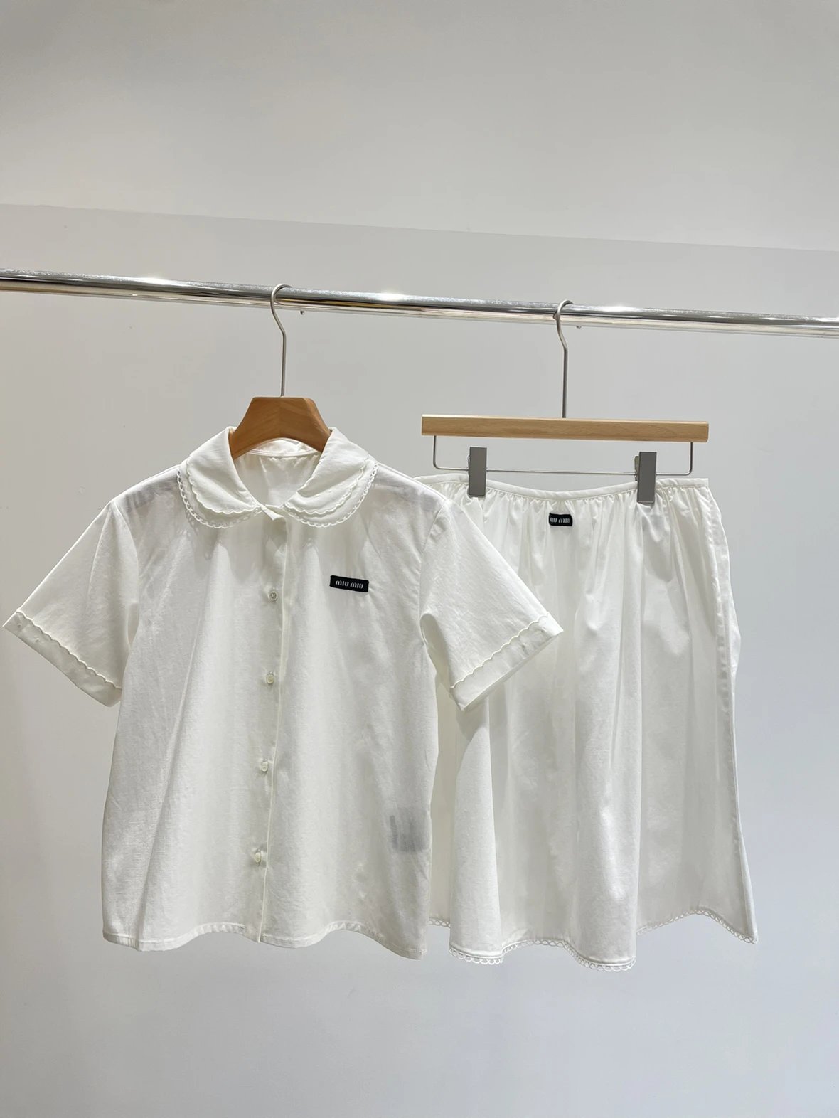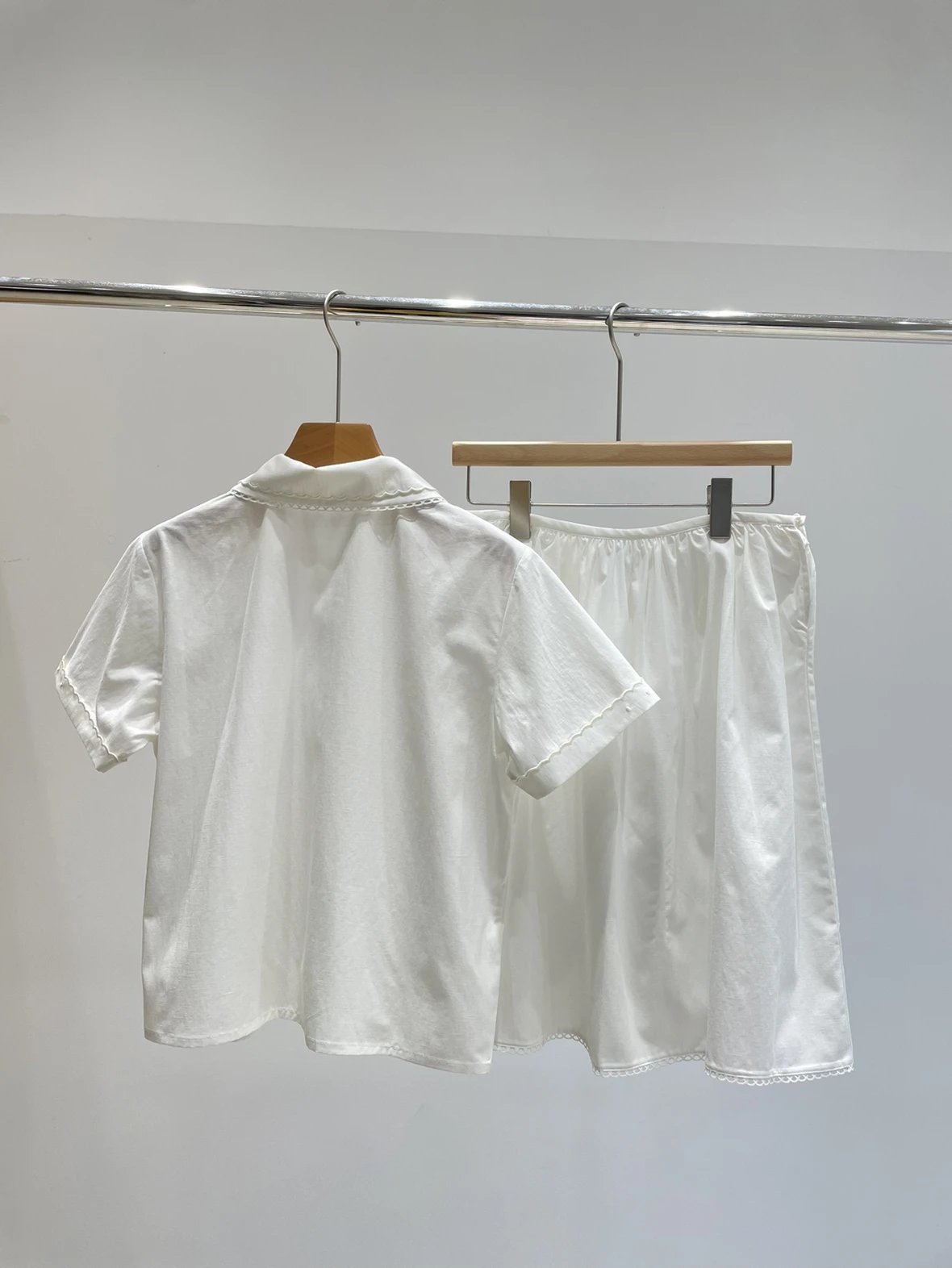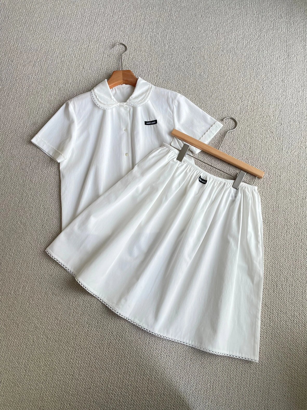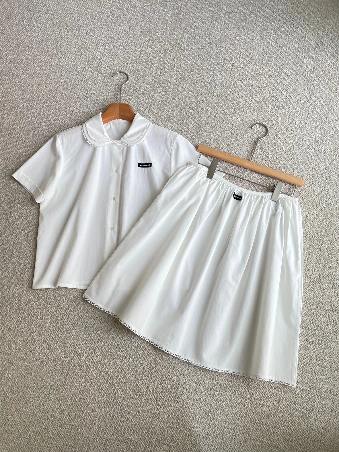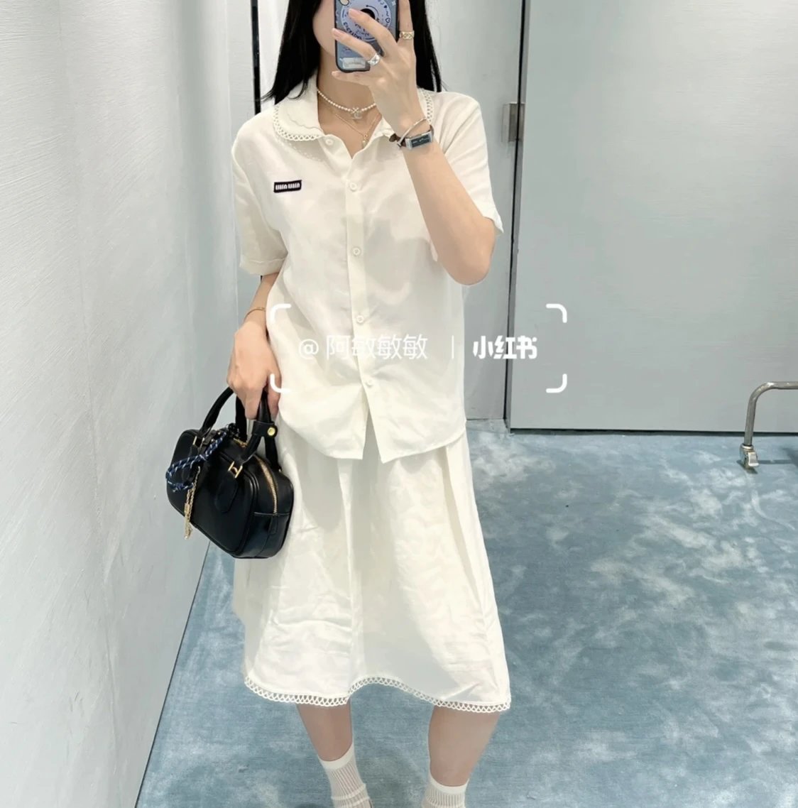 重磅推荐!miu花边学院风套装 蕾丝花边棉麻短袖衬衫+府绸竹节棉麻半裙