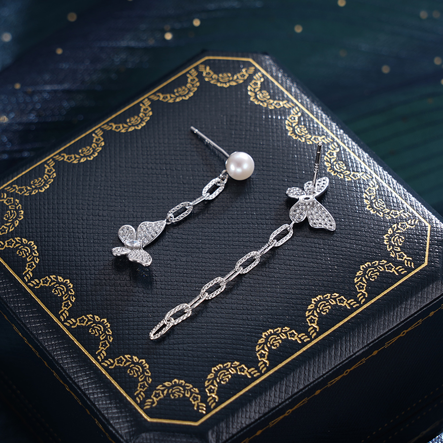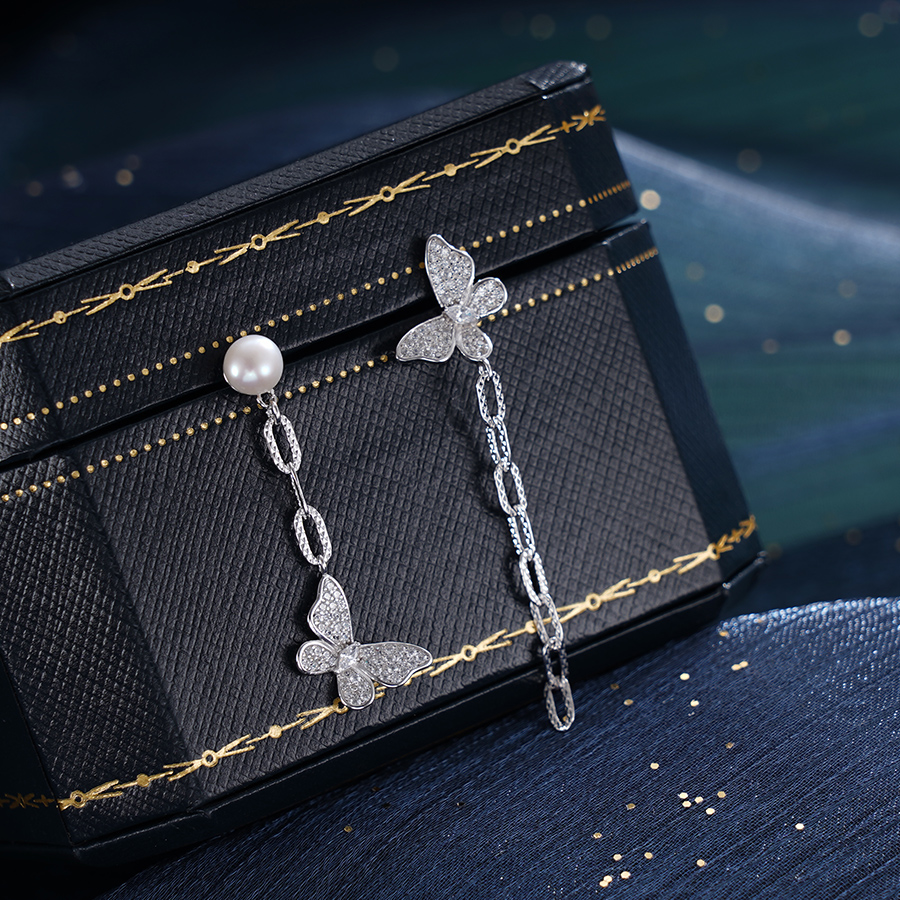 【寓意】:不对称设计糅合流苏形态,成就这款极具设计感的耳饰,微镶蝴蝶元素与珍珠巧妙搭配,光韵在错落间流淌,成就一场温柔接力。