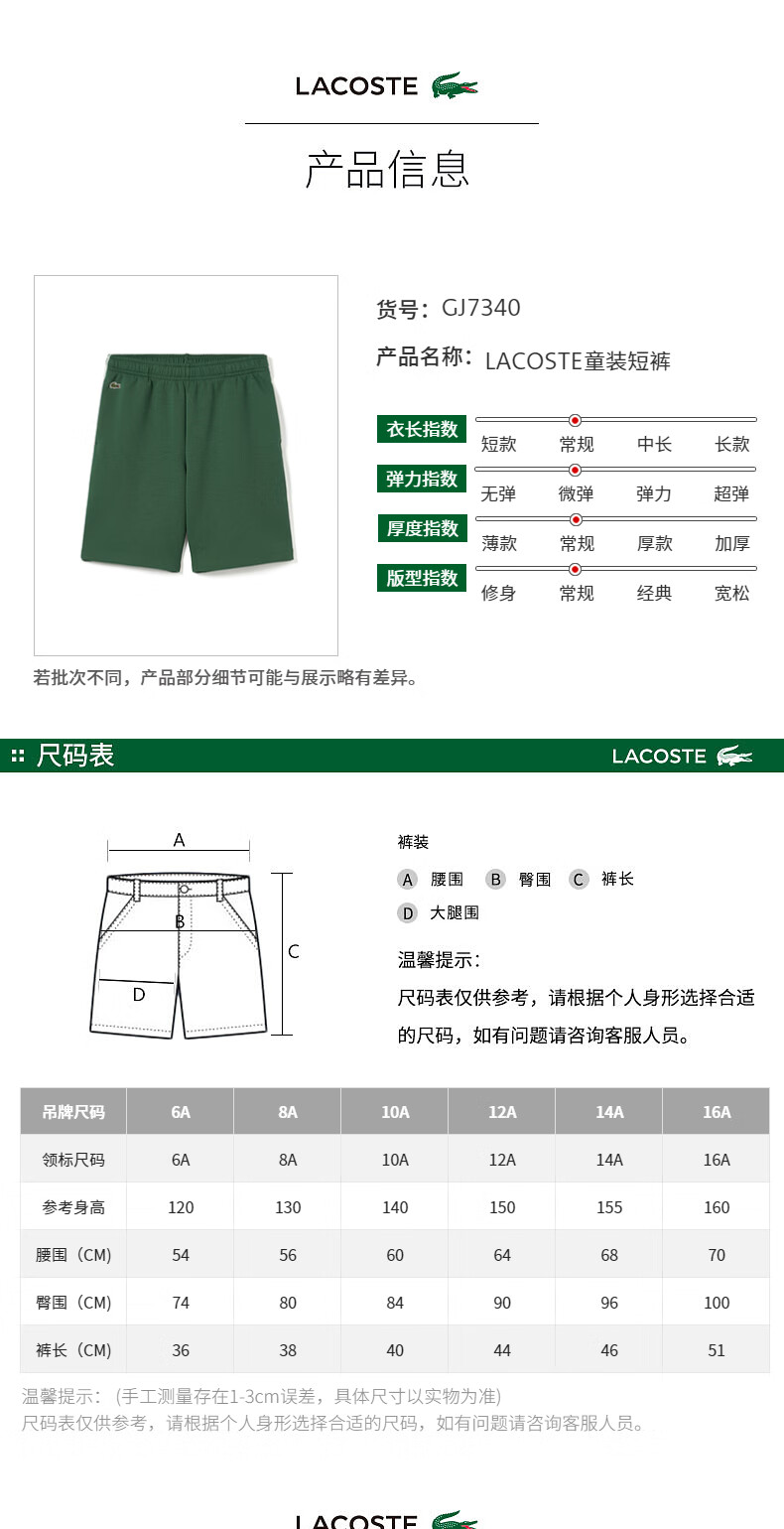 【海南专供价】Lacoste法国鳄鱼童装新款舒适运动短裤GJ7340-98