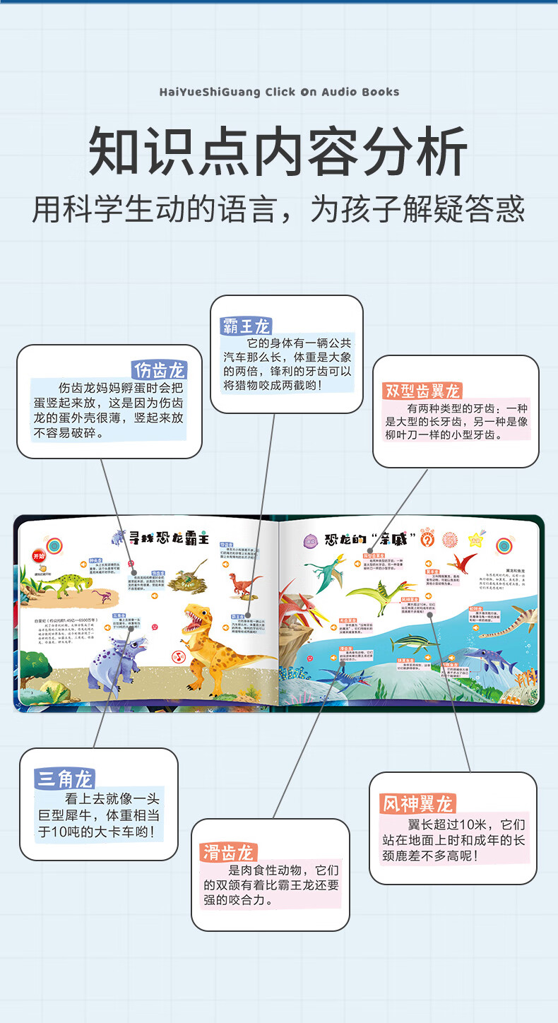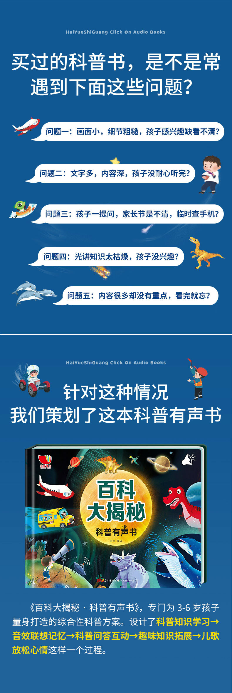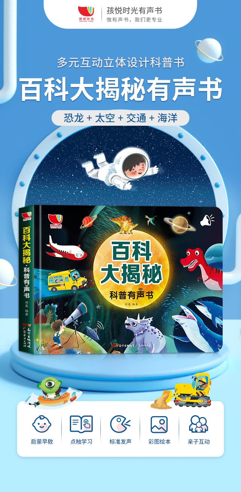 《百科大揭秘·科普有声书》是针对3~6岁儿童编写的一本综合性科普有声书。本书涵盖了恐龙、太空、交通、海洋四大主题,不仅包括趣味的科普知识,还有生动的音效、有趣的对话和动听的儿歌,内容十分丰富。