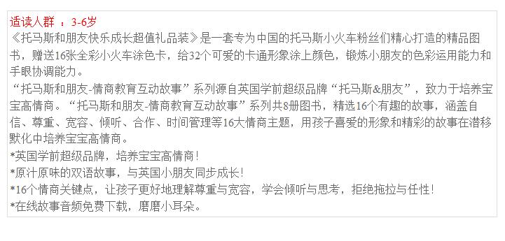 《托马斯和朋友快乐成长超值礼品装》精装礼盒,包含8本《托马斯和朋友?情商教育互动故事》,另赠16张全彩小火车涂色卡。