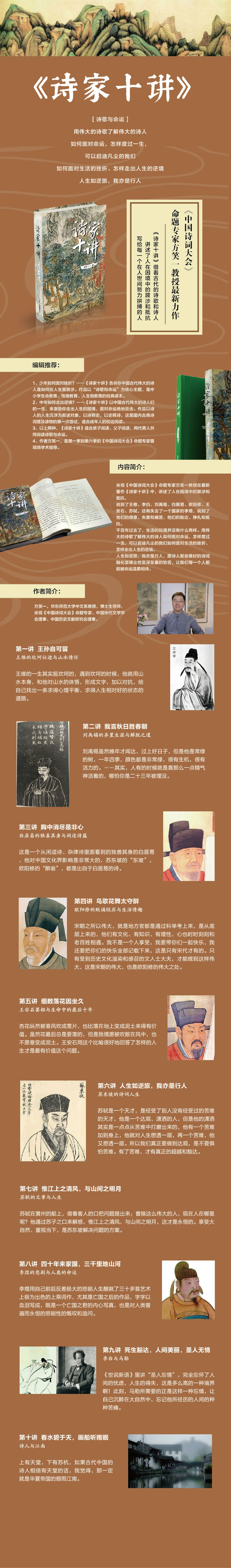 这本《诗家十讲》涉及中国古代诗人王维、李白、白居易、刘禹锡、李煜、欧阳修、王安石、苏轼等,是根据我近年来在各种机构和媒体所做的十次演讲,记录整理而成。这些讲座面向广大的诗词爱好者,而不是专业学者。我发现,普通听众对诗人的人生浮沉,尤其是他们在人生逆境中的经历,比诗词本身更感兴趣。我想这是因为,在快节奏高强度的生活工作中,在日趋激烈的职场竞争中,每个人都有可能遭遇种种不顺,陷入暂时的困境,而倾听这些古代诗人的经历,恰恰可以帮助我们走出逆境。