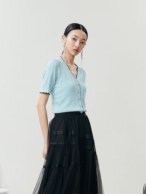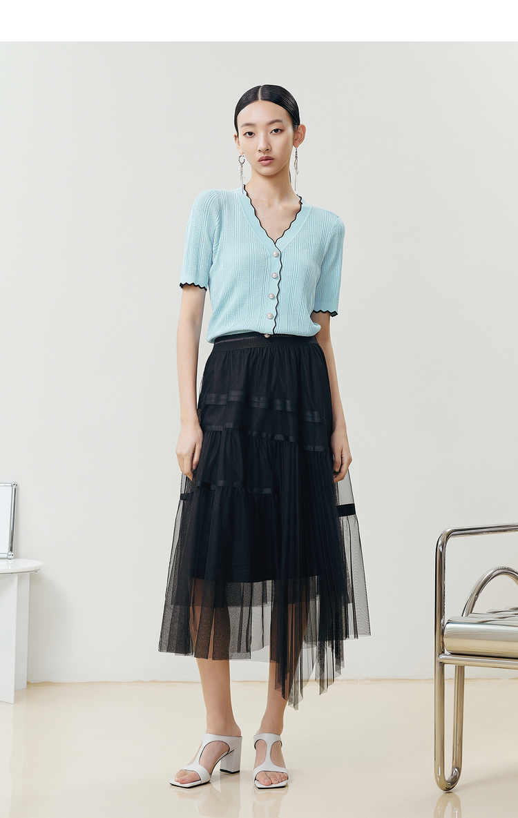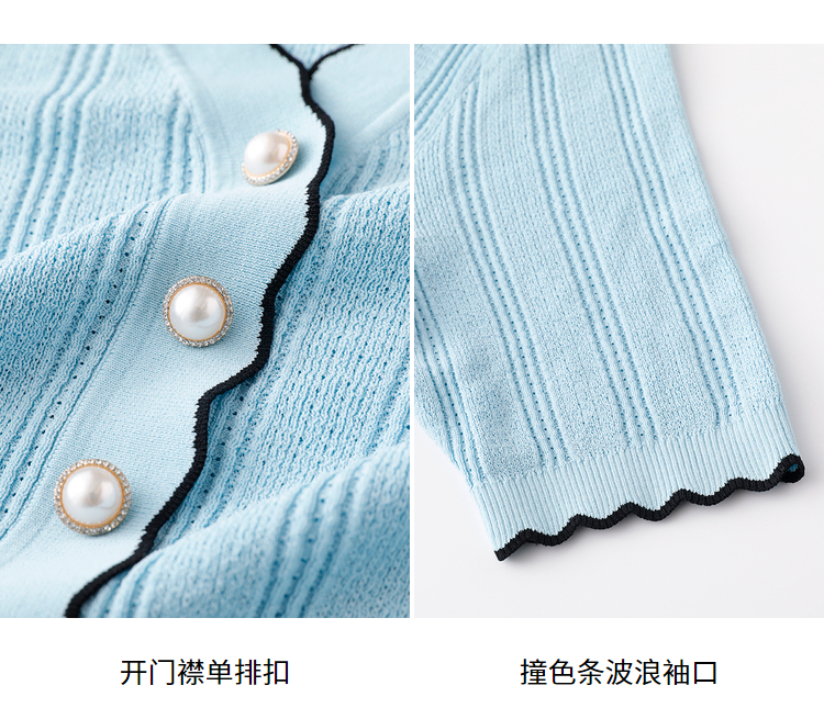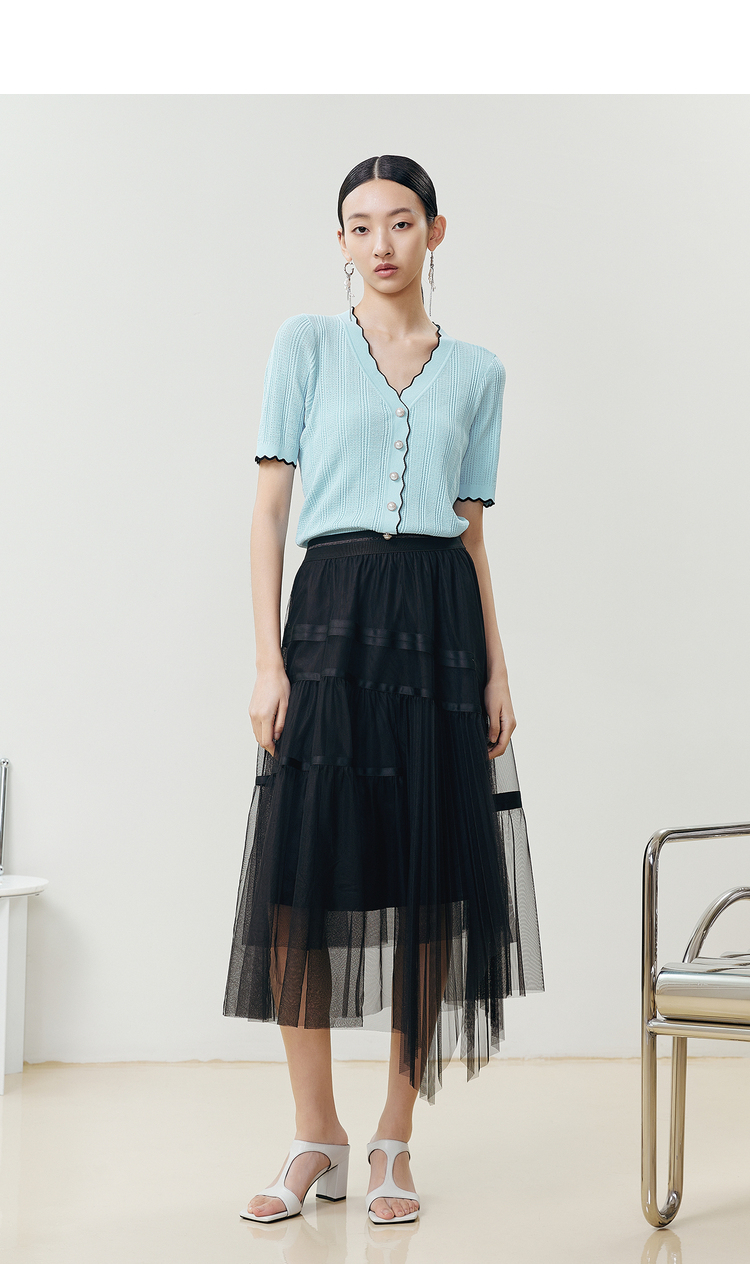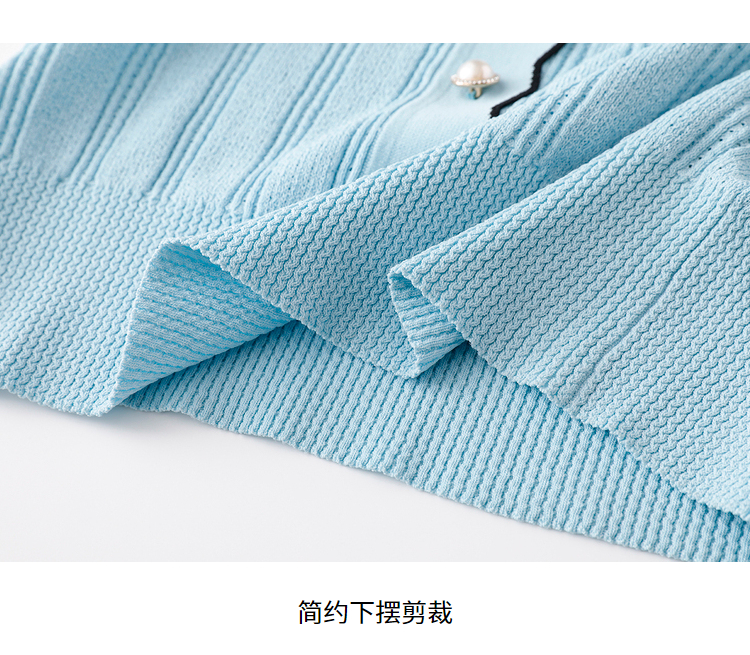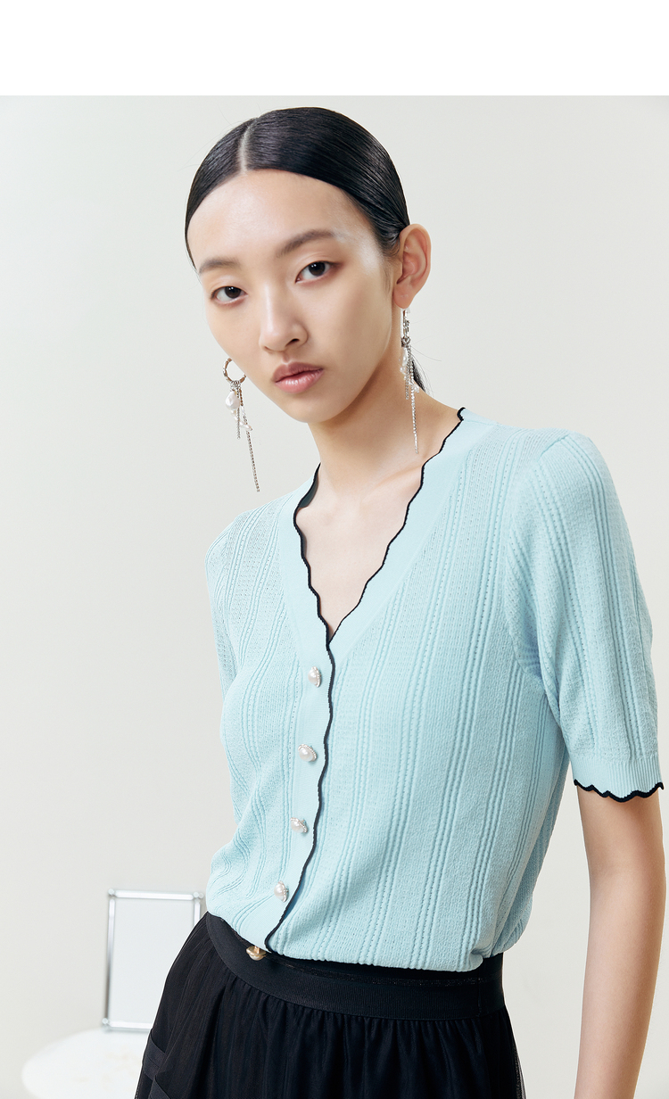 NEELLY纳俪商场同款气质V领波浪短袖针织衫女夏季新品透气单排扣N22042A01033