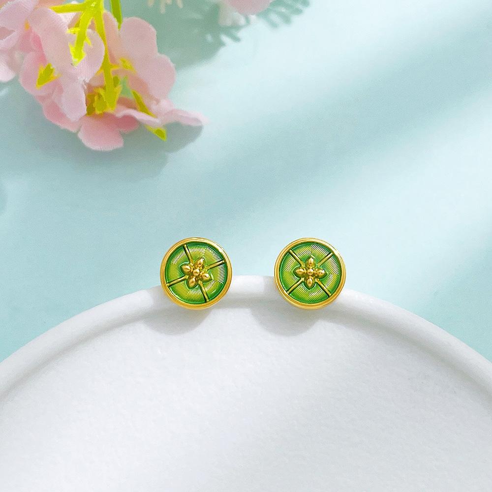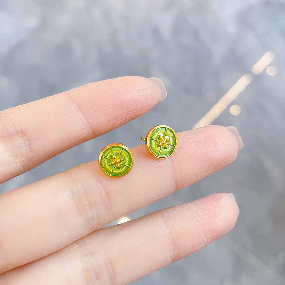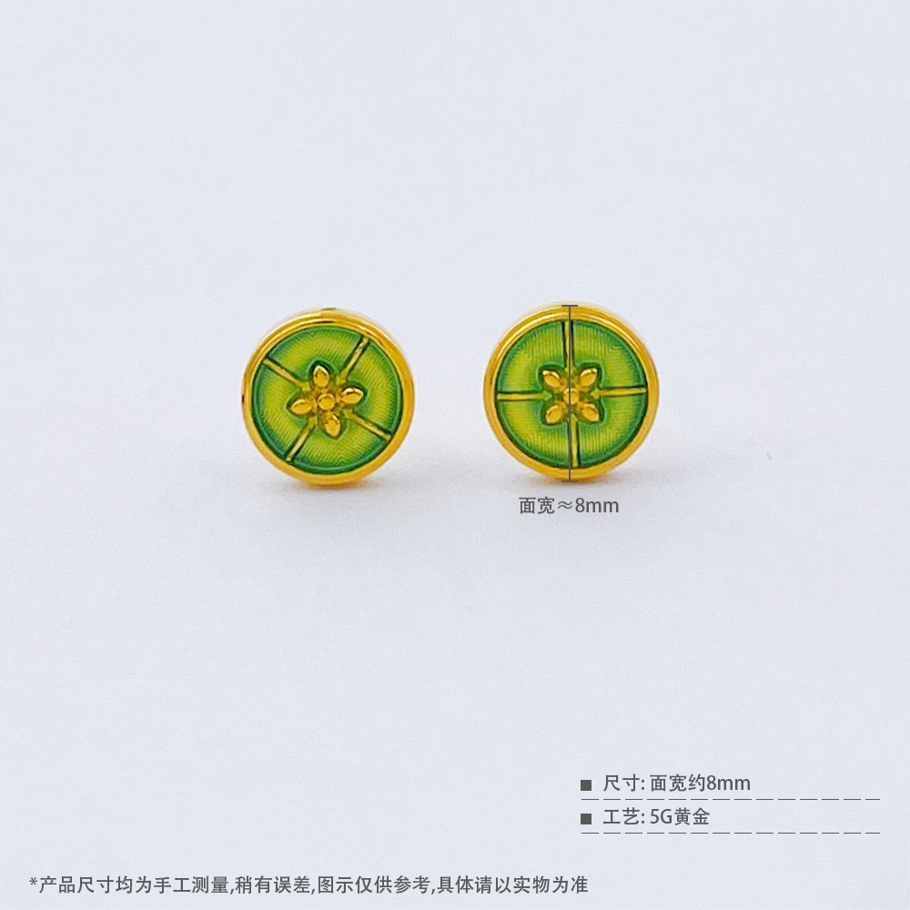 【限时克减150元】足金999 #低温珐琅 【精品】5G黄金实心春绿玑镂珐琅繁花花窗如意纹圆形耳饰耳钉(配胶塞)(AU5GES00012)(预售产品下单后不退款不退货不换货不补差价