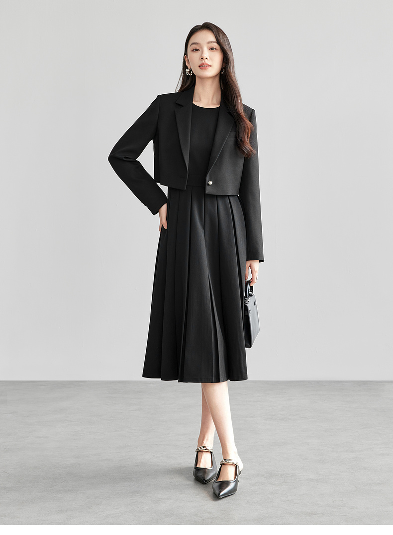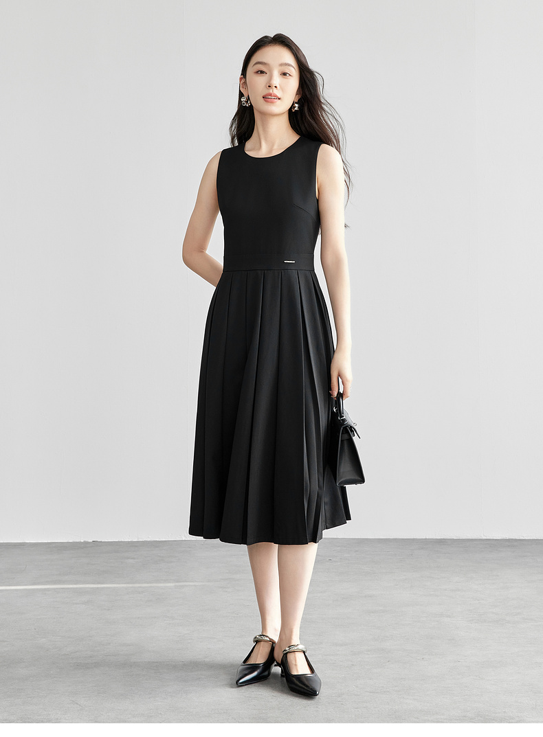 【内购】通勤气质显瘦圆领无袖背心A字百褶小黑裙-151L57558
