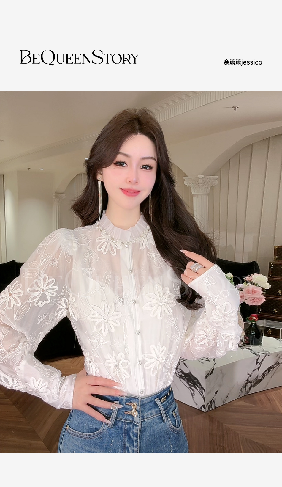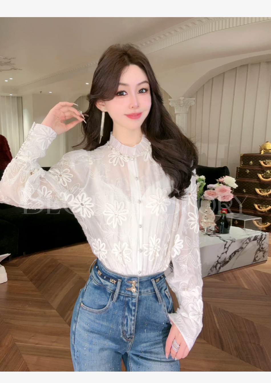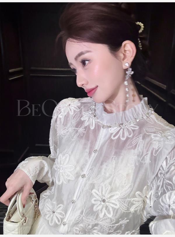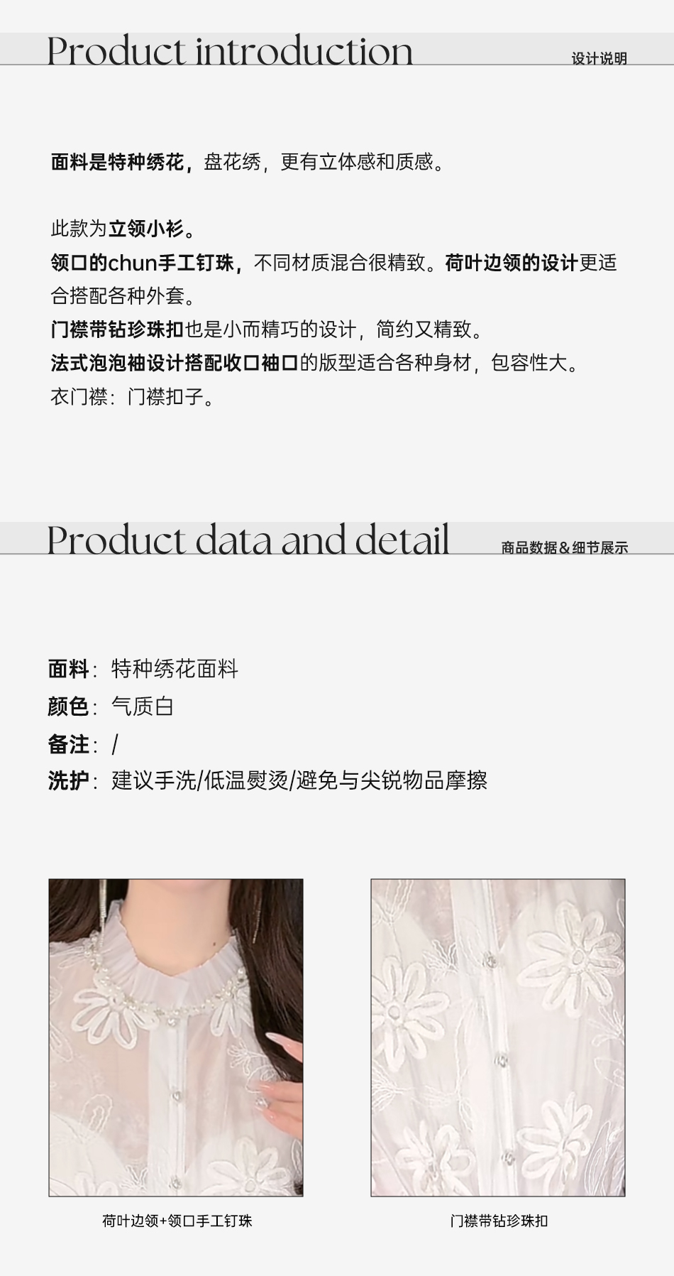 【孤品样衣,不退不换】【花月茉莉】法式特种绣花钉珠荷叶边立领泡泡袖衬衫