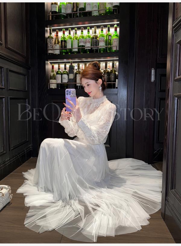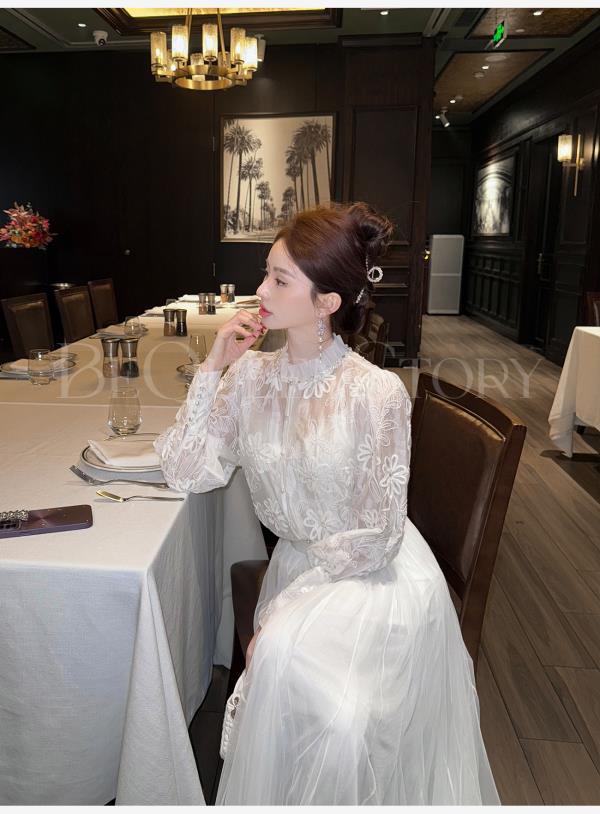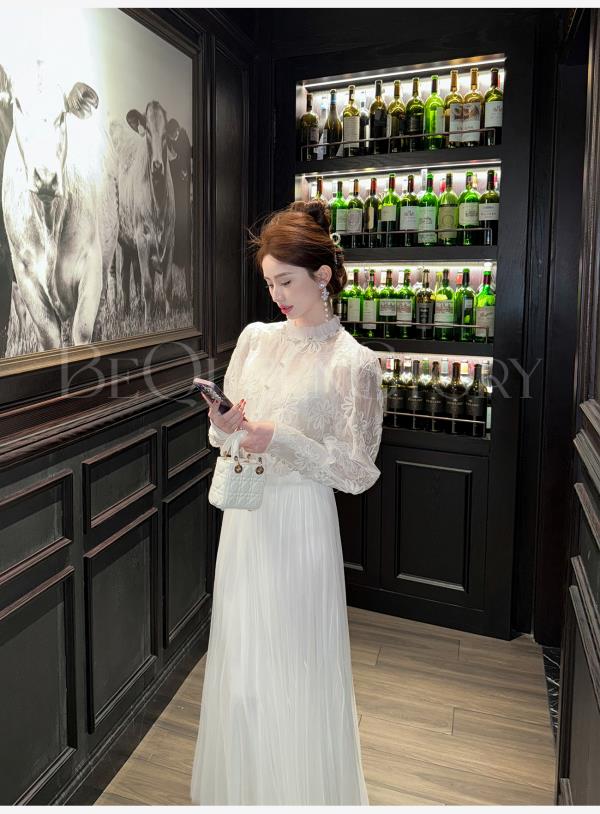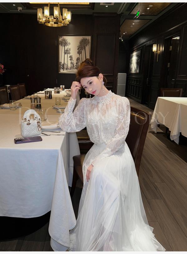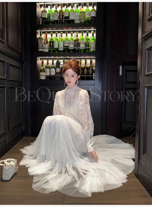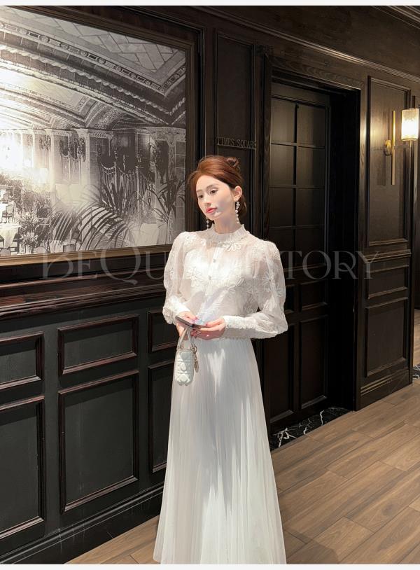 【孤品样衣,不退不换】【花月茉莉】法式特种绣花钉珠荷叶边立领泡泡袖衬衫