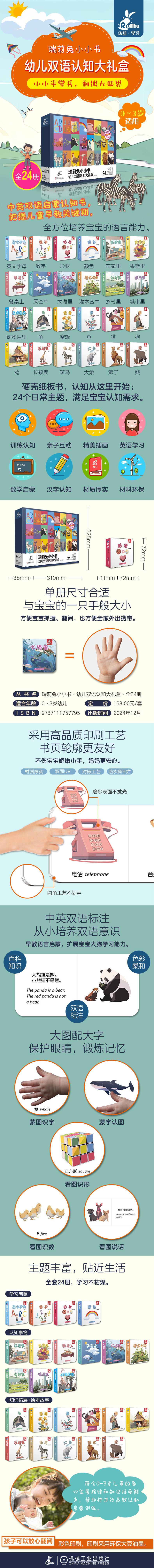 “瑞莉兔小小书 幼儿双语认知大礼盒”是一套针对低龄儿童设计的,包含英文字母、数字、形状、颜色、家居用品、家用电器以及各种动植物等24个主题的认知纸板书。 第1册到第4册,主要介绍了26个英文字母,数字1到10,10种常见形状,以及5种基本颜色,以帮助孩子们掌握最基础的生活常识,从而使他们更好地学习后面的知识。第5册到第12册,主要介绍了孩子们身边各种生活场景中的事物,如家中常见的物品、水果篮里的水果、餐桌上的食物以及天空中的云彩等,以帮助孩子们了解身边的环境,进而使他们逐渐扩展视野。第13册到第24册,主要介绍了12种不同动物的简单知识,以帮助孩子们了解这些不同动物的形态和特点,进而对大自然产生浓厚的兴趣。 总之,“瑞莉兔小小书 幼儿双语认知大礼盒”中的每一本书都有一个独立的主题,内容丰富、生动有趣,既能让孩子们在阅读中感受到知识的快乐,又能提高其认知能力和语言表达能力。 01.英文字母 ......