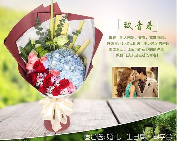 灿烂的笑---1枝绣球花,4枝粉玫瑰,7枝红玫瑰,适量乒乓菊,桔梗,尤加利,剑叶,相思梅 酒红色南韩纸单面包装,米色蝴蝶结修饰(1299)