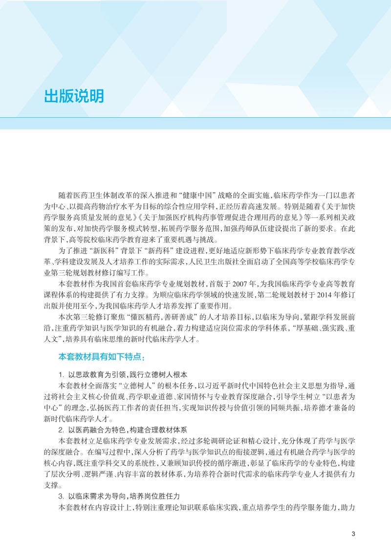 临床药学专业第三轮规划教材的修订编写,将围绕全国高等学校临床药学专业本科教育和人才培养的目标要求,加强整套教材的顶层设计,进一步优化主体框架设计,做到内容选取详略适宜,前后知识衔接有序,以培养具备一定的医学知识和精通药学理论,能够全面了解药物在临床治疗中的作用和应用,具备良好的临床思维和实践能力,能够根据患者的具体情况制定个性化的药物治疗方案的临床药师。教材内容编写上坚持教材“三基”“五性”“三特定”的原则,紧密结合行业发展,补充重要新知识、新进展。 在编写中不仅要紧跟临床药学学科发展潮流,还要充分体现临床药学教育教学的先进理念。在教材建设中,将尽量采用案例导入、问题**等编写方式,并多配图表,让知识更加形象直观,便于教师讲授与学生理解,并同步建设以纸质教材内容为核心的多样化的数字教学资源,从广度、深度上拓展纸质教材内容。通过在纸质教材中增加二维码的方式,链接视频、动画、图片、PPT、音频、文档等富媒体资源,丰富纸质教材的表现形式,帮助翻转课堂教学实现,让学生在课前通过在线学习资源自主学习,课堂上则以讨论和实践为主,以便更好地培养学生的实践能力和创新能力。