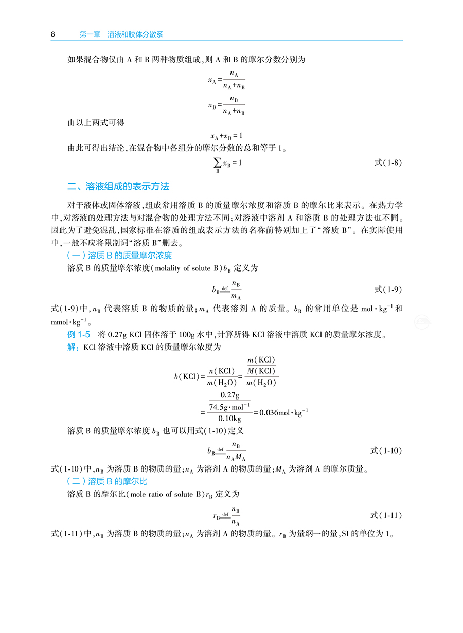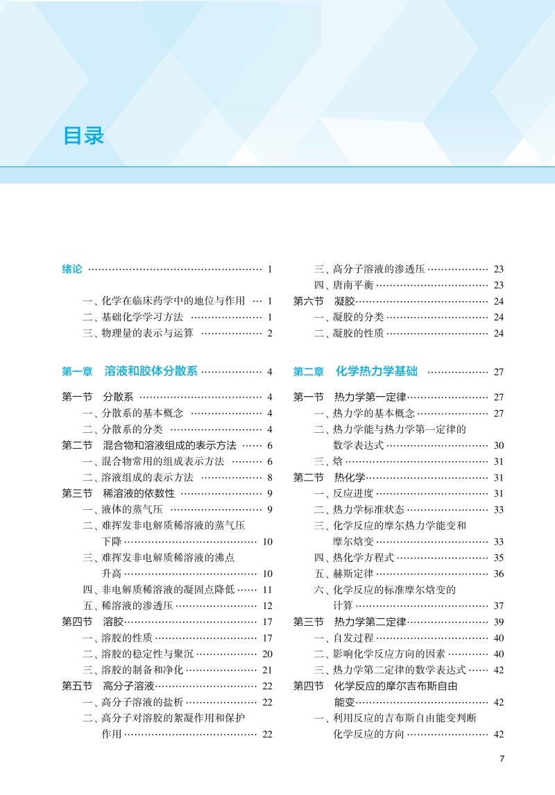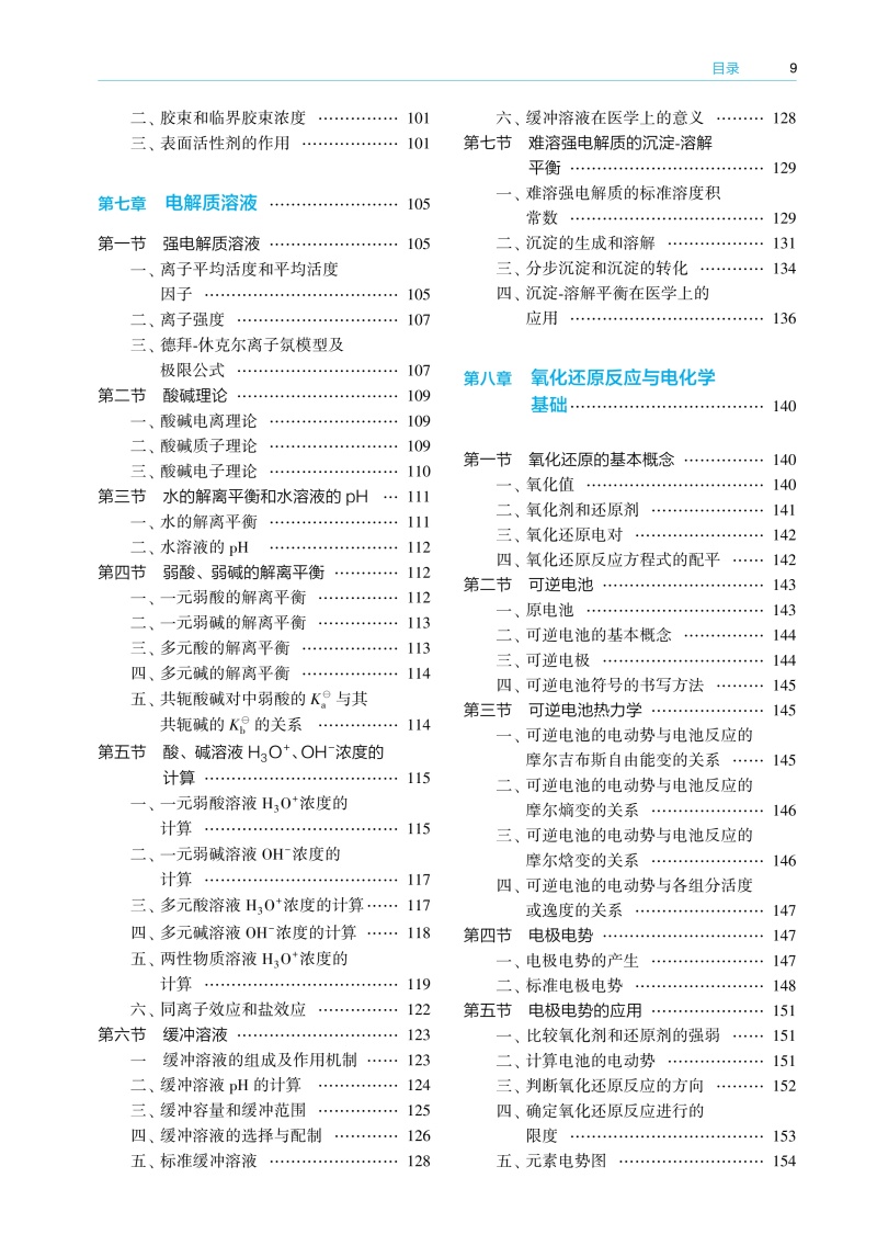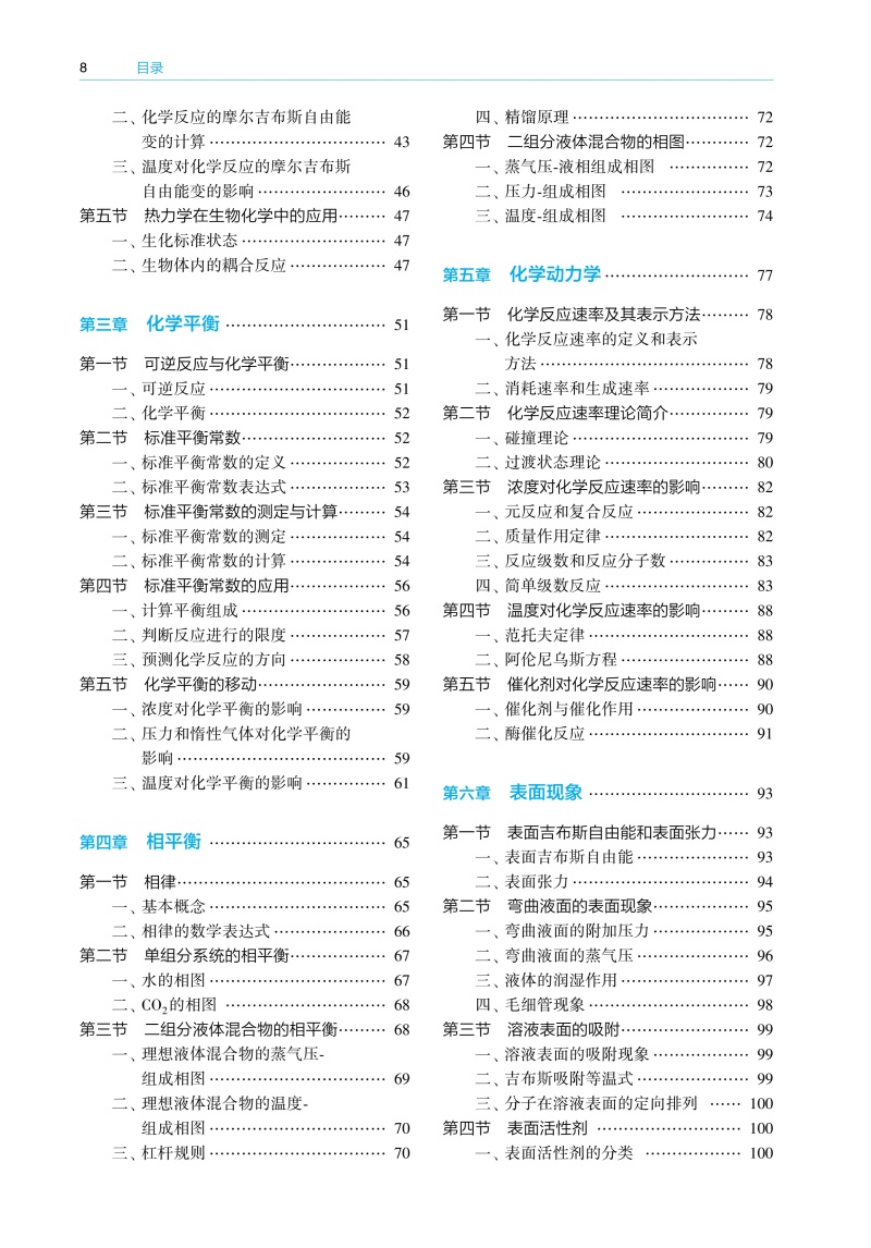 绪论 / 1 一、 化学在临床药学中的地位与作用 / 1 二、 基础化学学习方法 / 1 三、 物理量的表示与运算 / 2 第一章溶液和胶体分散系/ 4 第一节分散系 / 4 一、 分散系的基本概念 / 4 二、 分散系的分类 / 4 第二节混合物和溶液组成的表示方法 / 6 一、 混合物常用的组成表示方法 / 6 二、 溶液组成的表示方法 / 8 第三节稀溶液的依数性 / 9 一、 液体的蒸气压 / 9 二、难挥发非电解质稀溶液的蒸气压下降/ 10 三、难挥发非电解质稀溶液的沸点升高/ 10 四、 非电解质稀溶液的凝固点降低/ 11 五、 稀溶液的渗透压/ 12 第四节溶胶/ 17 一、 溶胶的性质/ 17 二、 溶胶的稳定性与聚沉/ 20 三、 溶胶的制备和净化/ 21 第五节高分子溶液/ 22 一、 高分子溶液的盐析/ 22 二、高分子对溶胶的絮凝作用和保护作用/ 22 三、 高分子溶液的渗透压/ 23 四、 唐南平衡/ 23 第六节凝胶/ 24 一、 凝胶的分类/ 24 二、 凝胶的性质/ 24 第二章化学热力学基础 / 27 第一节热力学第一定律/ 27 一、 热力学的基本概念/ 27 二、热力学能与热力学第一定律的数学表达式/ 30 三、 焓/ 31 第二节热化学/ 31 一、 反应进度/ 31 二、 热力学标准状态/ 33 三、化学反应的摩尔热力学能变和摩尔焓变/ 33 四、 热化学方程式/ 35 五、 赫斯定律/ 36 六、化学反应的标准摩尔焓变的计算/ 37 第三节热力学第二定律/ 39 一、 自发过程/ 40 二、 影响化学反应方向的因素/ 40 三、 热力学第二定律的数学表达式/ 42 第四节化学反应的摩尔吉布斯自由能变/ 42 一、利用反应的吉布斯自由能变判断化学反应的方向/ 42 二、化学反应的摩尔吉布斯自由能变的计算/ 43 三、温度对化学反应的摩尔吉布斯自由能变的影响/ 46 第五节热力学在生物化学中的应用/ 47 一、 生化标准状态/ 47 二、 生物体内的耦合反应/ 47 第三章化学平衡 / 51 第一节可逆反应与化学平衡/ 51 一、 可逆反应/ 51 二、 化学平衡/ 52 第二节标准平衡常数/ 52 一、 标准平衡常数的定义/ 52 二、 标准平衡常数表达式/ 53 第三节标准平衡常数的测定与计算/ 54 一、 标准平衡常数的测定/ 54 二、 标准平衡常数的计算/ 54 第四节标准平衡常数的应用/ 56 一、 计算平衡组成/ 56 二、 判断反应进行的限度/ 57 三、 预测化学反应的方向/ 58 第五节化学平衡的移动/ 59 一、 浓度对化学平衡的影响/ 59 二、压力和惰性气体对化学平衡的影响/ 59 三、 温度对化学平衡的影响/ 61 第四章相平衡 / 65 第一节相律/ 65 一、 基本概念/ 65 二、 相律的数学表达式/ 66 第二节单组分系统的相平衡/ 67 一、 水的相图/ 67 二、 CO2的相图 / 68 第三节二组分液体混合物的相平衡/ 68 一、理想液体混合物的蒸气压 ̄组成相图/ 69 二、理想液体混合物的温度 ̄组成相图/ 70 三、 杠杆规则/ 70 四、 精馏原理/ 72 第四节二组分液体混合物的相图/ 72 一、 蒸气压 ̄液相组成相图 / 72 二、 压力 ̄组成相图 / 73 三、 温度 ̄组成相图 / 74 第五章化学动力学/ 77 第一节化学反应速率及其表示方法/ 78 一、化学反应速率的定义和表示方法/ 78 二、 消耗速率和生成速率/ 79 第二节化学反应速率理论简介/ 79 一、 碰撞理论/ 79 二、 过渡状态理论/ 80 第三节浓度对化学反应速率的影响/ 82 一、 元反应和复合反应/ 82 二、 质量作用定律/ 82 三、 反应级数和反应分子数/ 83 四、 简单级数反应/ 83 第四节温度对化学反应速率的影响/ 88 一、 范托夫定律/ 88 二、 阿伦尼乌斯方程/ 88 第五节催化剂对化学反应速率的影响/ 90 一、 催化剂与催化作用/ 90 二、 酶催化反应/ 91 第六章表面现象 / 93 第一节表面吉布斯自由能和表面张力/ 93 一、 表面吉布斯自由能/ 93 二、 表面张力/ 94 第二节弯曲液面的表面现象/ 95 一、 弯曲液面的附加压力/ 95 二、 弯曲液面的蒸气压/ 96 三、 液体的润湿作用/ 97 四、 毛细管现象/ 98 第三节溶液表面的吸附/ 99 一、 溶液表面的吸附现象/ 99 二、 吉布斯吸附等温式/ 99 三、 分子在溶液表面的定向排列 / 100 第四节表面活性剂 / 100 一、 表面活性剂的分类 / 100 二、 胶束和临界胶束浓度 / 101 三、 表面活性剂的作用 / 101 第七章电解质溶液 / 105 第一节强电解质溶液 / 105 一、离子平均活度和平均活度因子 / 105 二、 离子强度 / 107 三、德拜 ̄休克尔离子氛模型及极限公式 / 107 第二节酸碱理论 / 109 一、 酸碱电离理论 / 109 二、 酸碱质子理论 / 109 三、 酸碱电子理论 / 110 第三节水的解离平衡和水溶液的 pH / 111 一、 水的解离平衡 / 111 二、 水溶液的 pH / 112 第四节弱酸、弱碱的解离平衡 / 112 一、 一元弱酸的解离平衡 / 112 二、 一元弱碱的解离平衡 / 113 三、 多元酸的解离平衡 / 113 四、 多元碱的解离平衡 / 114 五、共轭酸碱对中弱酸的Ka 与其共轭碱的 Kb 的关系 / 114 第五节酸、碱溶液H3O+、OH-浓度的计算 / 115 一、一元弱酸溶液H3O+浓度的计算 / 115 二、一元弱碱溶液OH-浓度的计算 / 117 三、 多元酸溶液 H3O+浓度的计算/ 117 四、 多元碱溶液 OH-浓度的计算 / 118 五、两性物质溶液H3O+浓度的计算 / 119 六、 同离子效应和盐效应 / 122 第六节缓冲溶液 / 123 一 缓冲溶液的组成及作用机制 / 123 二、 缓冲溶液 pH 的计算 / 124 三、 缓冲容量和缓冲范围 / 125 四、 缓冲溶液的选择与配制 / 126 五、 标准缓冲溶液 / 128 六、 缓冲溶液在医学上的意义 / 128 第七节难溶强电解质的沉淀 ̄溶解平衡 / 129 一、难溶强电解质的