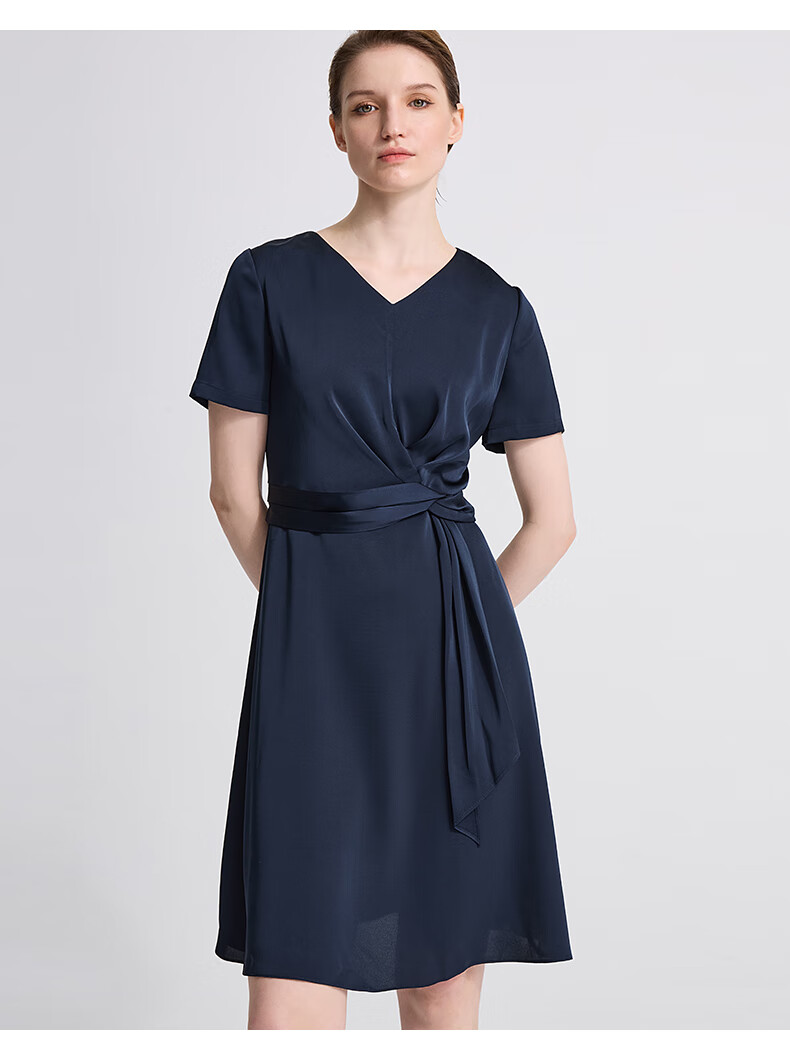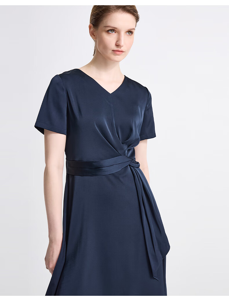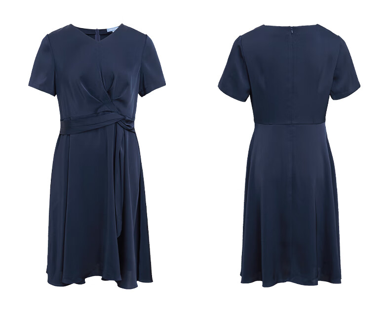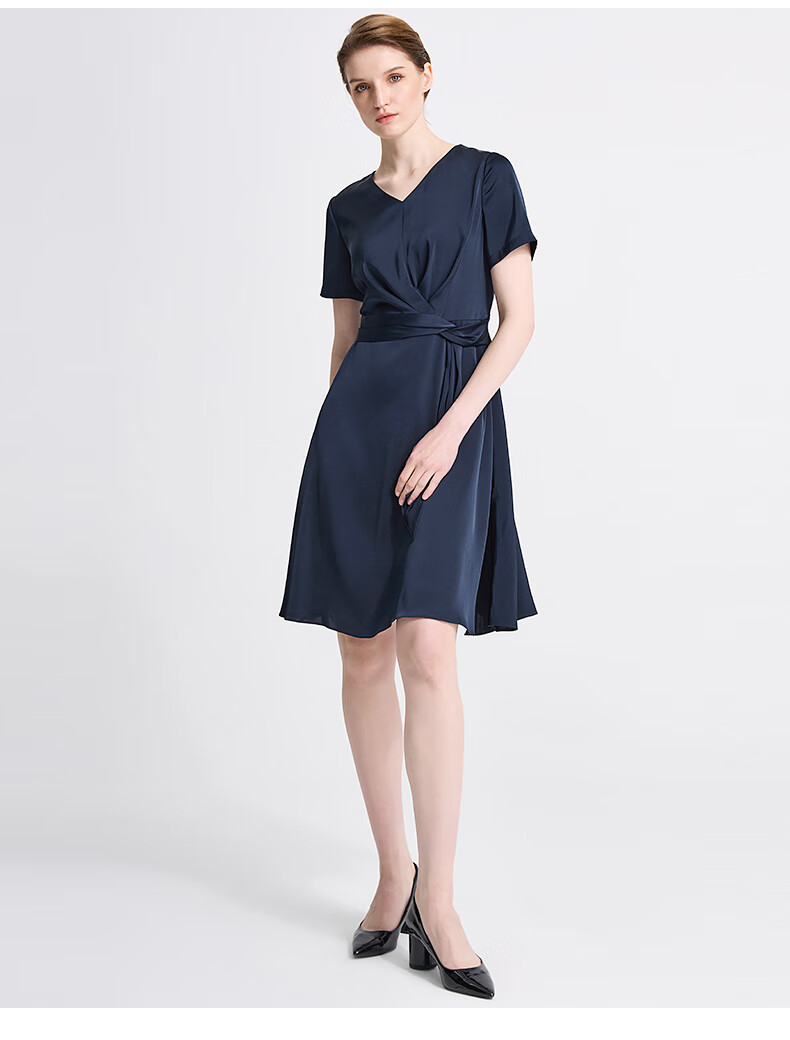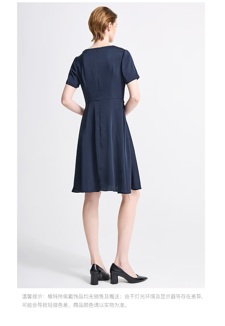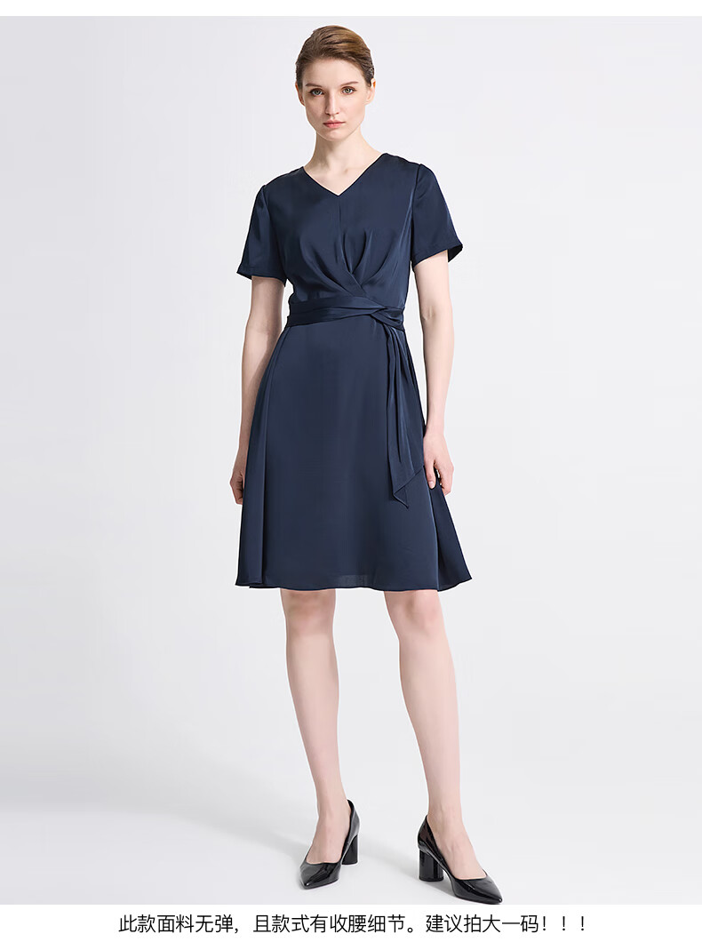皮尔卡丹女季新款蓝色短袖V领连衣裙纯色包臀裙P0217DS27N0