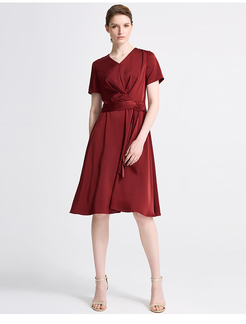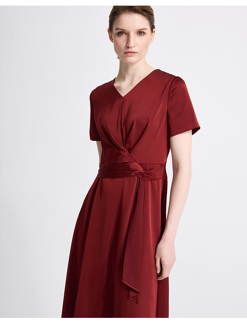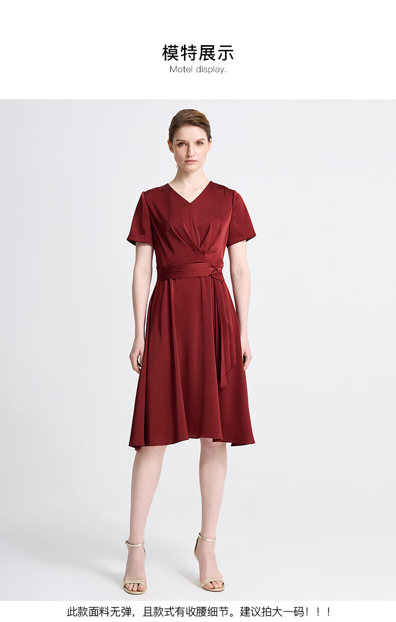 皮尔卡丹女秋季新款酒红色V领长袖连衣裙花边蕾丝裙P94DL02T0