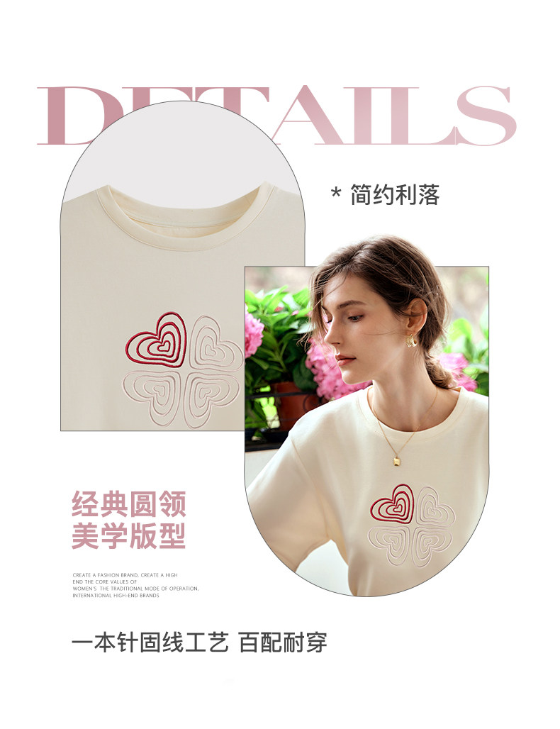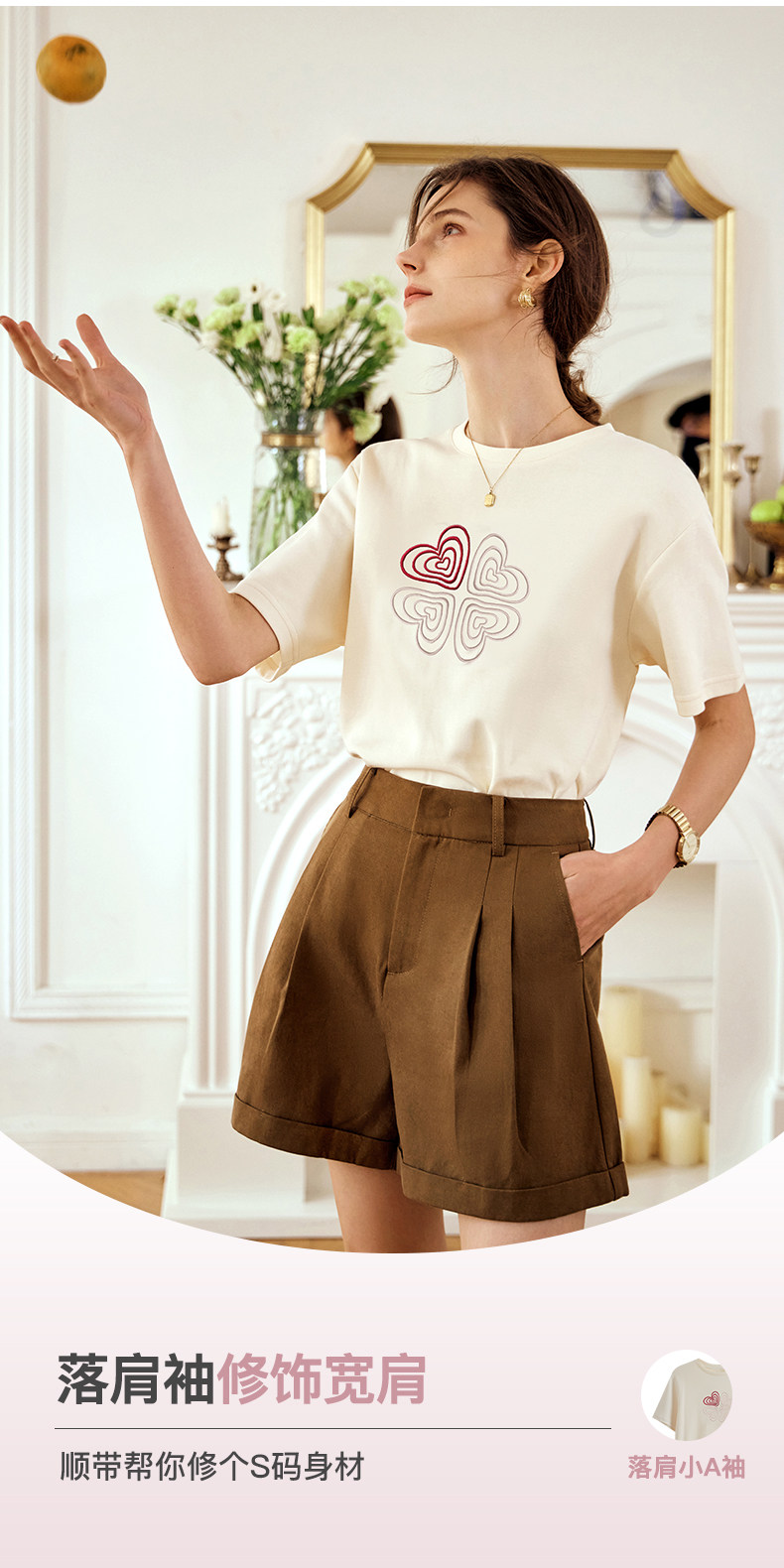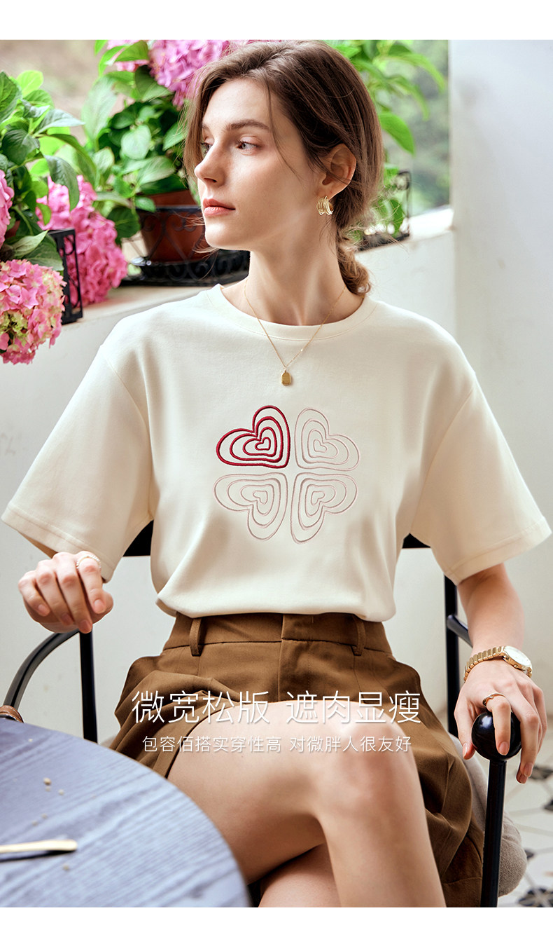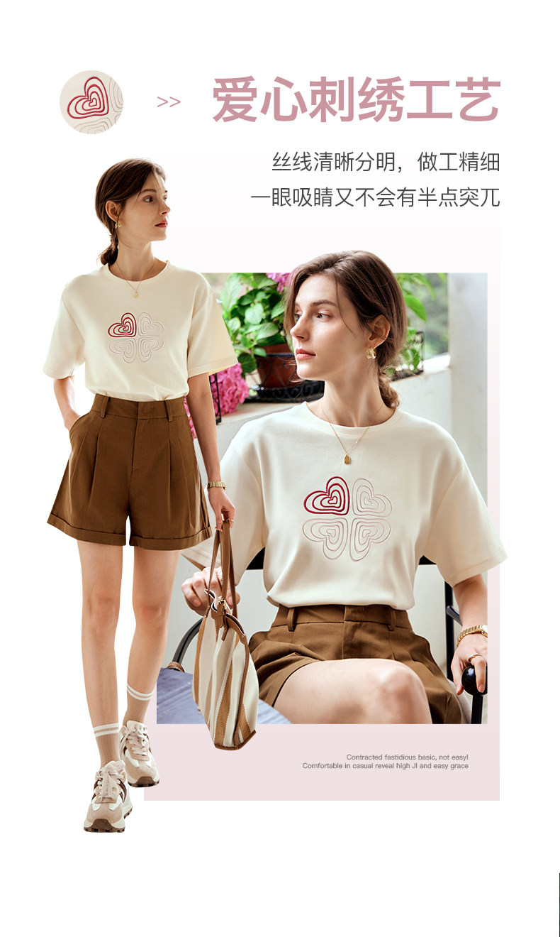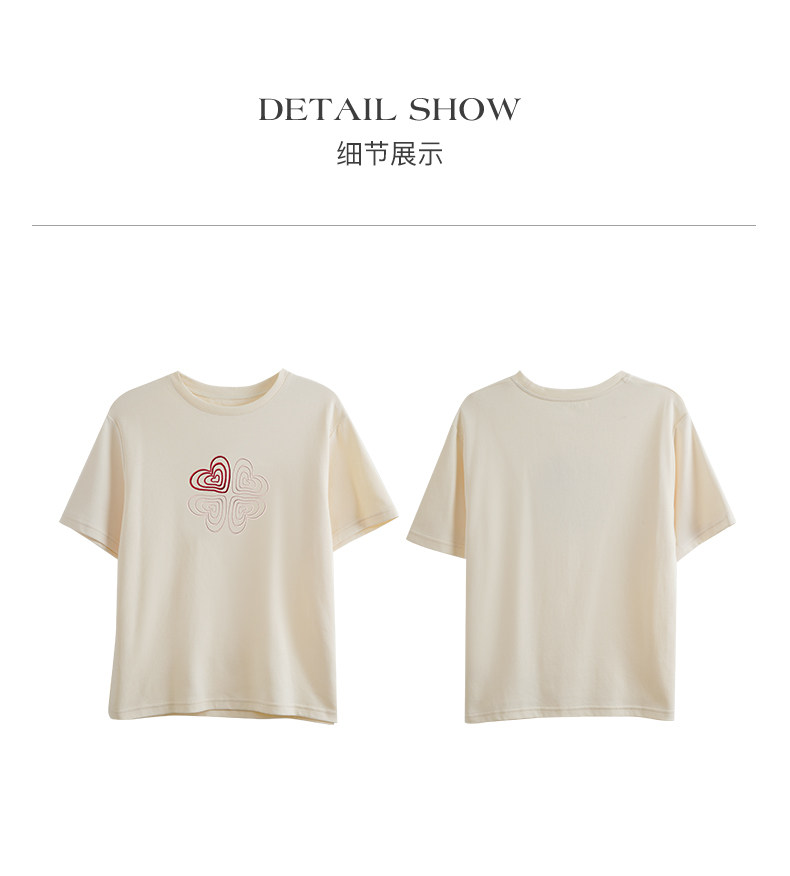 欧芮儿法式杏色短袖爱心刺绣T恤女夏季2024新款圆领气质上衣体恤