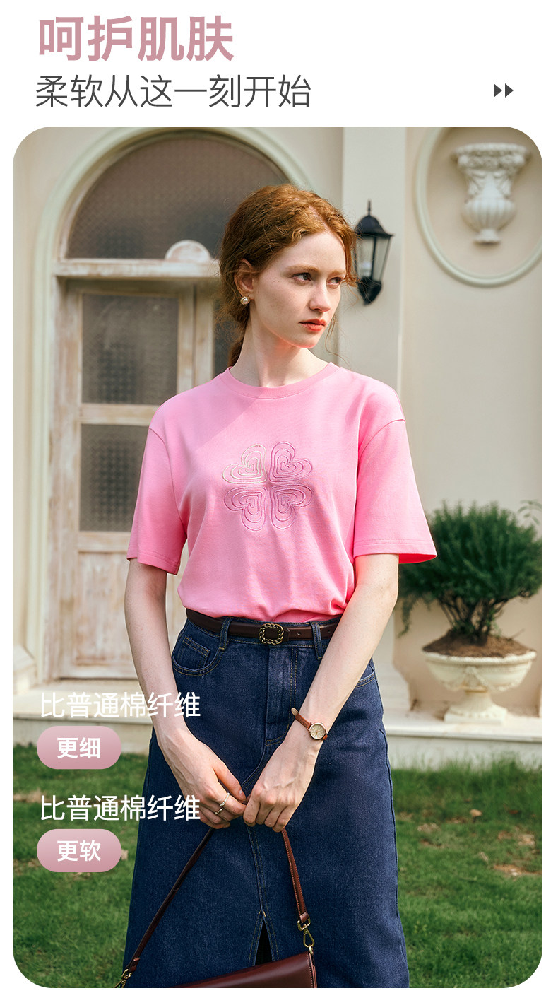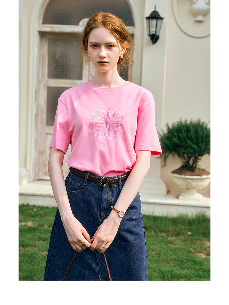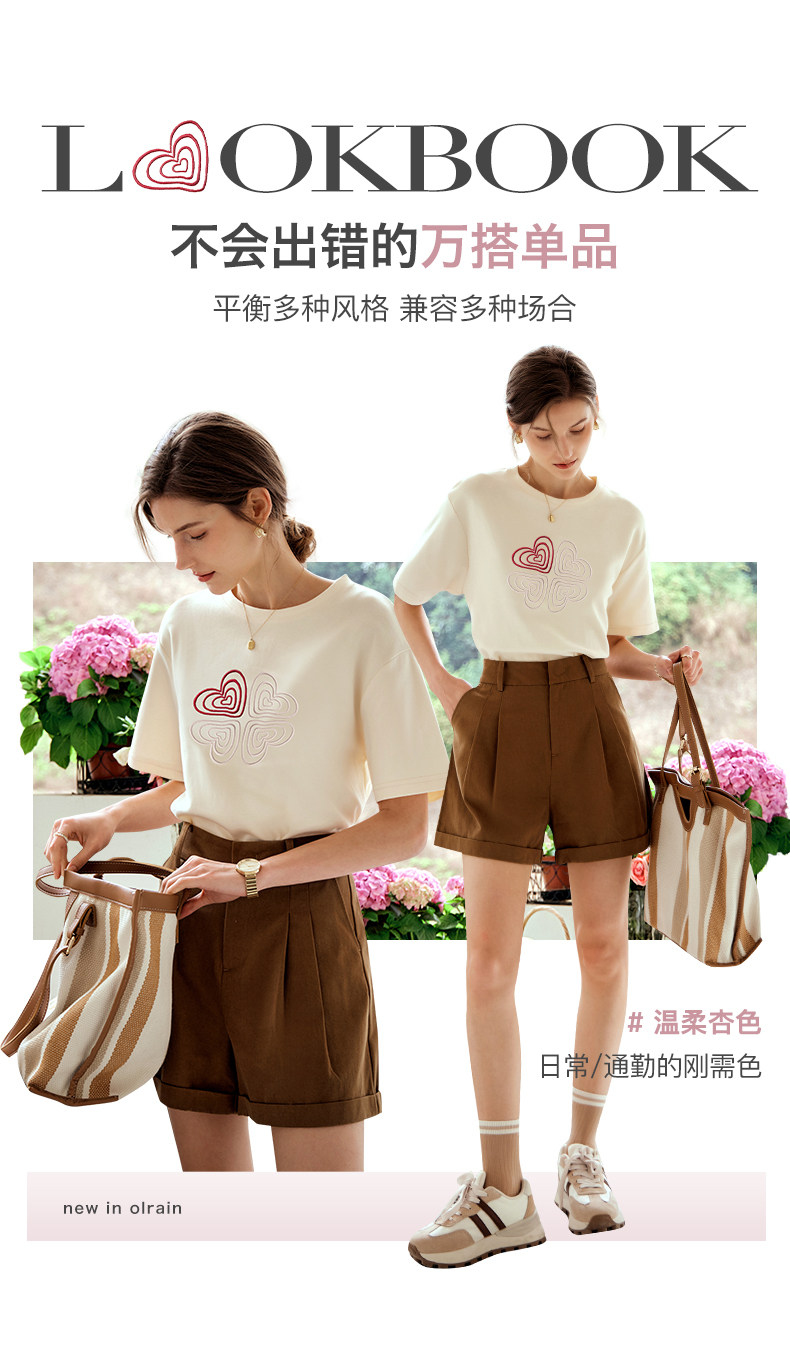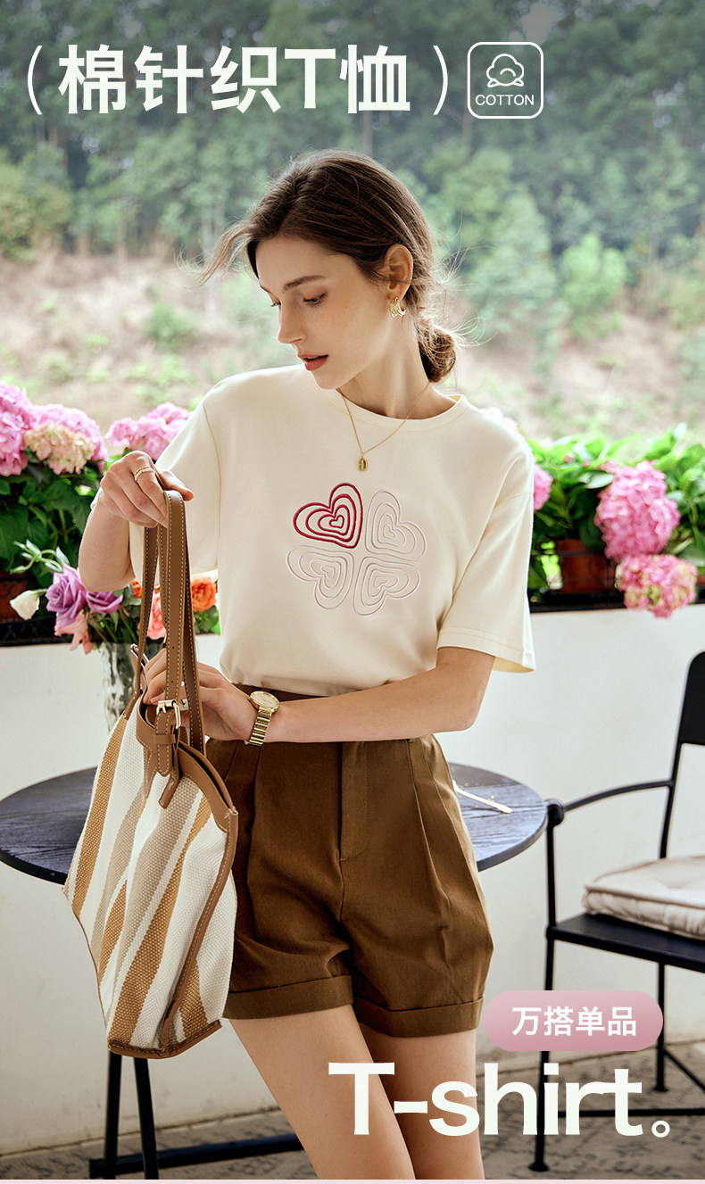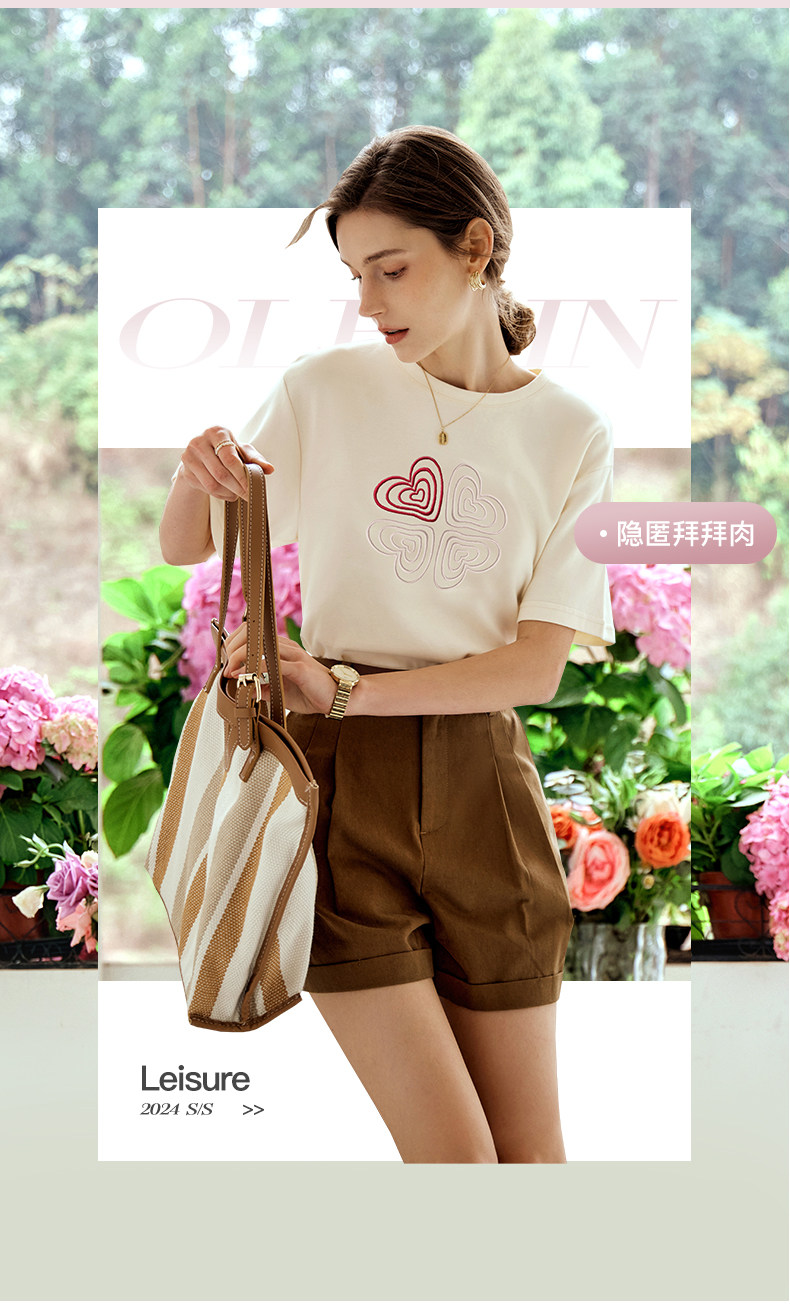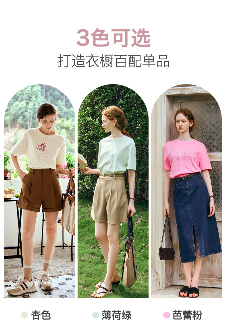 欧芮儿法式杏色短袖爱心刺绣T恤女夏季2024新款圆领气质上衣体恤