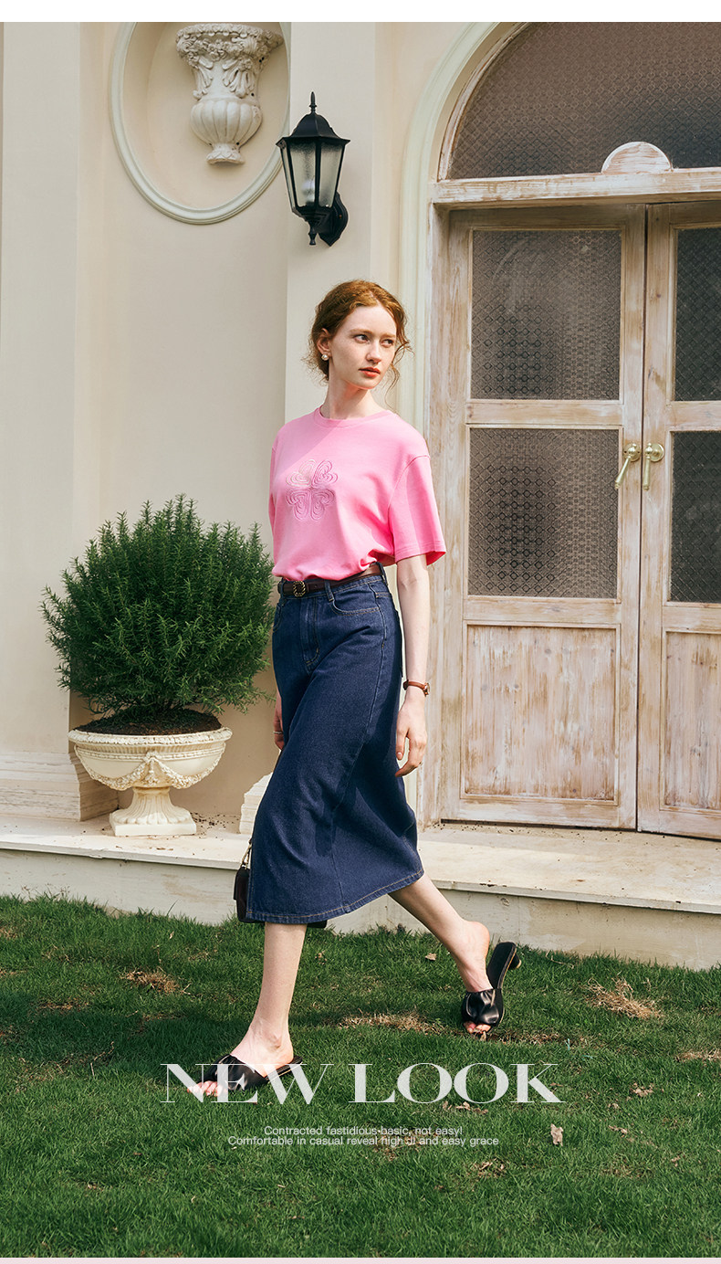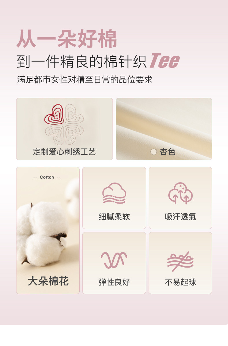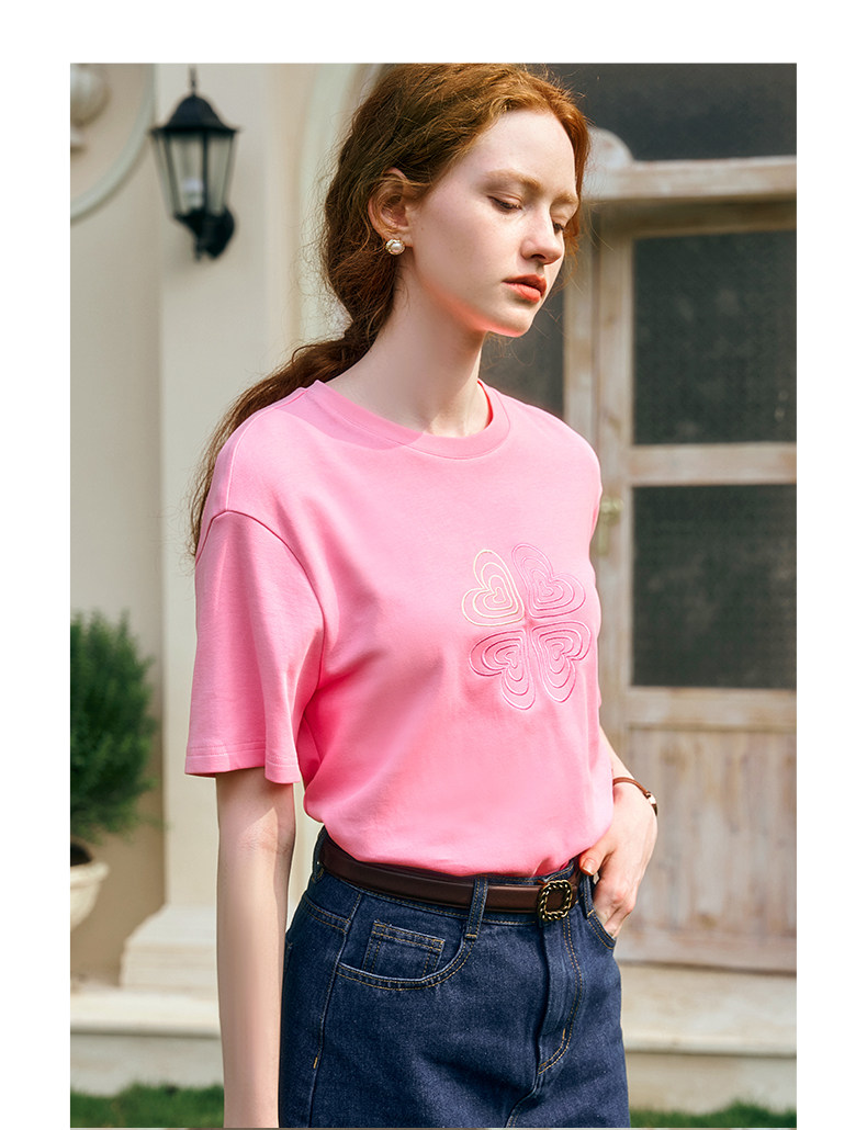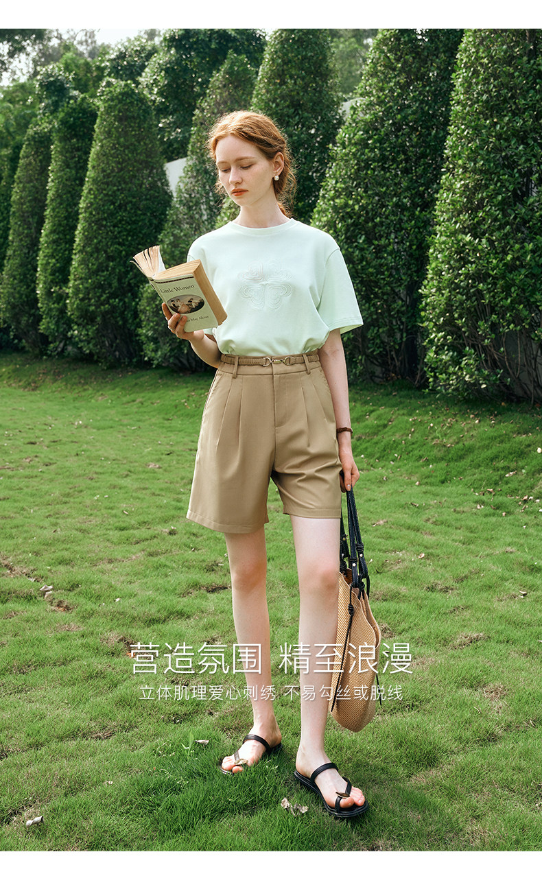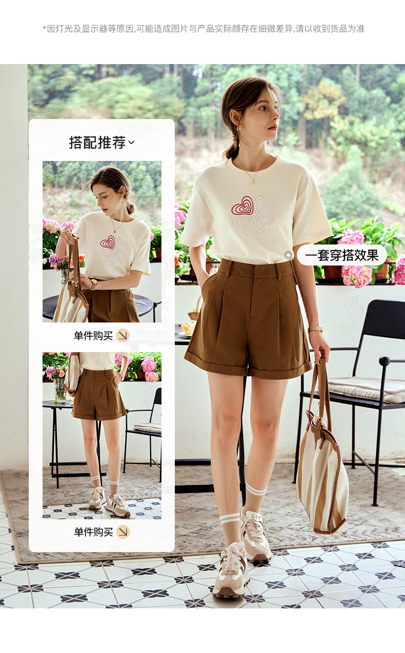 欧芮儿法式杏色短袖爱心刺绣T恤女夏季2024新款圆领气质上衣体恤