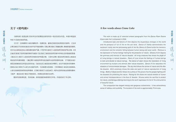 《引子・沧海桑田》表现鸿蒙初开、沧桑巨变,富饶辽阔的湿地泽国生机盎然;《生命之舞》展现了生命的旺盛活力和不屈不挠的精神;《鹤之舞》描绘了翩翩起舞、婀娜多姿的群鹤,它们与大地构成天地人禽浪漫的谐和气象;《守护神》描述了人类对自然万物的护佑之情;《恶之幽灵》刻画了自然灾难的狰狞与威胁;《生灵逃亡》体现出在自然灾难中所有生灵所面临的困境;《爱之诗》叙述了人类对自然万物的呵护热爱之情;《劳作之舞》展示自然灾难后人类及动物对生存环境的修复;《魔之舞》阐释自然界与社会破坏大自然的各种灾难;《干涸的大地》描写灾难摧残后自然及生灵的悲哀;《诞生仪式》展现了生物自然繁衍,生生不息的状态和精神;《善恶之战》描绘了人类与生灵保护自然,与灾难搏斗的场面;《生死离别》表现在灾难面前,人类与动物相互依存的自然情感;《涅槃》歌颂了人类为保卫、呵护大自然所做出的牺牲精神;《尾声・春回大地》突显了勃勃生机、充满阳光的美好大自然。