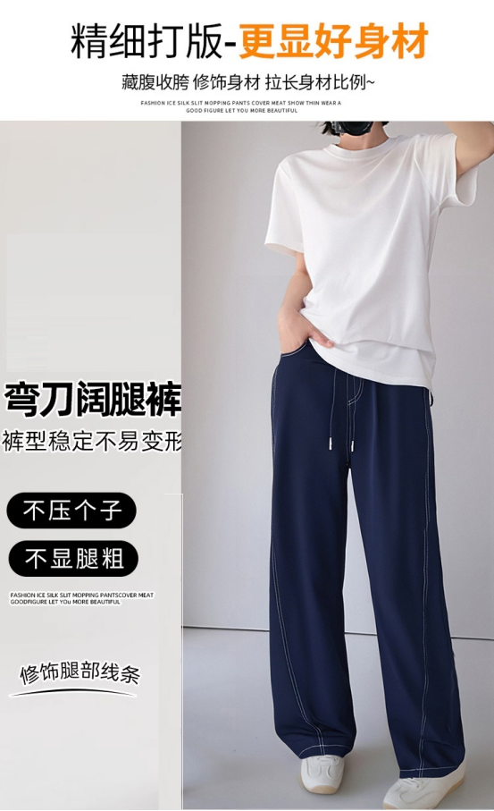 ◾️面料 : 它不仅凉爽舒适,还能轻松遮肉显瘦,搭配起来更是毫不费力,每个女生都值得拥有! 冰丝弯刀裤的触感堪称“夏日利器”,它轻薄舒适,有着令人惊叹的透气性。 穿上它的那一刻,仿佛被云朵环绕,无论是户外的烈日炙烤,还是室内的空调冷风,它都能从容应对,让你在高温天里轻松享受“冰凉自由”。