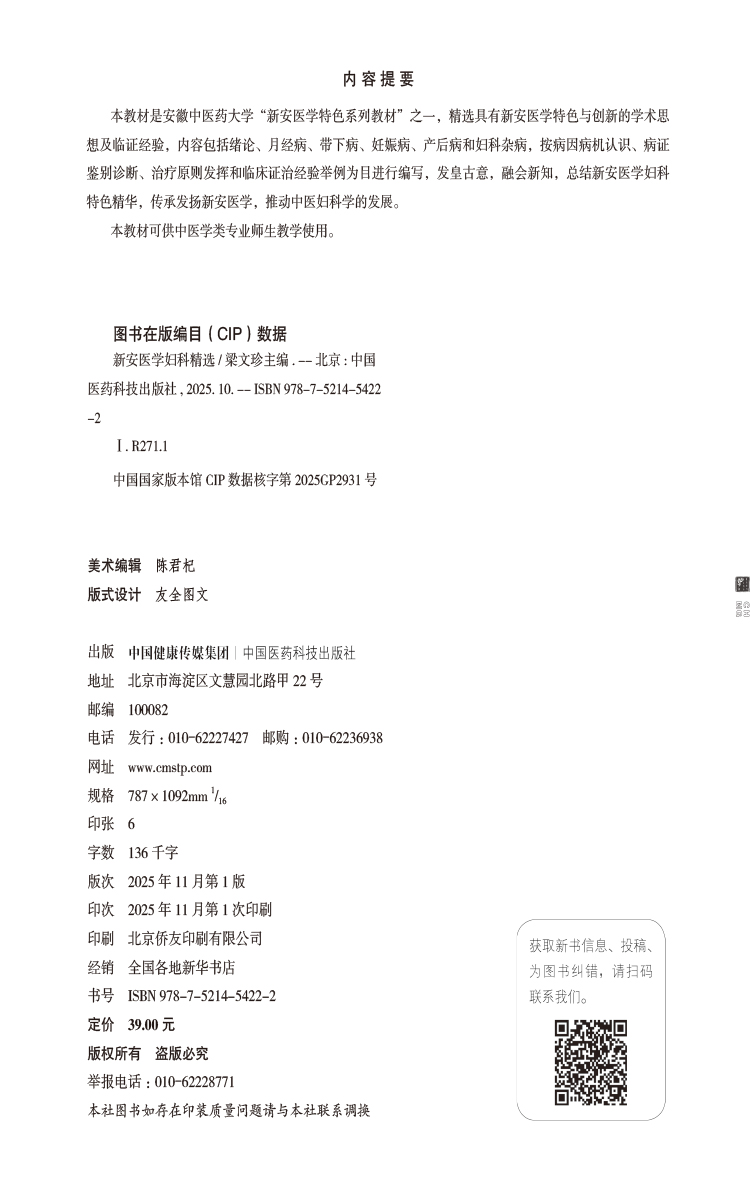 书名:新安医学妇科精选(新安医学特色系列教材)