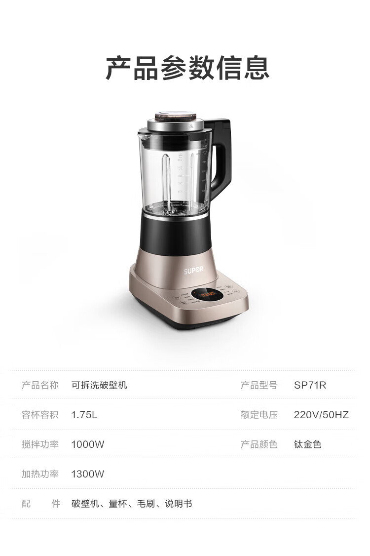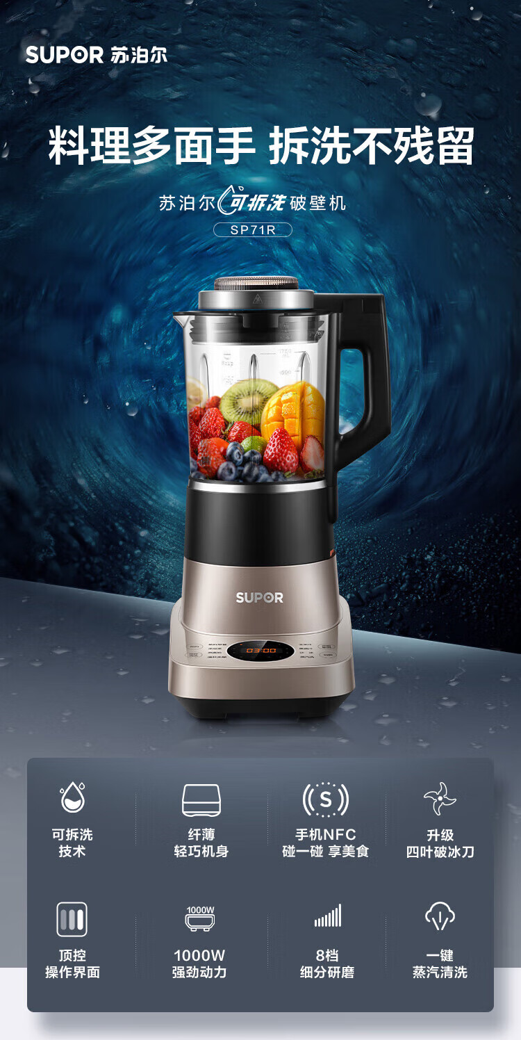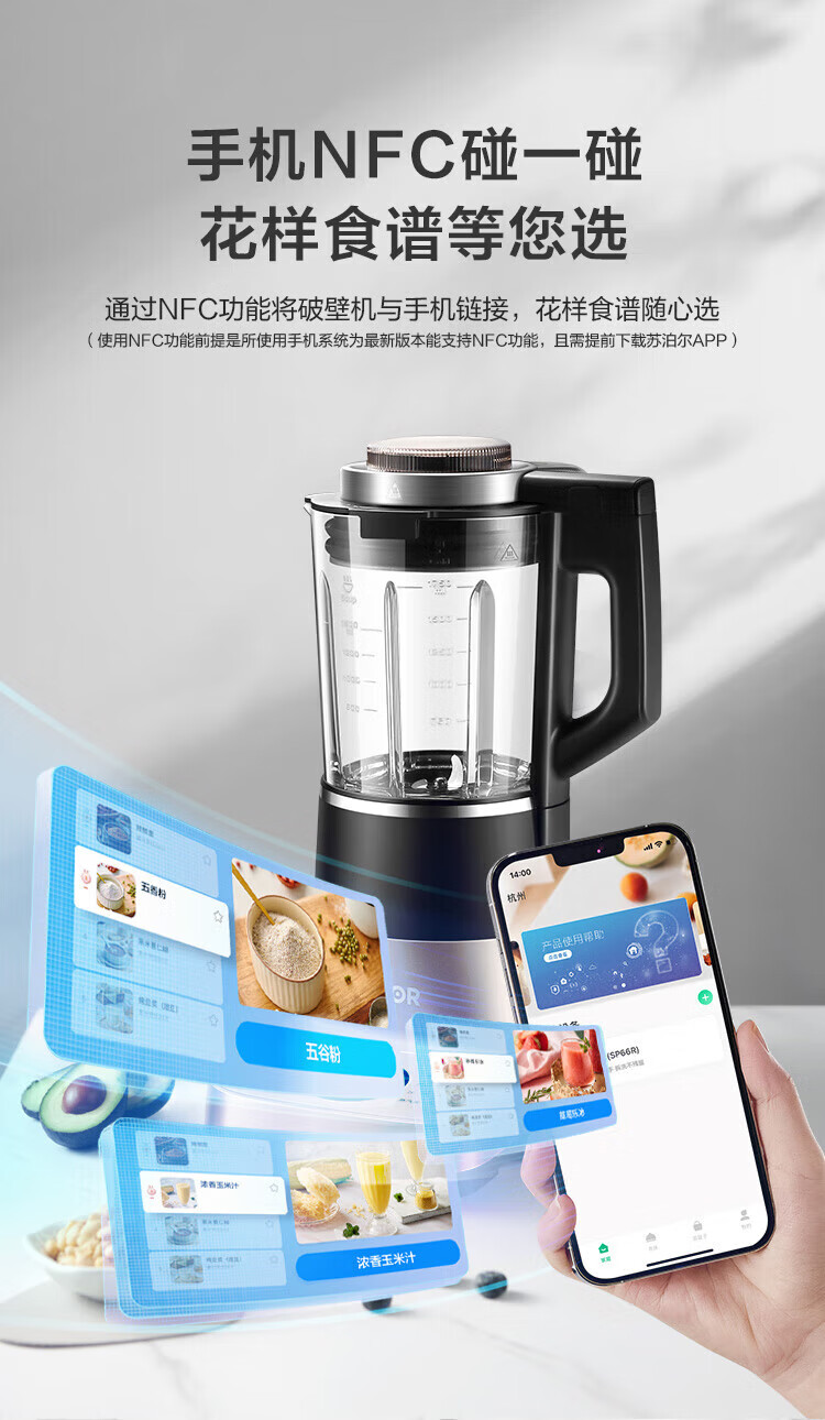 苏泊尔(SUPOR)轻音可拆洗破壁机蒸汽清洗多功能加热料理机豆浆机果汁辅食机超薄 SP71R 【1.75L NFC功能支持 】