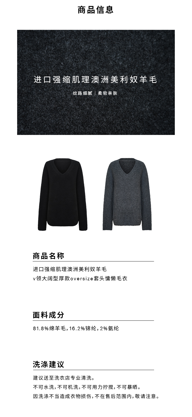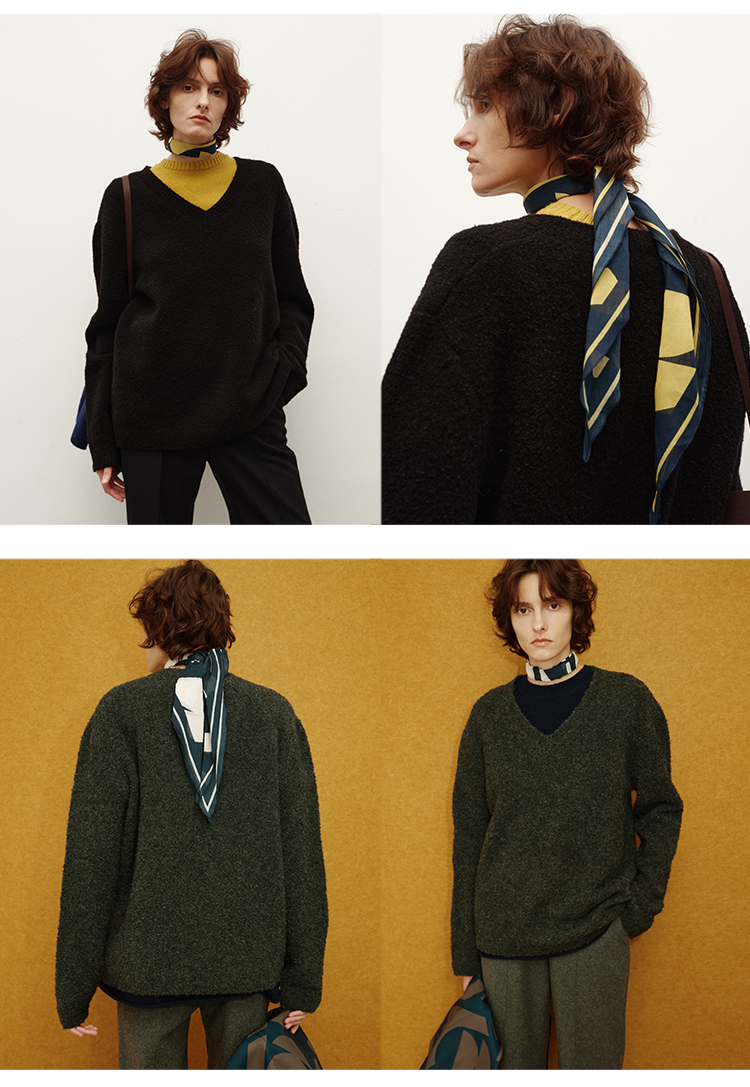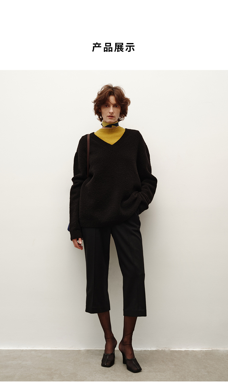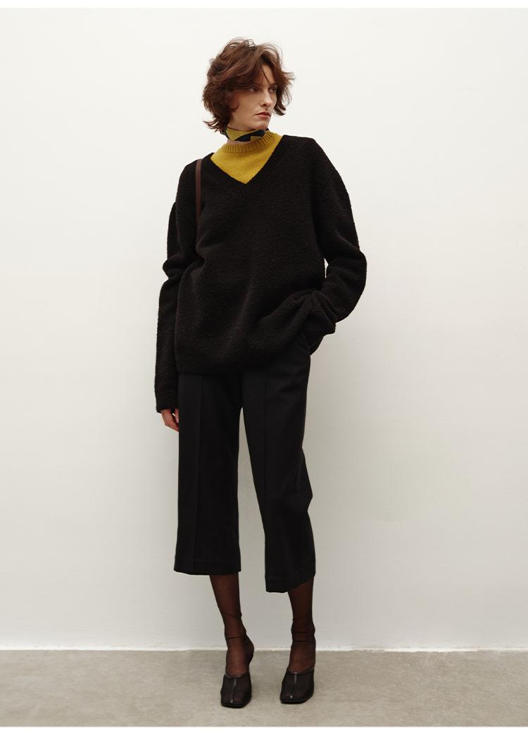 HIDEMI 进口强缩肌理澳洲美利奴羊毛v领大阔型厚款oversize套头慵懒毛衣