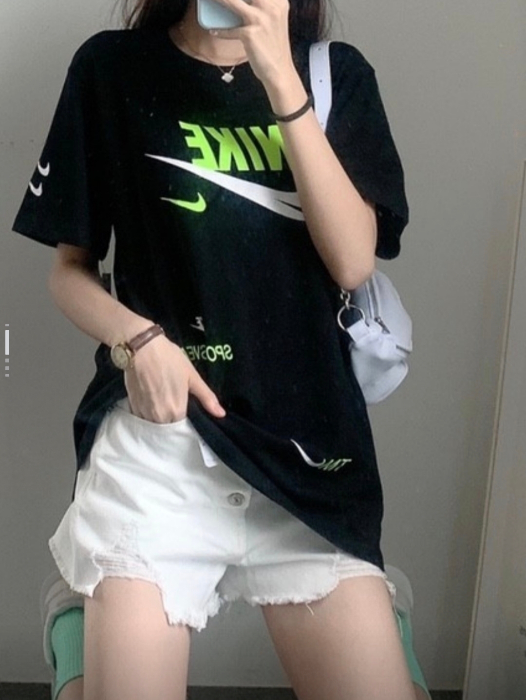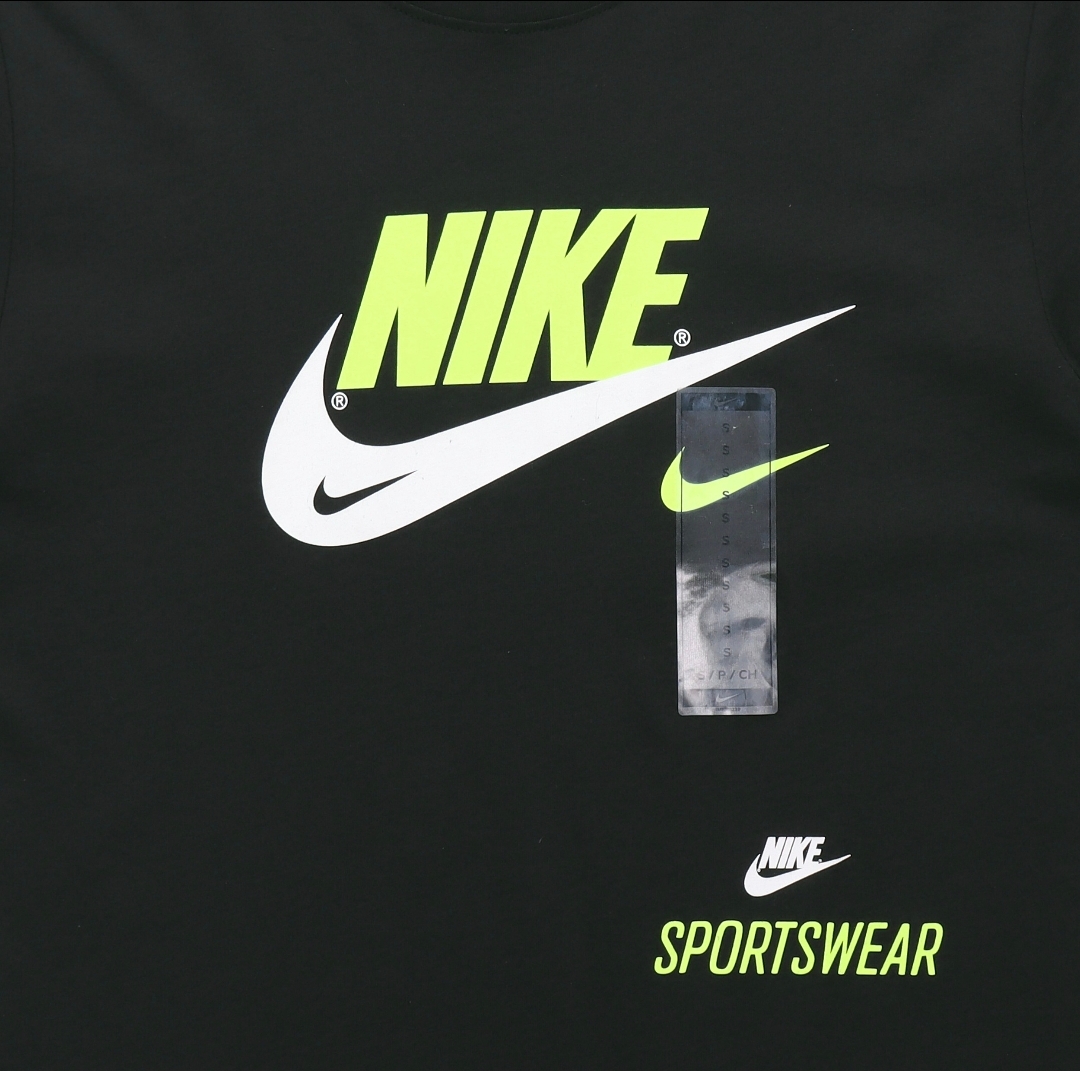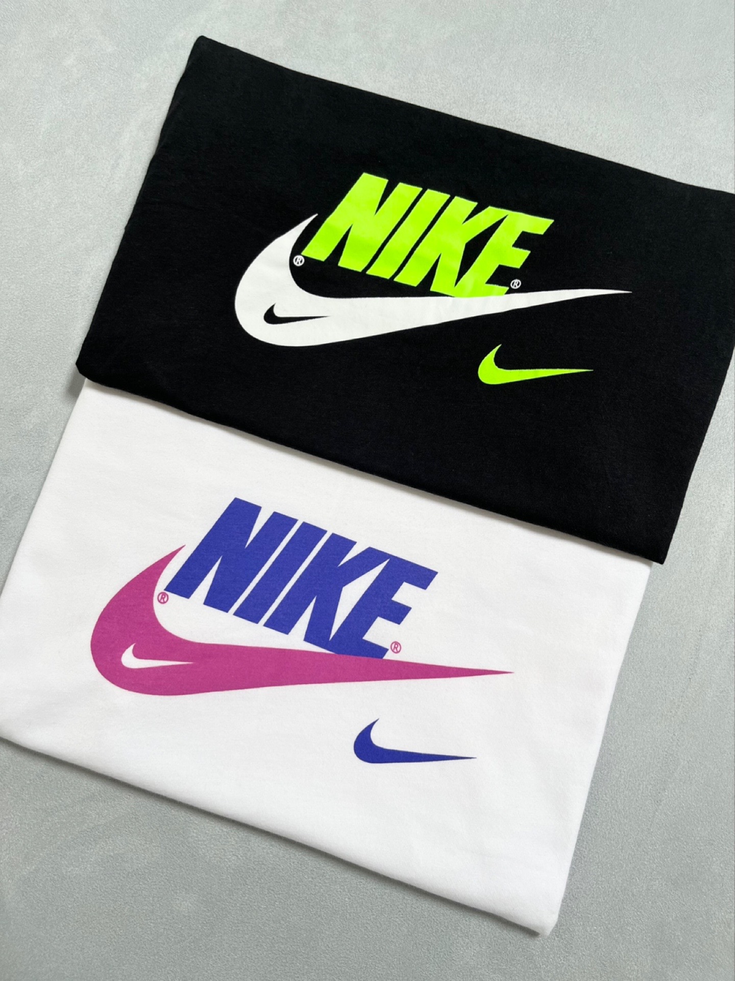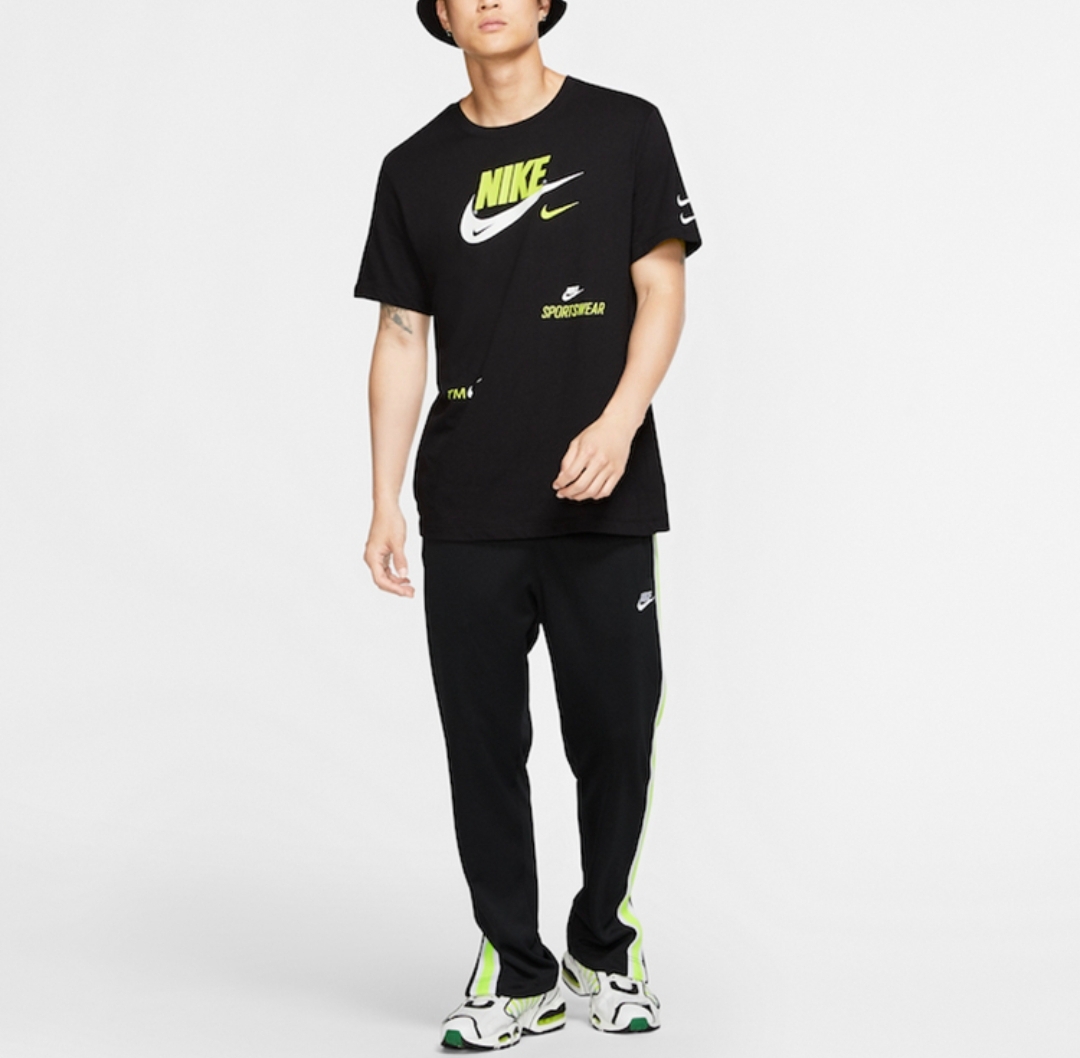 这款Nike短袖,刚好一黑一白两色,拿作情侣款相当合适。品牌标志的颜色一翠绿一玫红,挺亮眼👀的,是夏日的潮流色系。