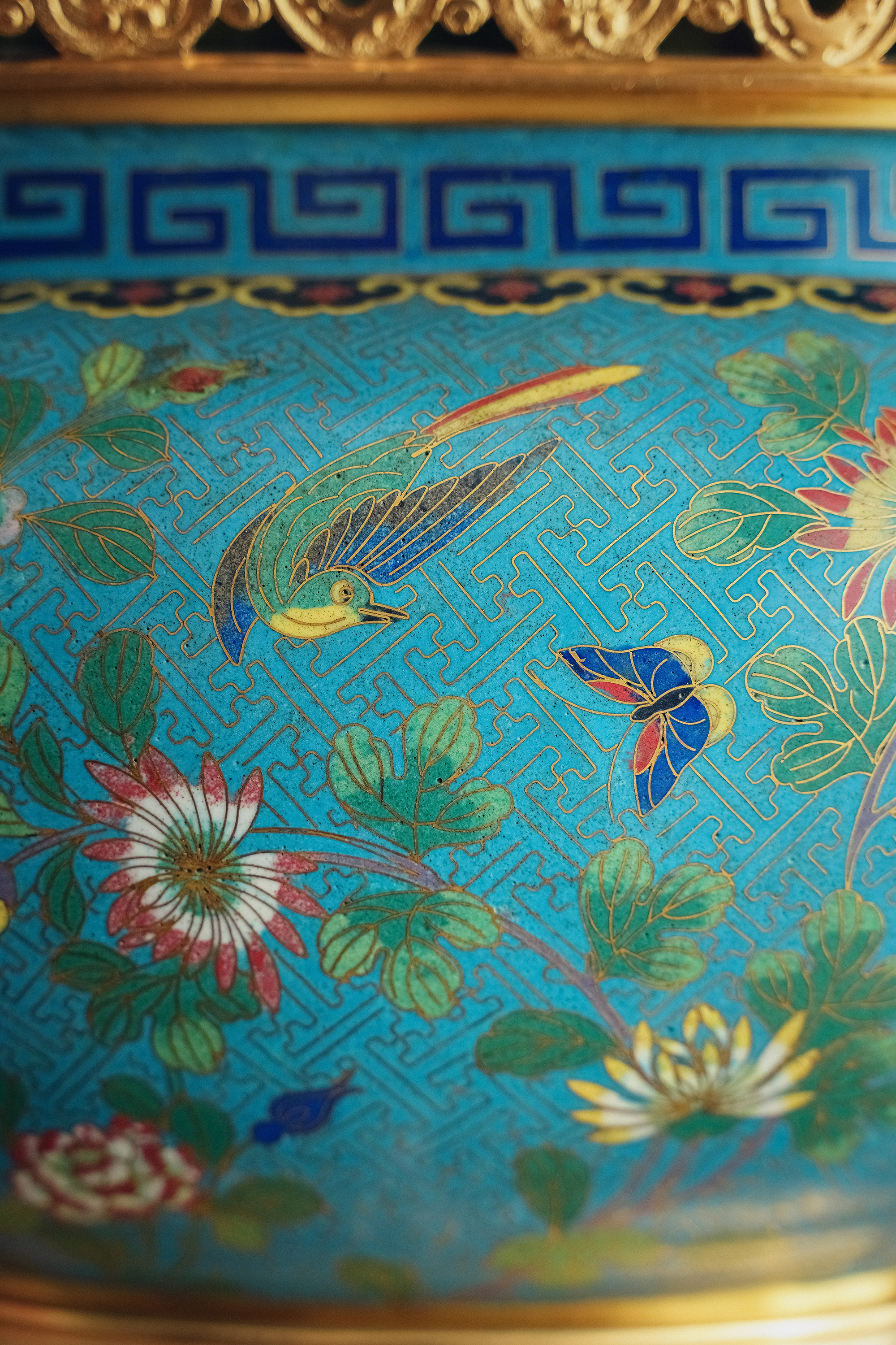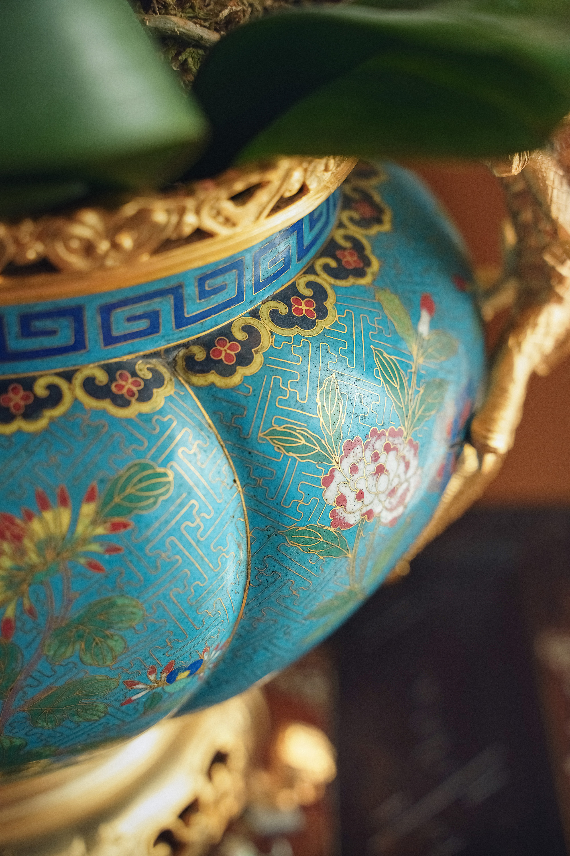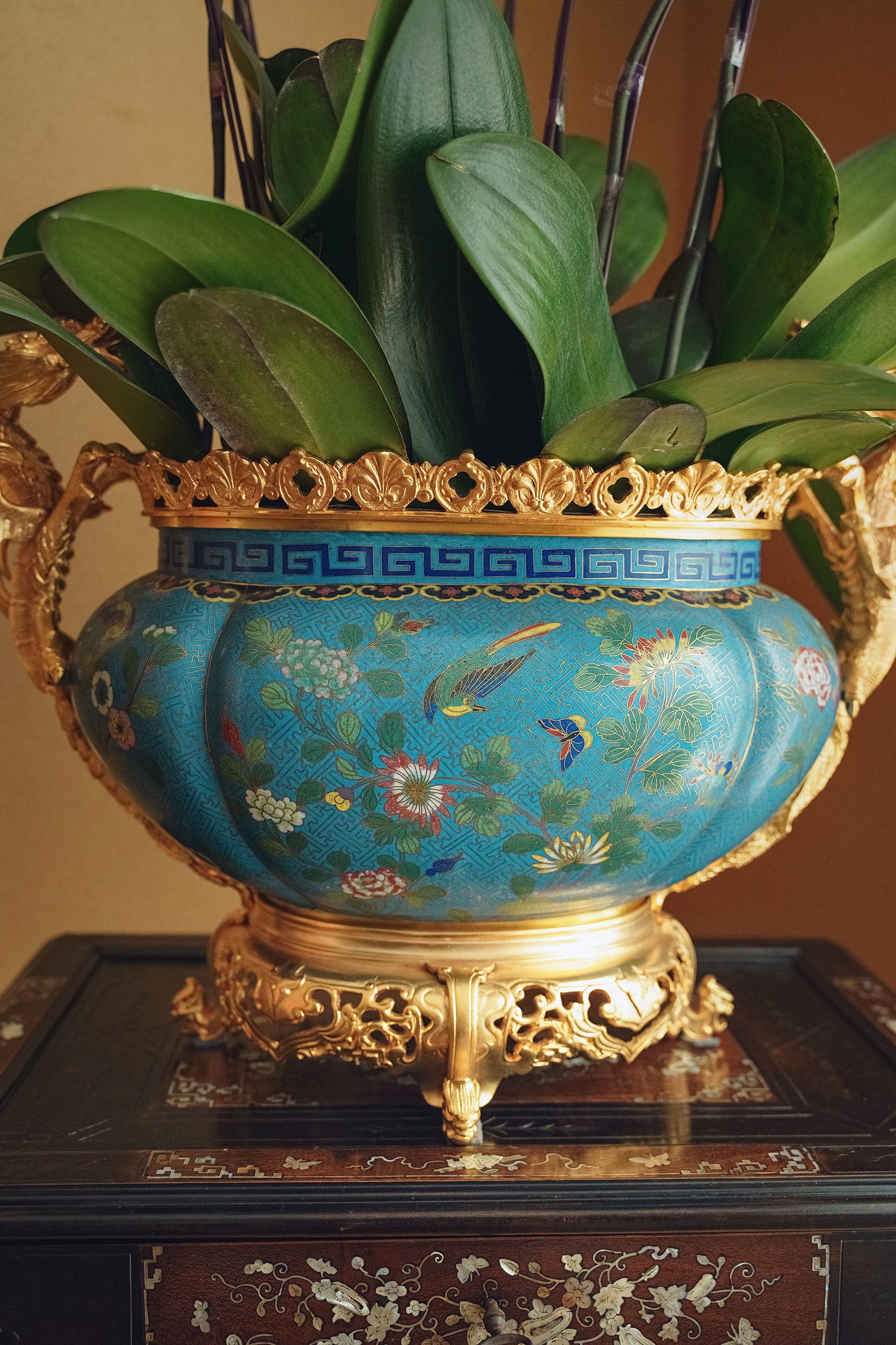 19世纪末法国出品飞龙卷叶造型铜鎏金精雕镶嵌东方花鸟主题铜胎掐丝珐琅花盆套