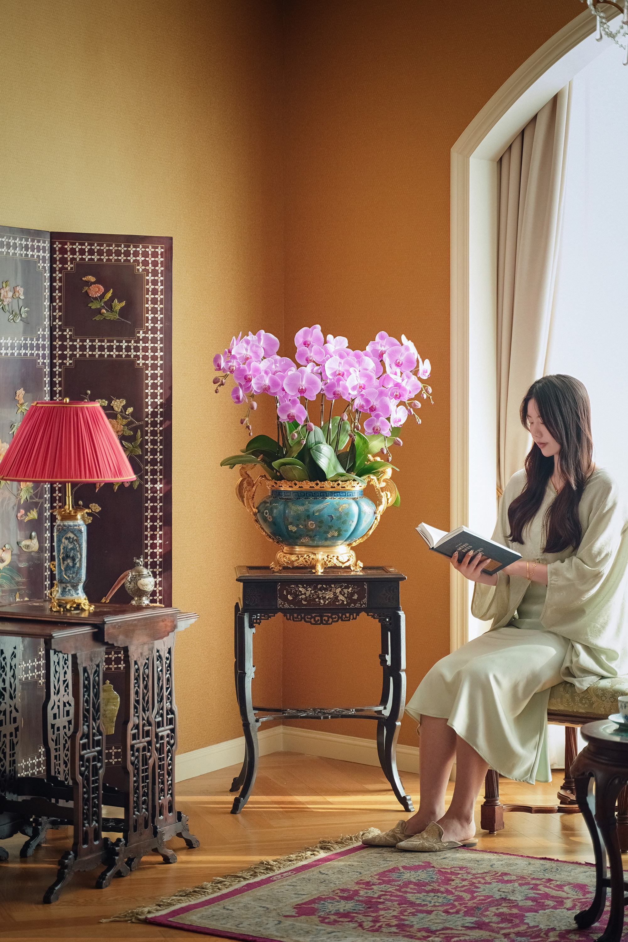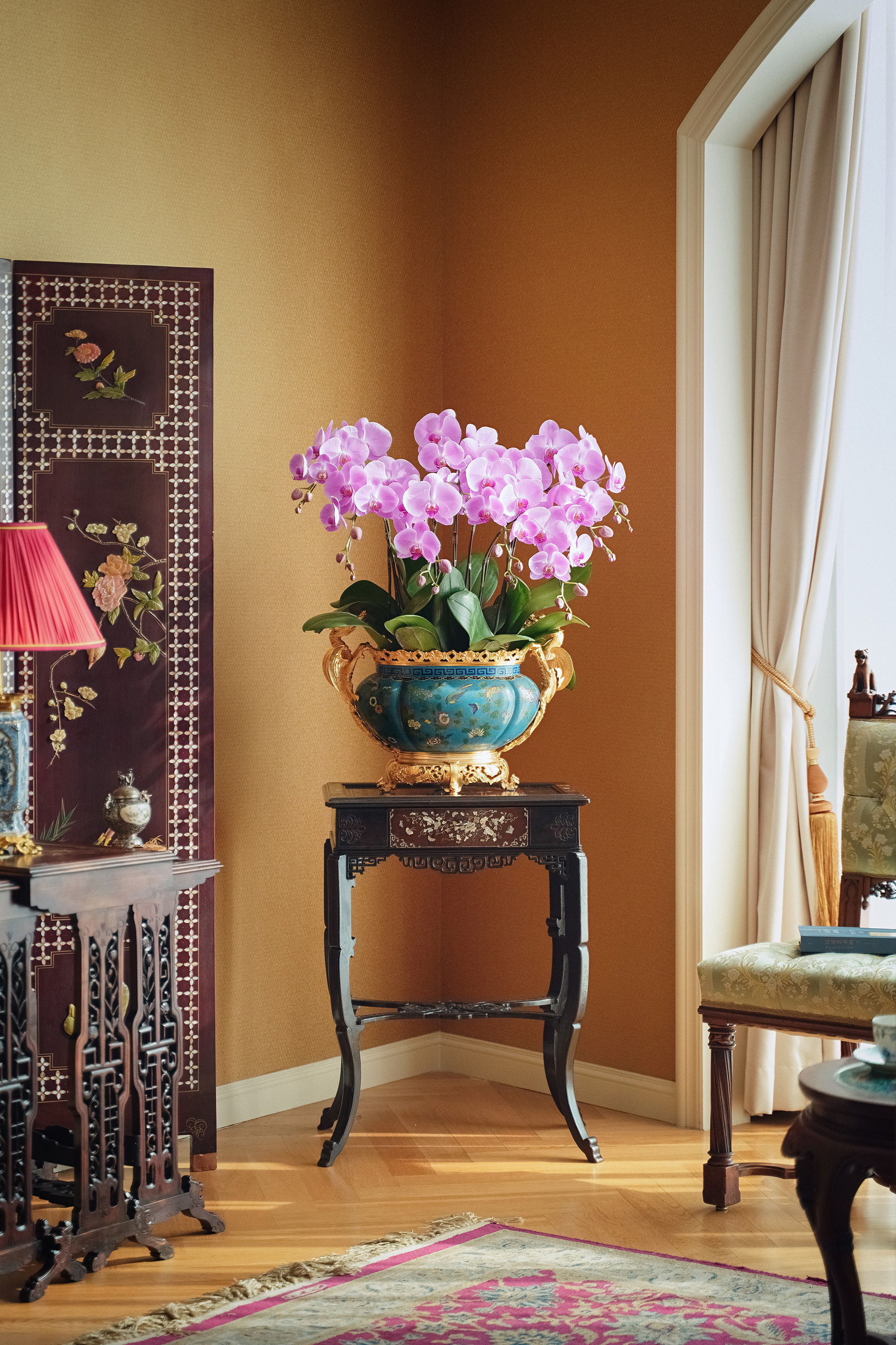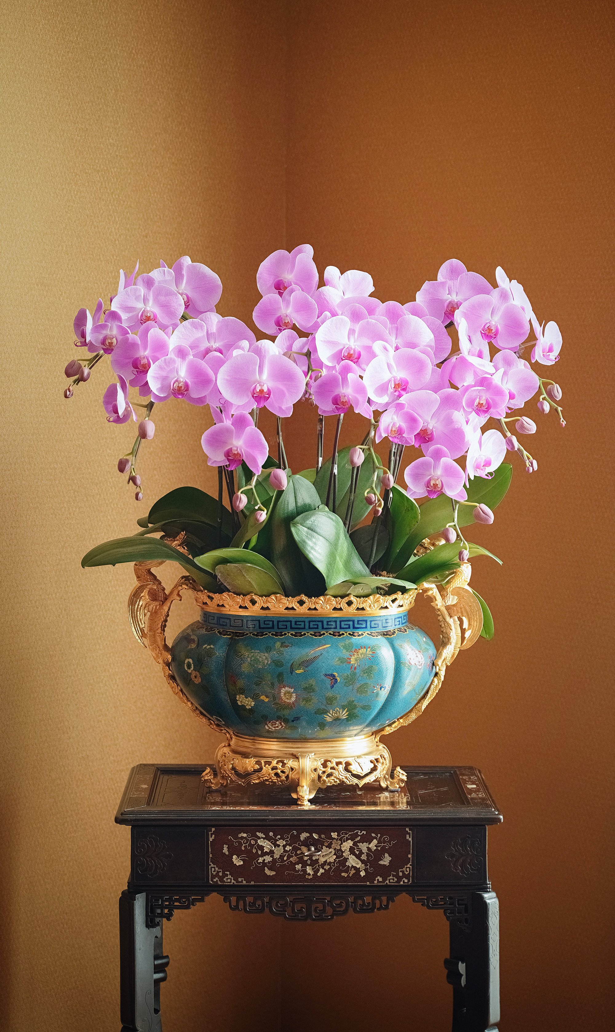 19世纪末法国出品飞龙卷叶造型铜鎏金精雕镶嵌东方花鸟主题铜胎掐丝珐琅花盆套