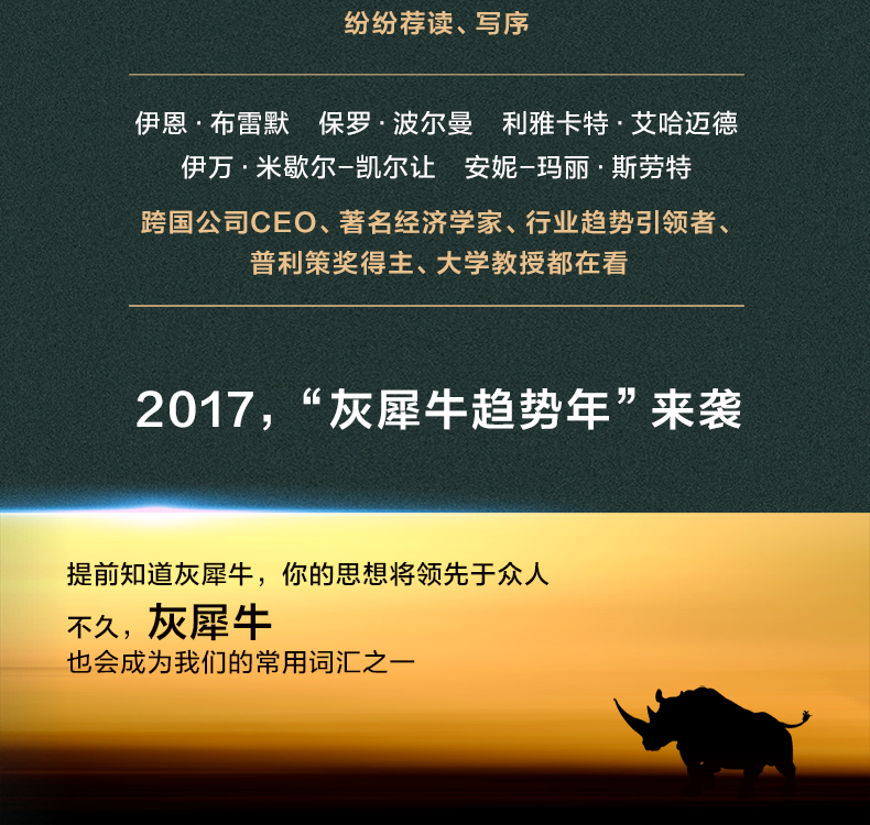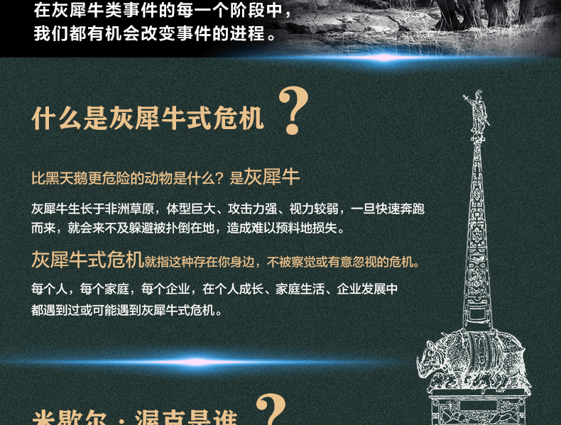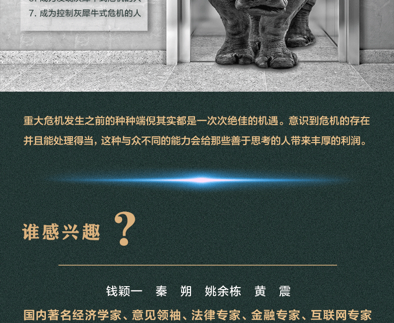 2. 《灰犀牛》是对塔勒布《黑天鹅》理论的补充及深刻延展,更契合当下混乱无序与不确定的时代。雾霾、气候变暖、饮用水短缺、金融危机以及科技的革新带来的巨大颠覆性力量……这些是与我们每个人息息相关的灰犀牛事件,在危机爆发之前,有迹象显现,而为什么我们往往忽视这些信号?如何克服偏见、惰性以及侥幸心理,对潜在的大概率危机进行有效识别和有决断力地应对?《灰犀牛》给我们提供了很多有用的建议。