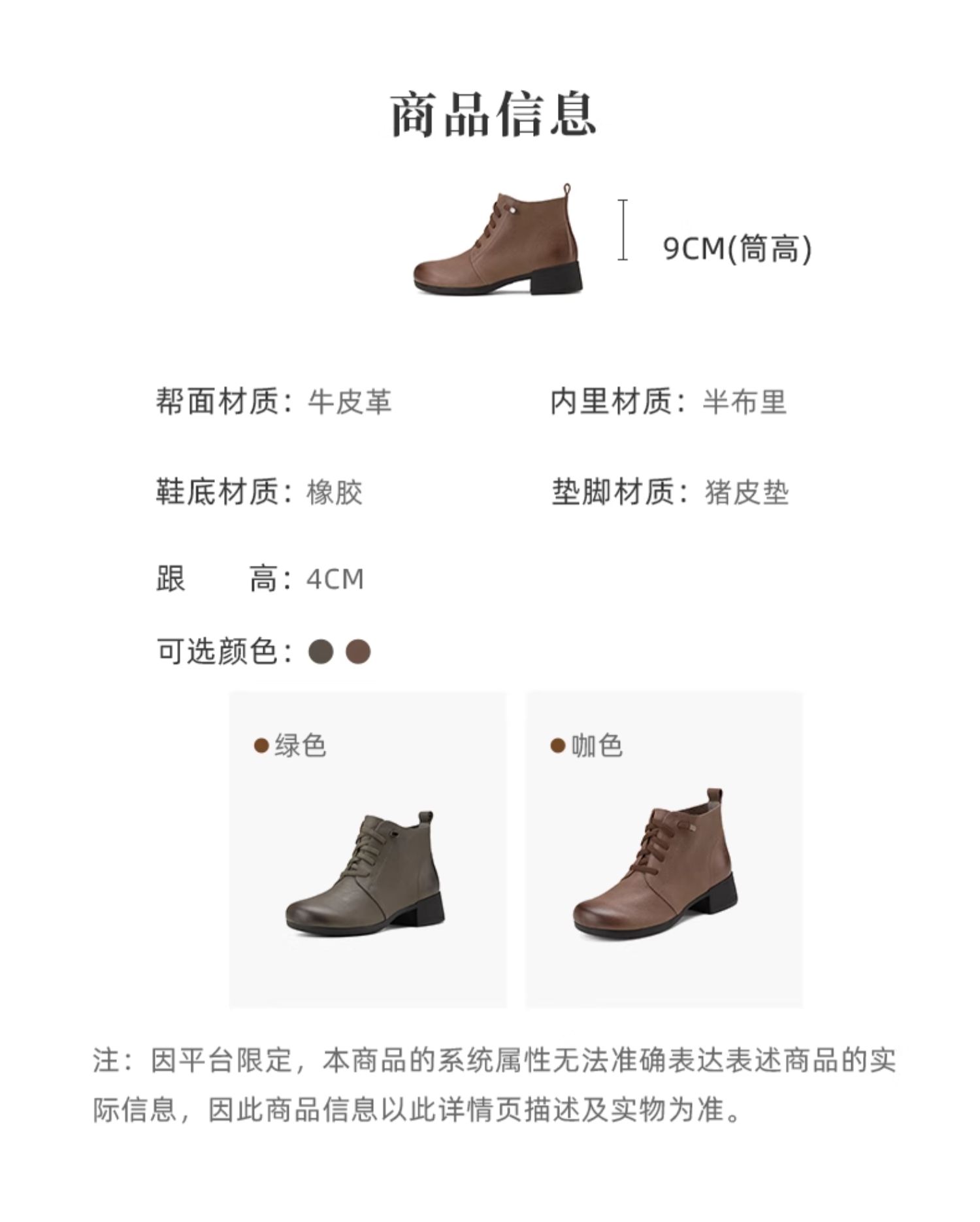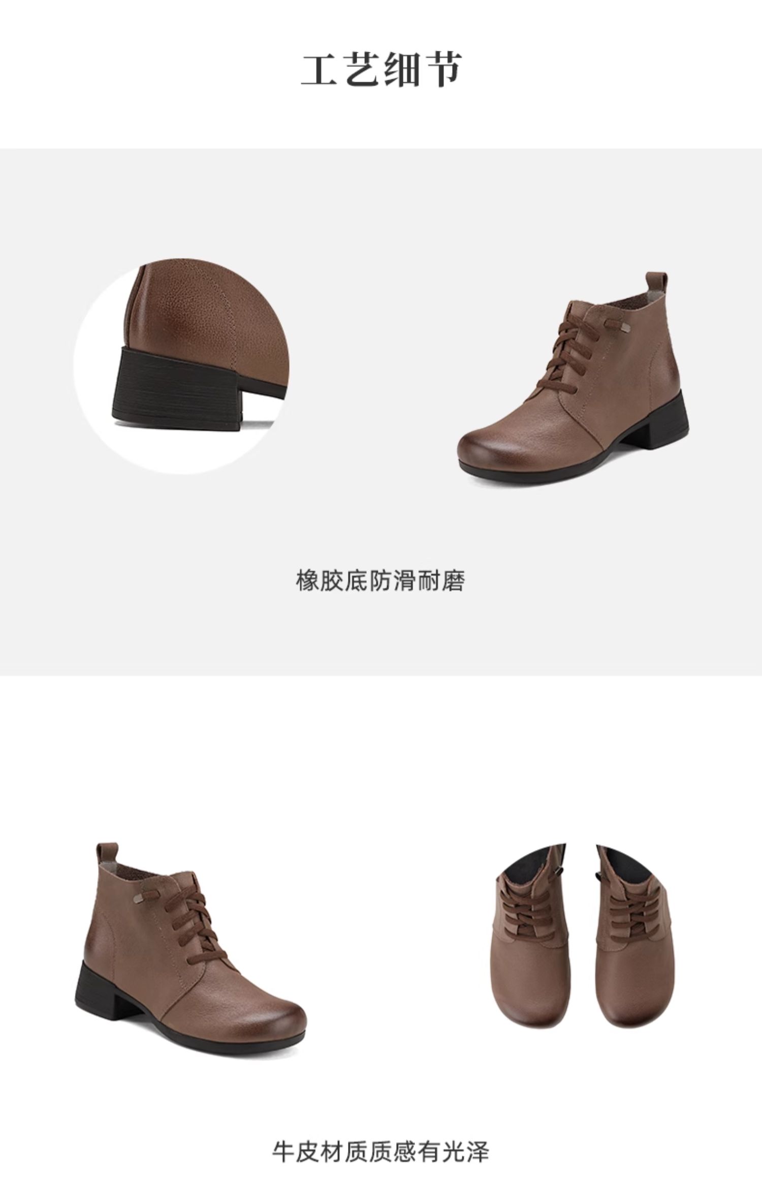 西村名物2024秋冬新款软底真皮粗跟圆头舒适系带短靴女休闲时装靴X24DS47711