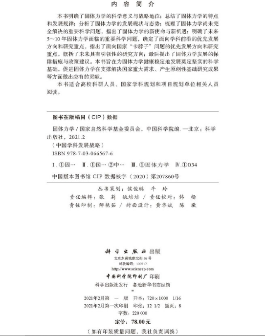 《固体力学》明确了固体力学的科学意义与战略地位;总结了固体力学的特点和发展规律;分析了固体力学的发展现状与态势;梳理了固体力学尚未完全解决的重要科学问题,指出了固体力学的新使命与新机遇;明确了未来5~10年固体力学面临的重要科学问题,确定了面向学科前沿的优先发展方向和研究重点,指出了面向*“卡脖子”问题的优先发展方向和研究重点,概括了未来具有引领性的研究方向;*后提出了固体力学发展的保障措施与政策建议。《固体力学》旨在为固体力学健康稳定地发展奠定坚实的科学基础,促进固体力学在支撑解决*重大需求、产生原创性基础研究成果等方面做出应有的贡献。