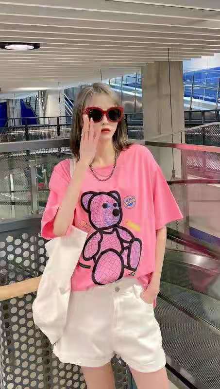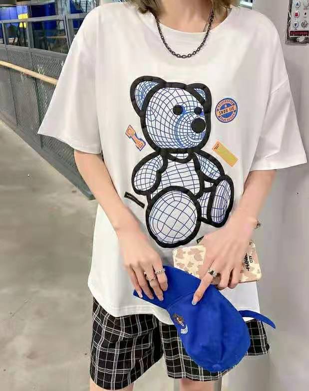 04662769凹凸小熊体桖,均码号,100-140斤都可以穿,粉.黑.白,以白色为主,18-28岁都可以穿,面料柔弱,以棉为主,穿着舒适,裤子,群子都可以,百搭款。