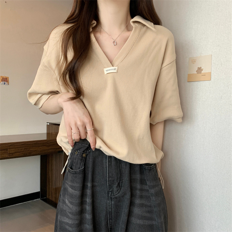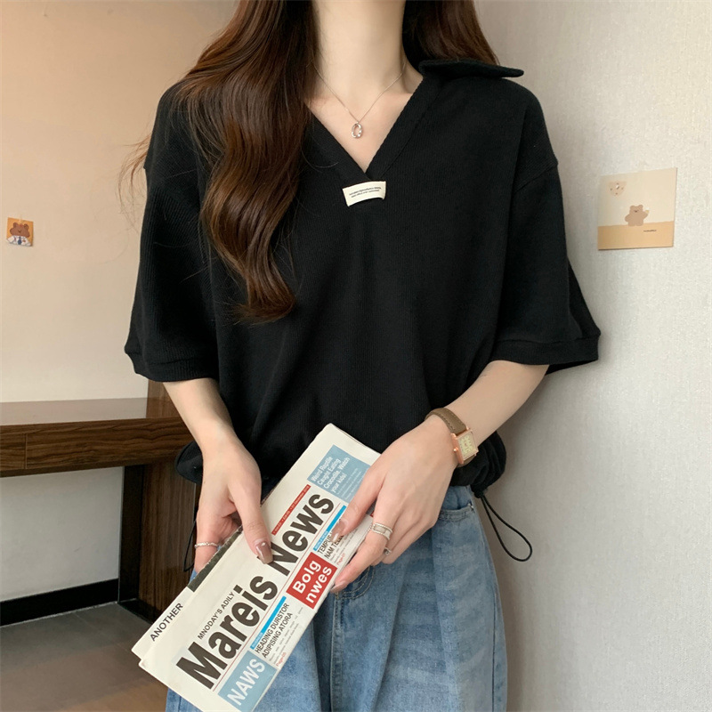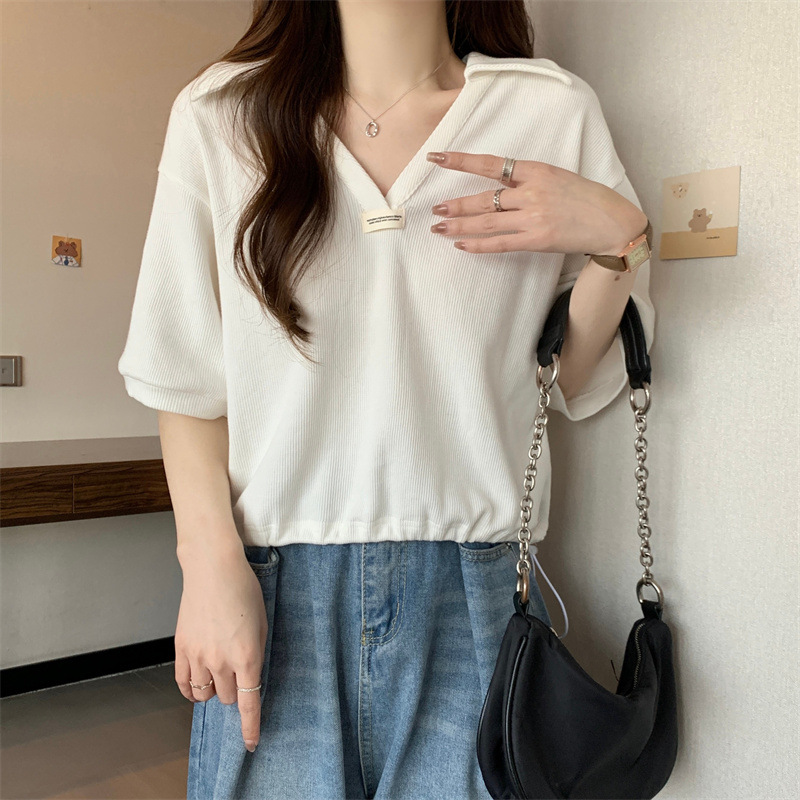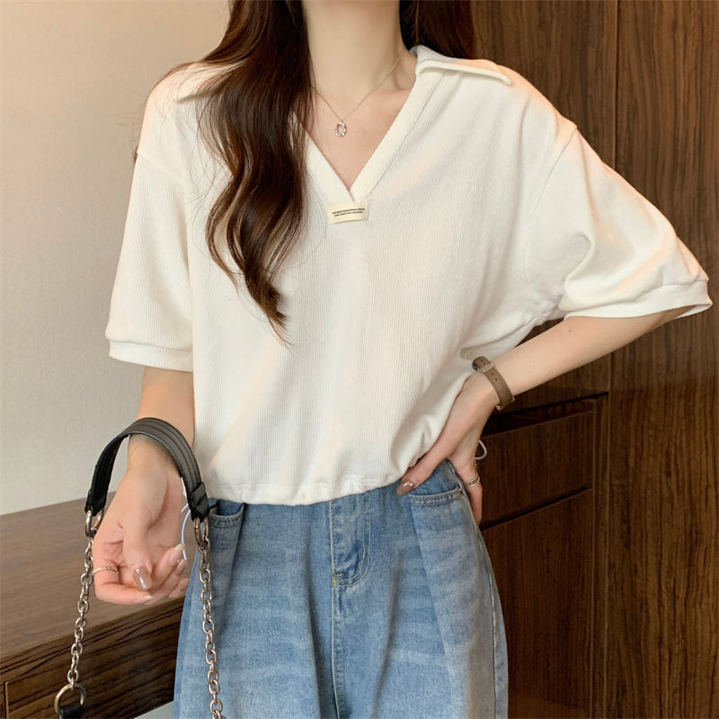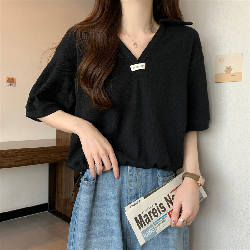 POLO领短袖T恤女夏ins潮宽松显瘦洋气减龄小个子短款V领半袖上衣