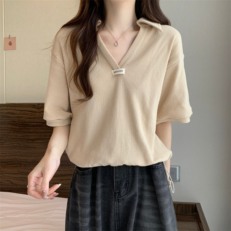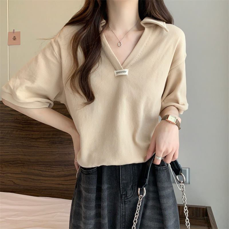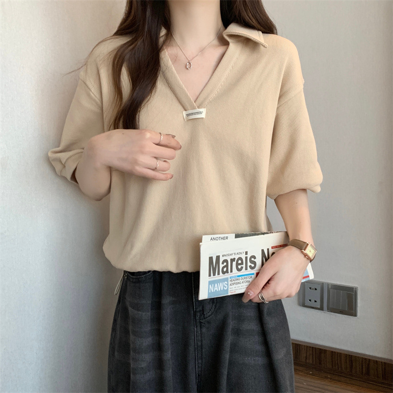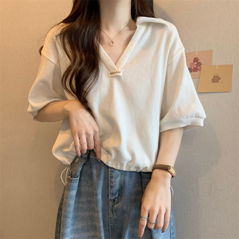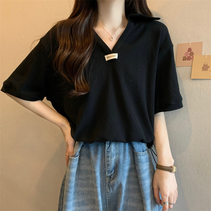 POLO领短袖T恤女夏ins潮宽松显瘦洋气减龄小个子短款V领半袖上衣