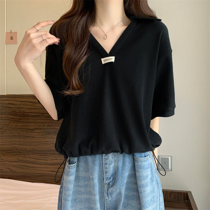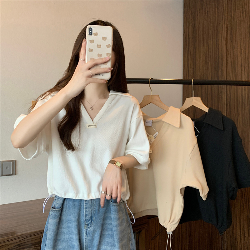 【POLO领抽绳棉质短袖T恤】夏ins潮宽松显瘦 小个子短款V领半袖