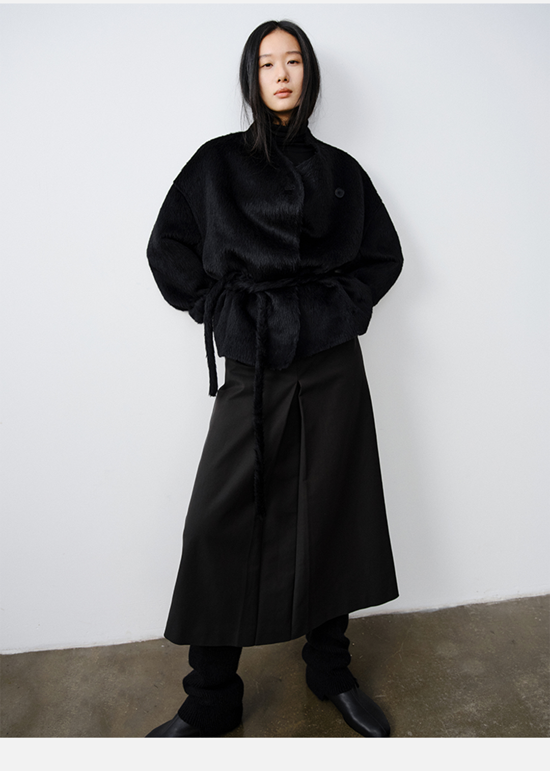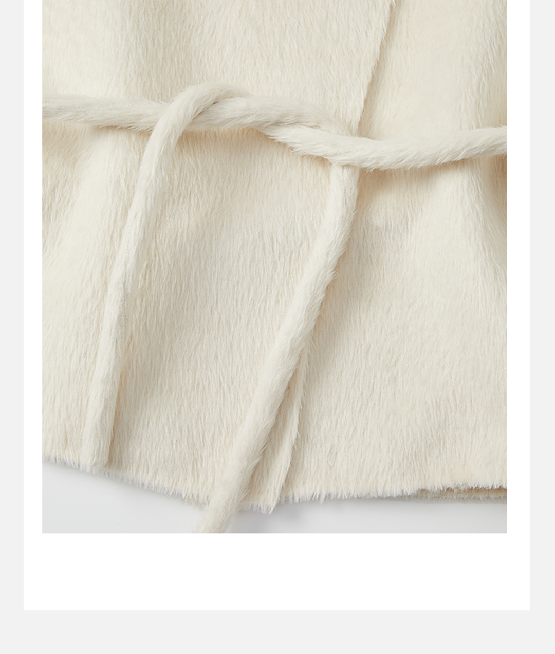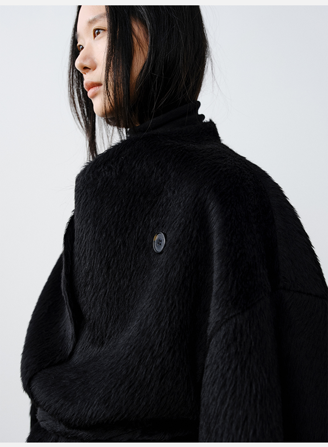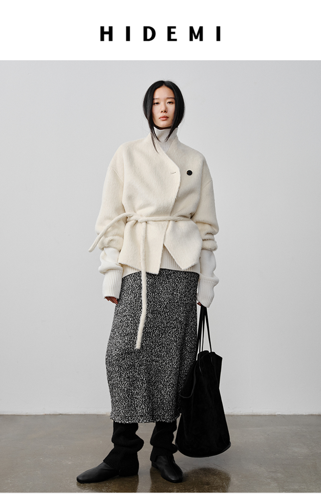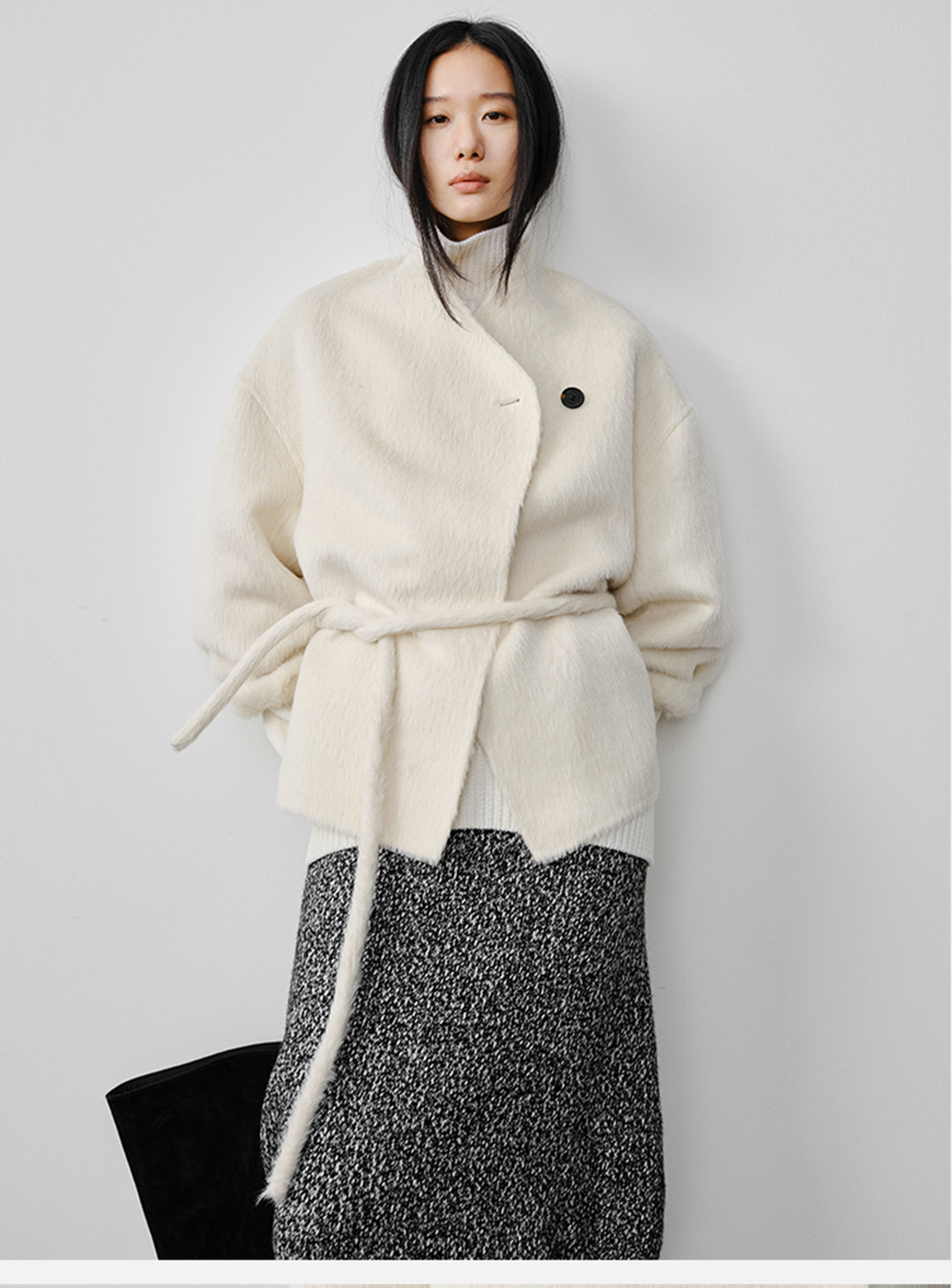HIDEMI 双面alpaca长毛苏力羊驼毛一粒扣不对称门襟可拆卸腰带式大衣 白色/黑色