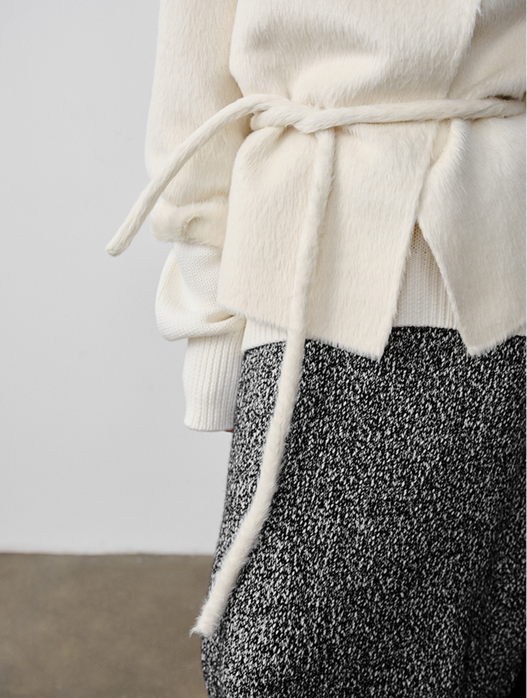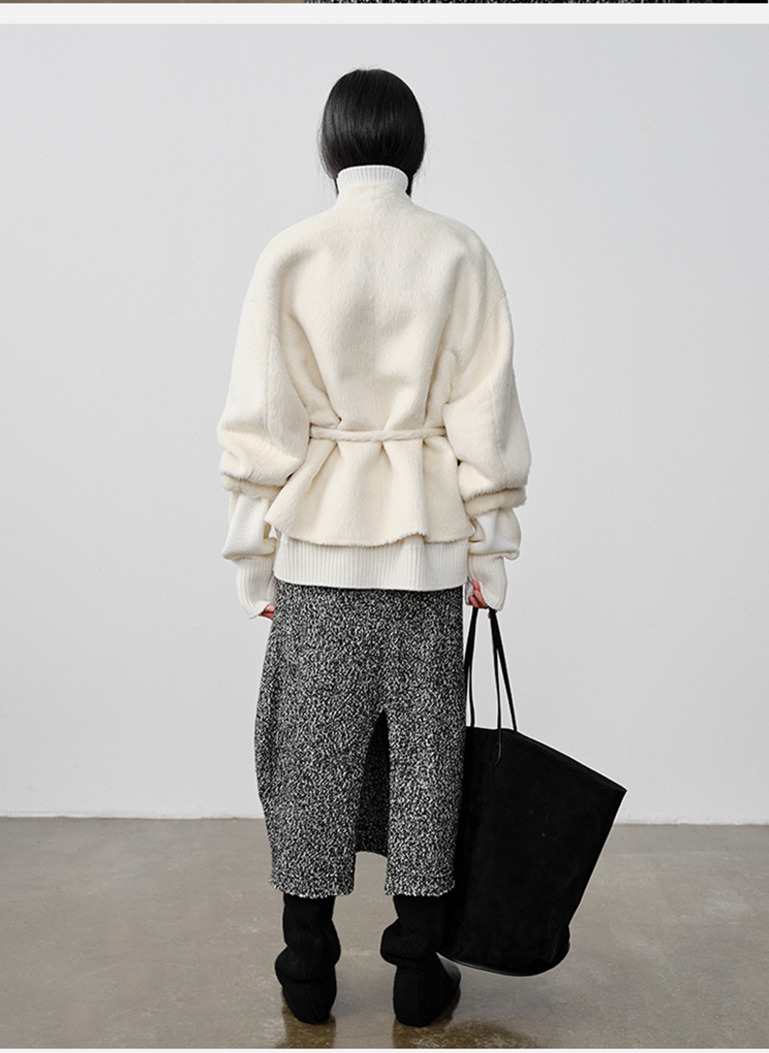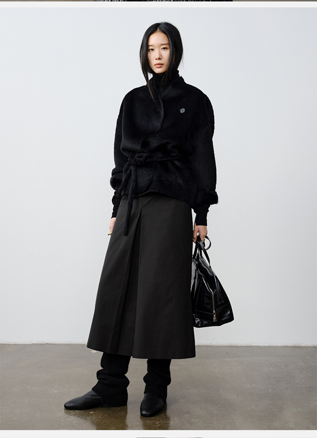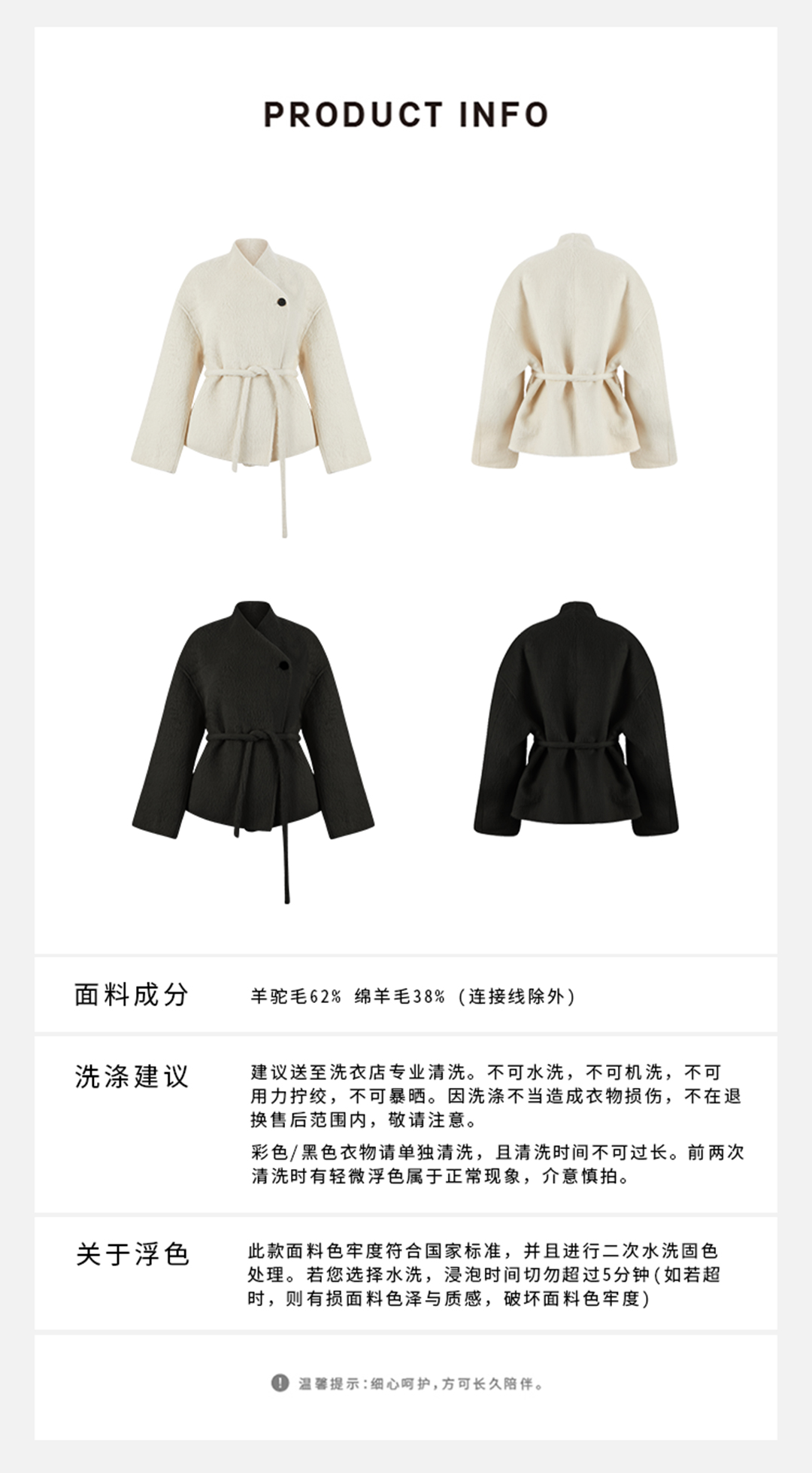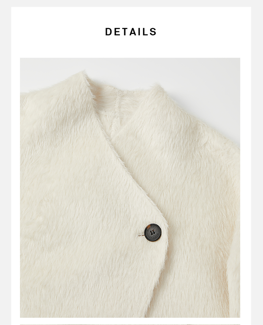 HIDEMI 双面alpaca长毛苏力羊驼毛一粒扣不对称门襟可拆卸腰带式大衣 白色/黑色