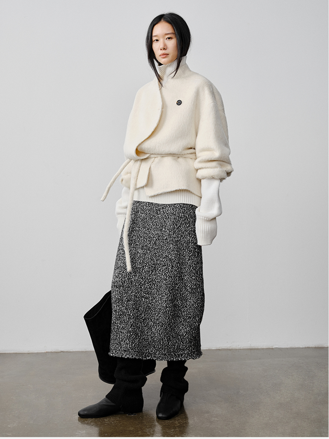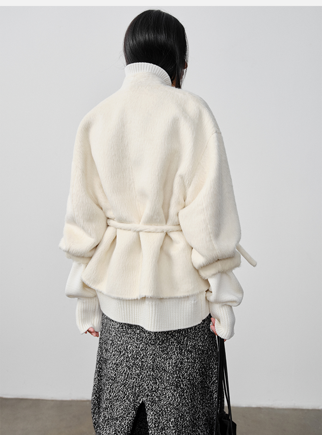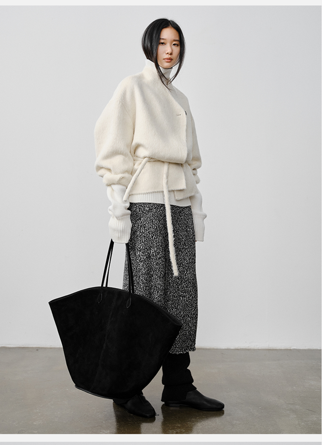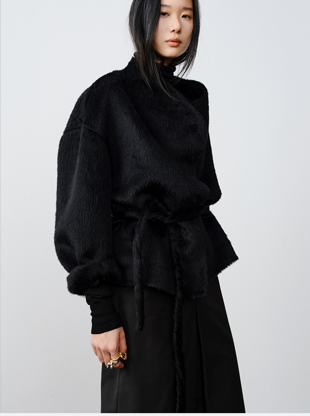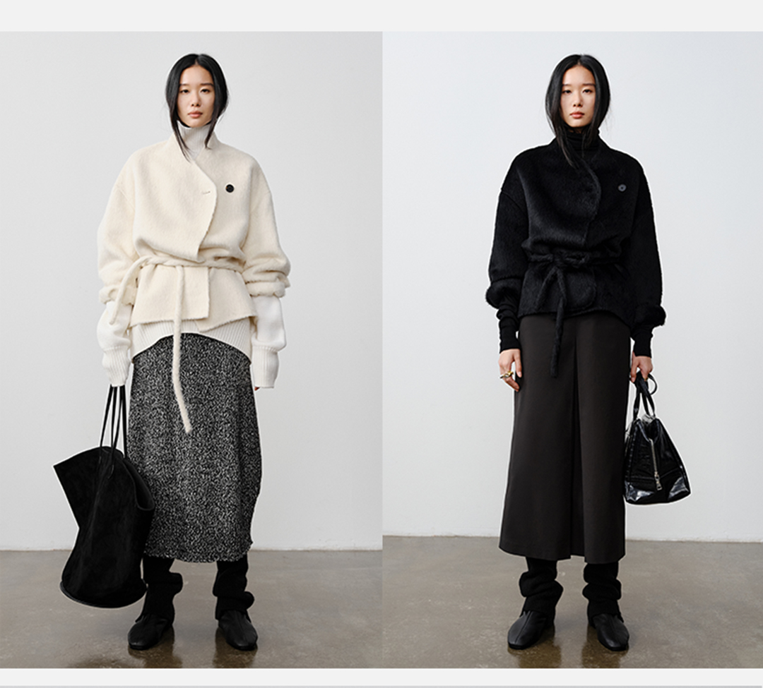HIDEMI 双面alpaca长毛苏力羊驼毛一粒扣不对称门襟可拆卸腰带式大衣 白色/黑色