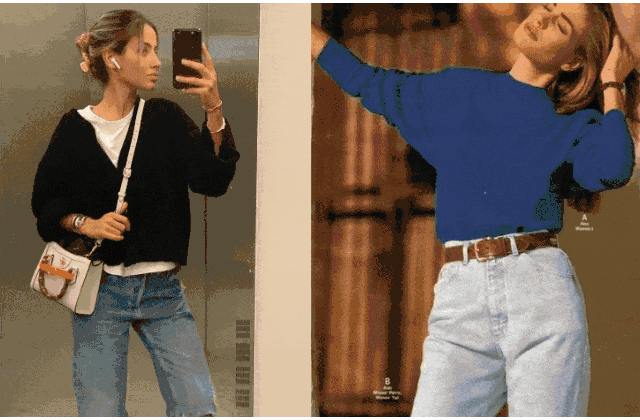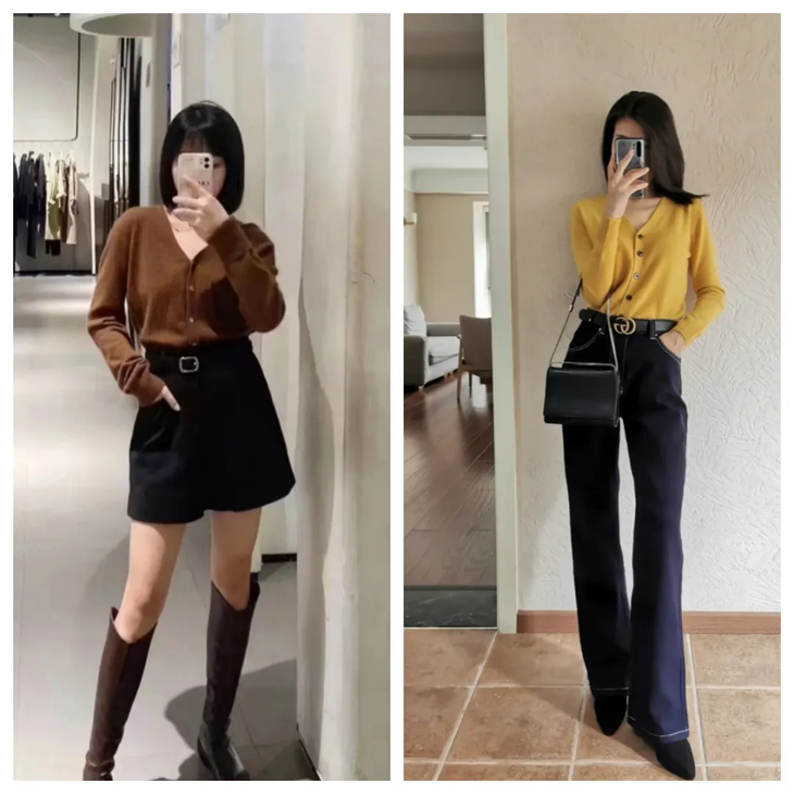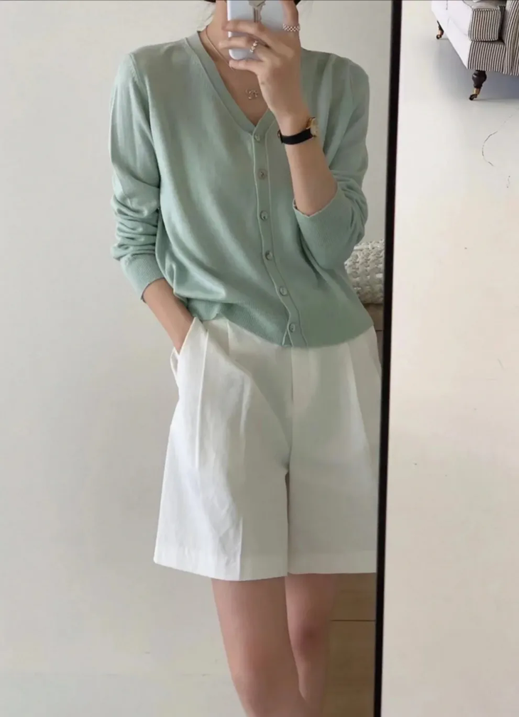 这种百搭款的针织开衫 想要穿得好看简直不要太简单! 第一种穿法,毫无费力的美: 解开领口前第一颗纽扣和下摆1-3颗纽扣 露出里面的内搭,不同颜色/材质带来的层次感 既精致又随性。
