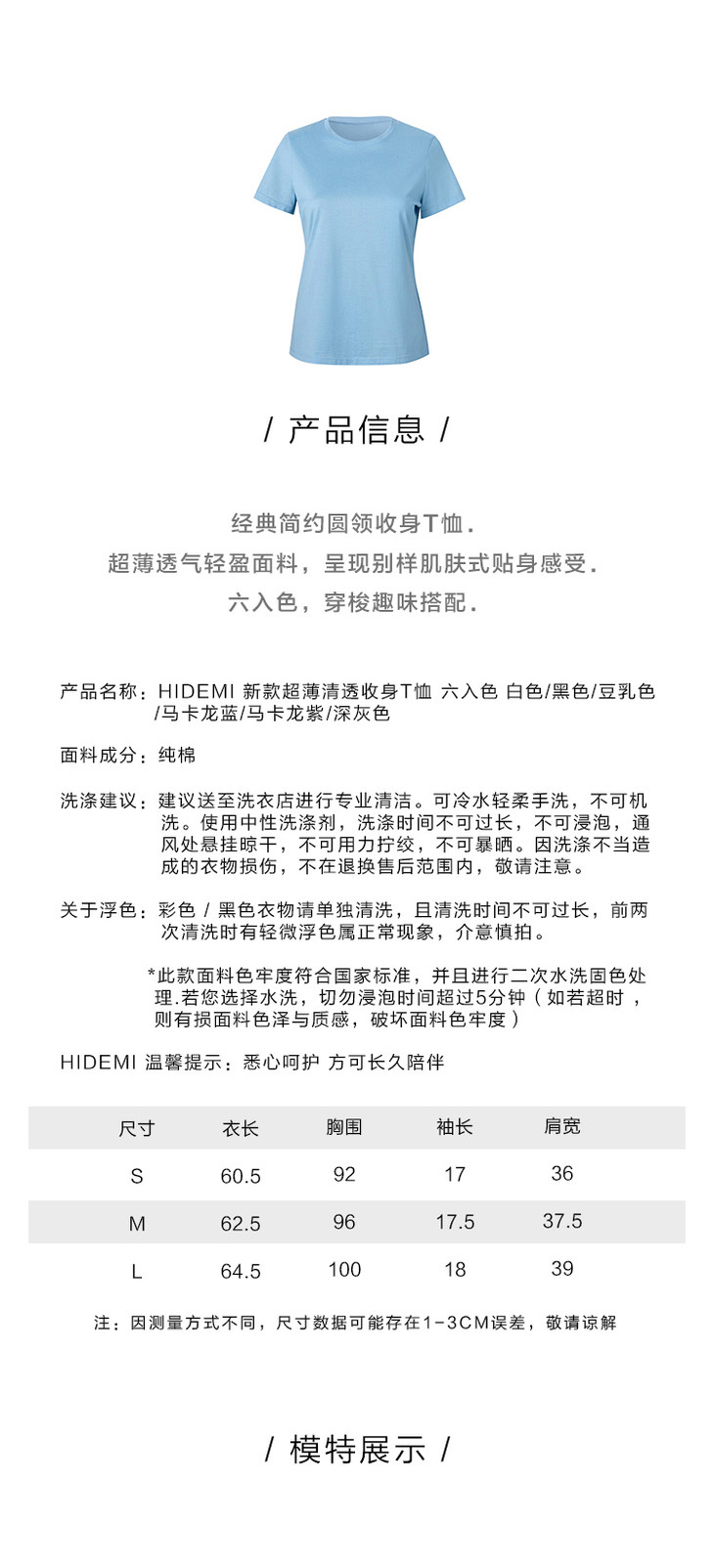 HIDEMI 基础必入 新款超薄有机棉清透收身T恤 六入色 白色/黑色/豆乳色/马卡龙蓝/马卡龙紫/深灰色