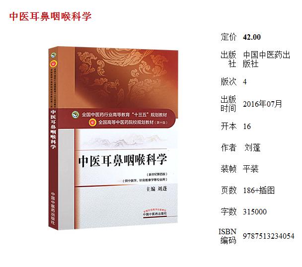中医耳鼻咽喉科学 新世纪第4四版 全国高等中医药院校规划教材 第十10版 十三五规划教材 刘蓬主编 供中医学针灸推拿学等专业用