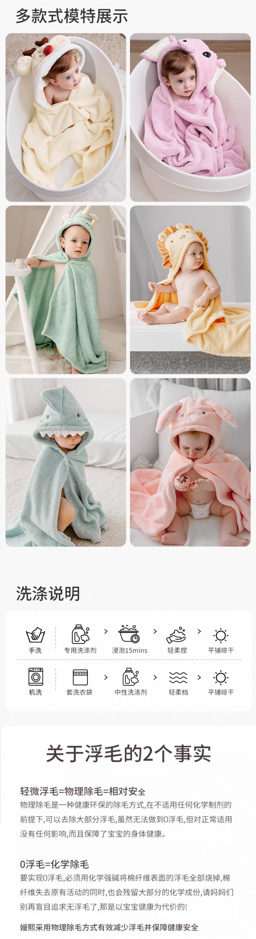 嫚熙珊瑚绒儿童浴巾125*80cm新生婴儿浴袍宝宝超软吸水带帽包被斗篷裹巾