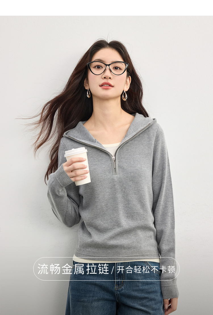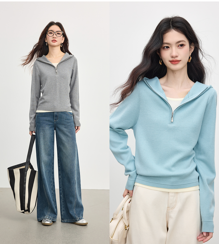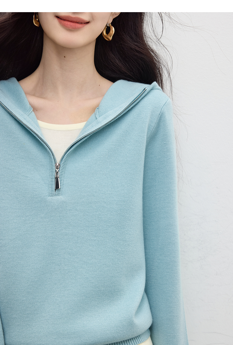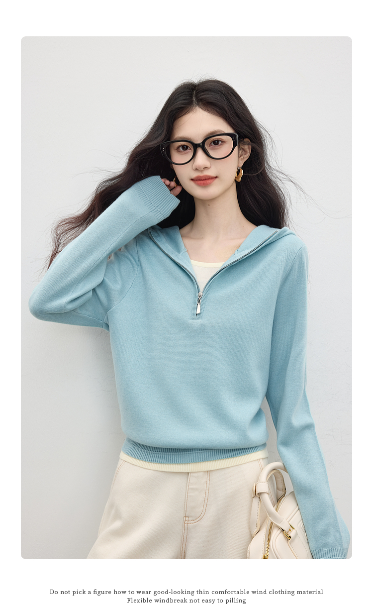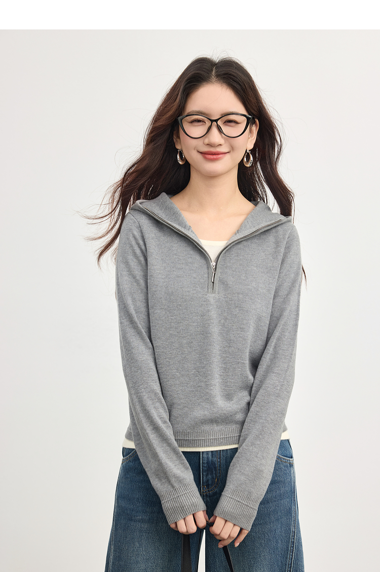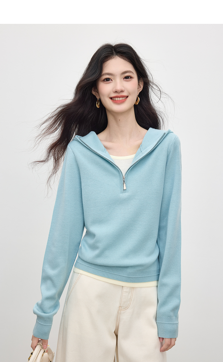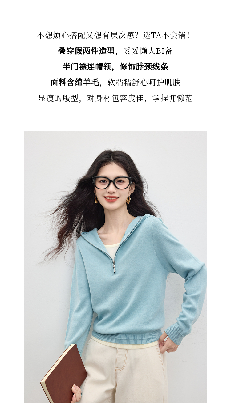 【09/03新品】熙世界半拉链连帽针织衫女2025年秋季新款羊毛假两件套头毛衫上衣