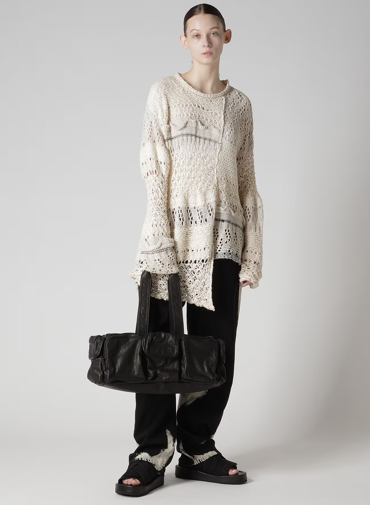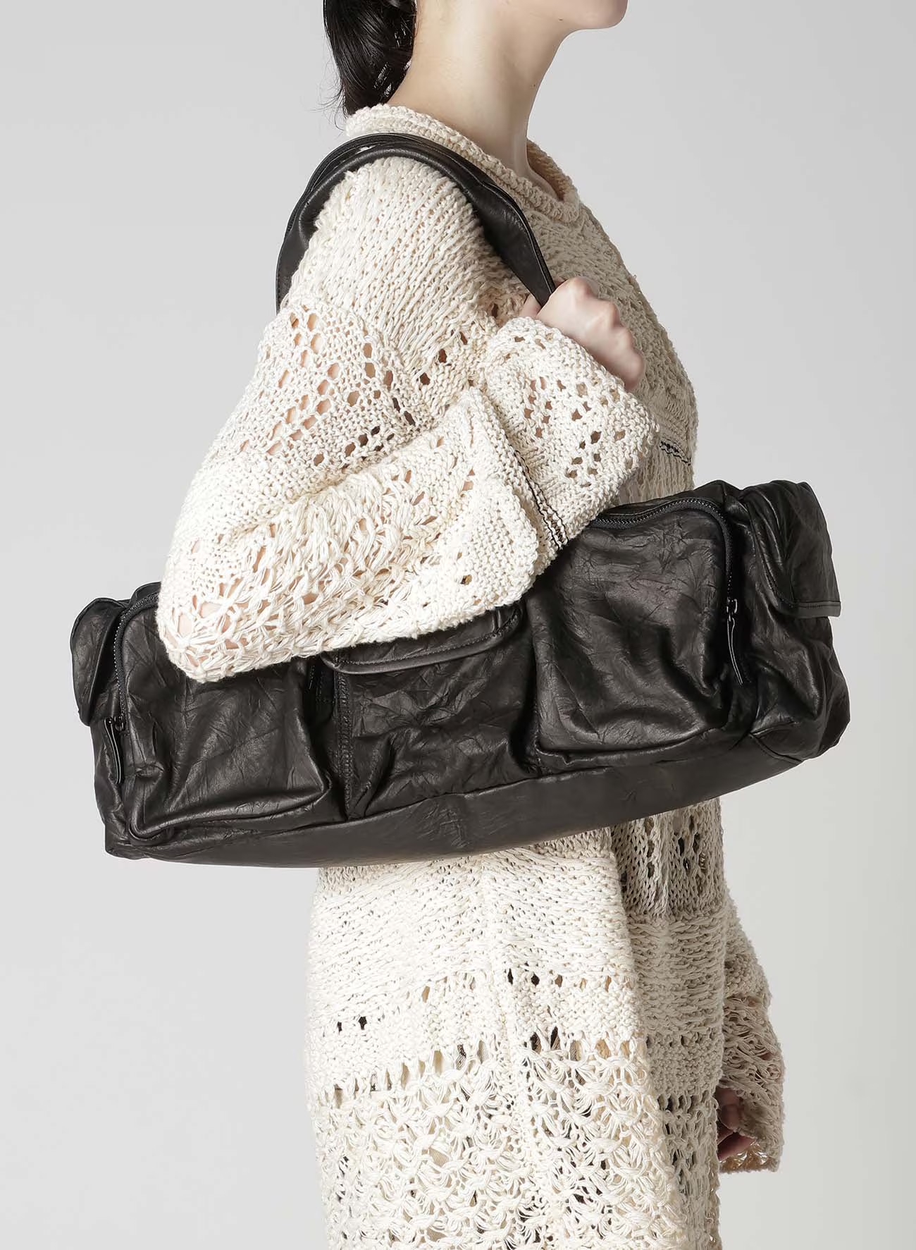 包采用柔软的褶皱纹理皮革制成,凸显其立体口袋设计。请注意,由于皮革的天然特性,汗水和摩擦可能会导致轻微褪色。