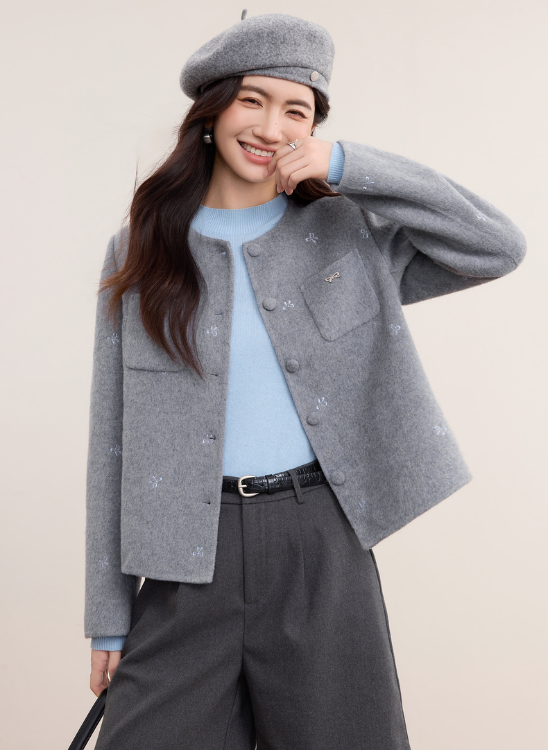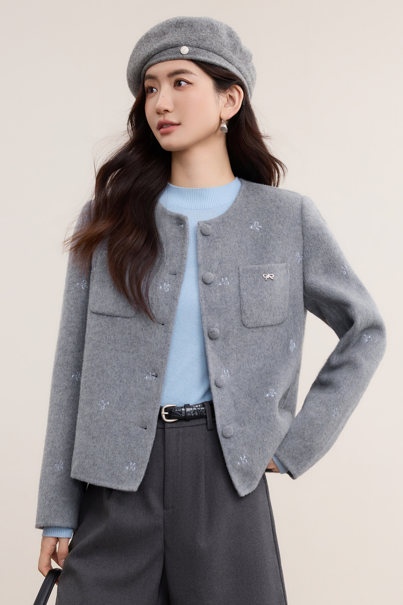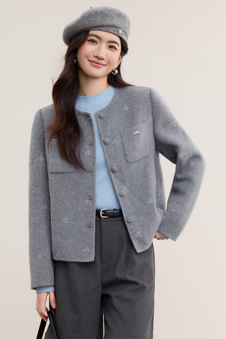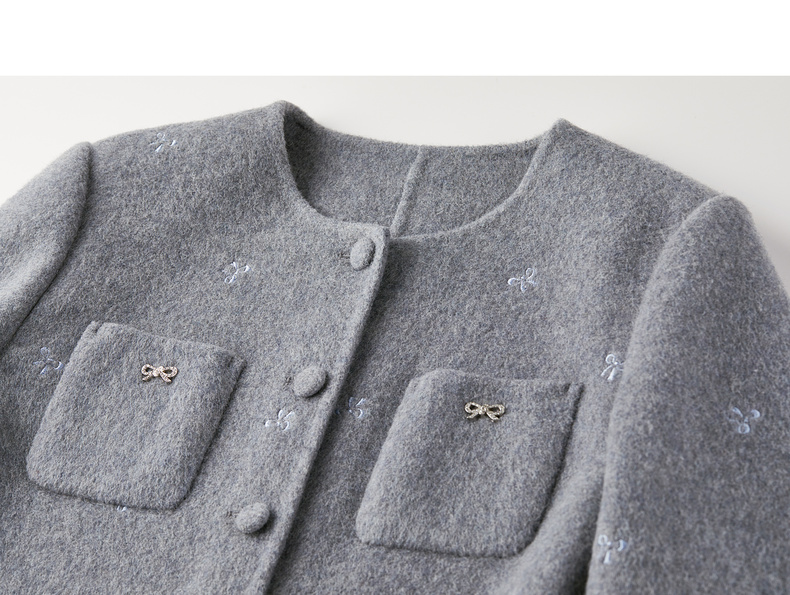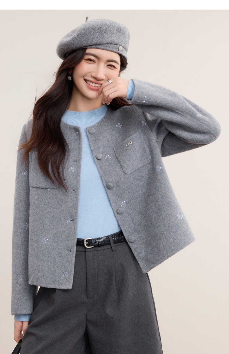 【内购】【56支绵羊毛】小香风通勤圆领包扣蝴蝶结绣花双面呢短款厚外套-W54OE8760