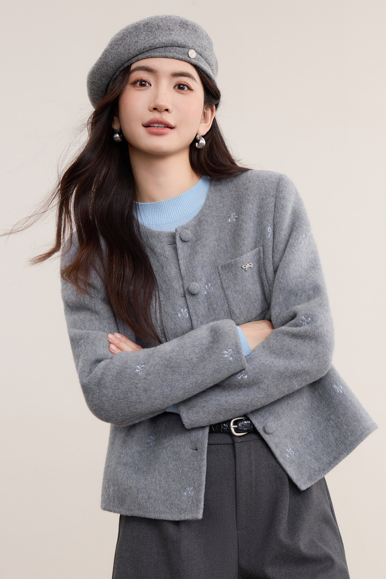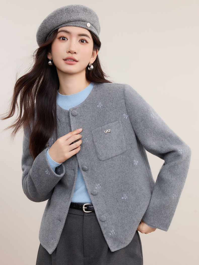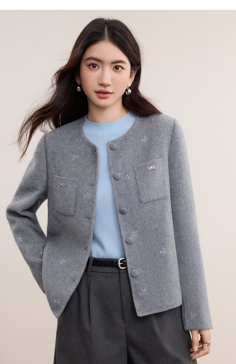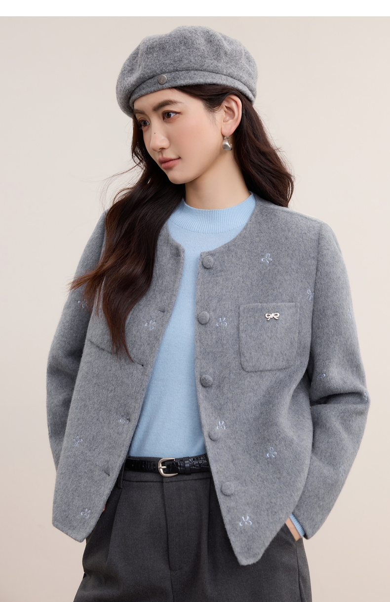 【内购】【56支绵羊毛】小香风通勤圆领包扣蝴蝶结绣花双面呢短款厚外套-W54OE8760