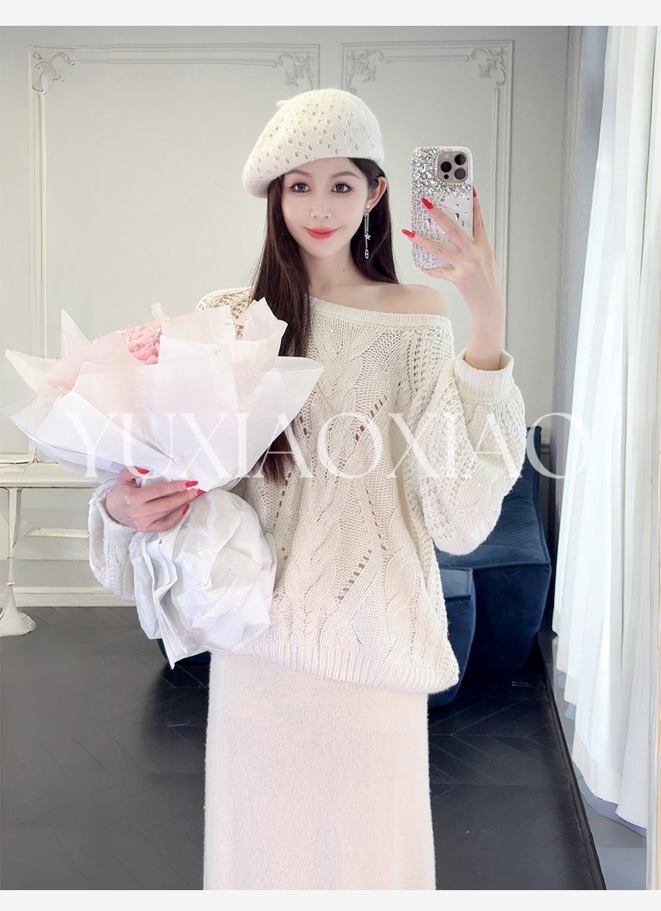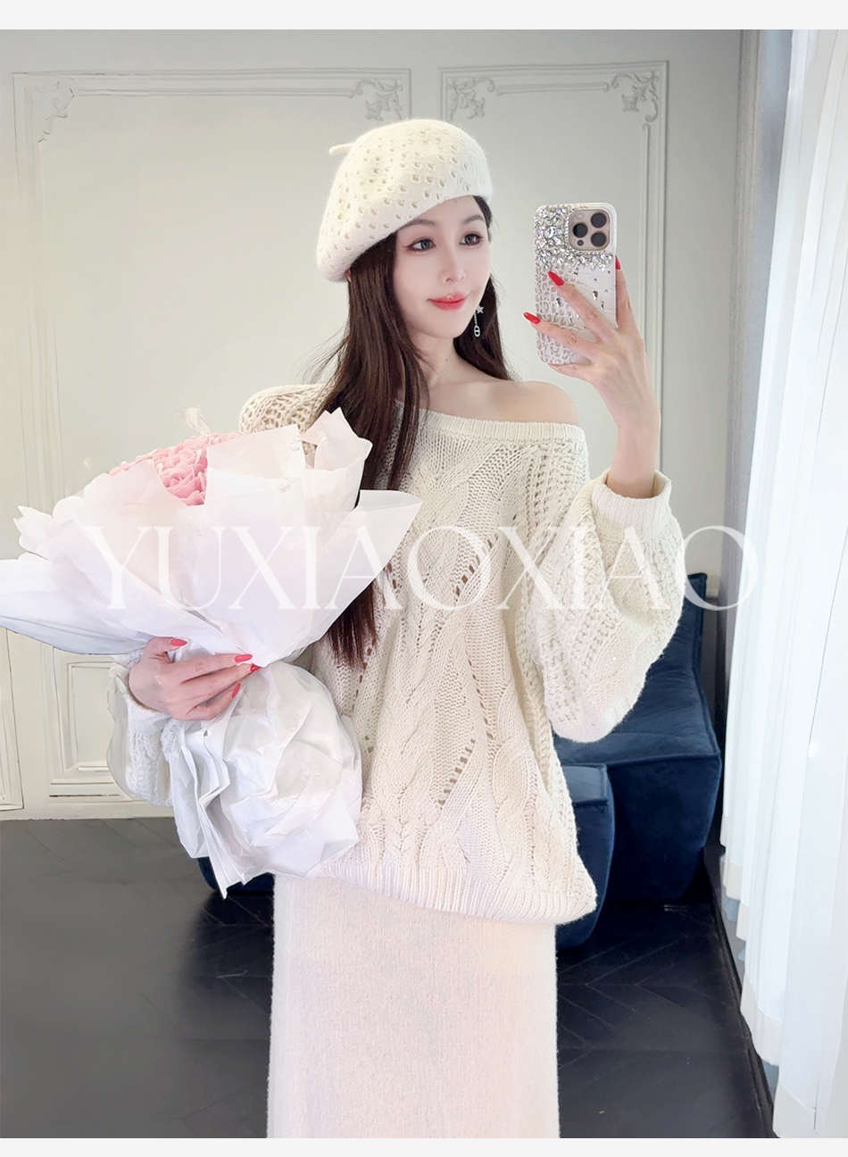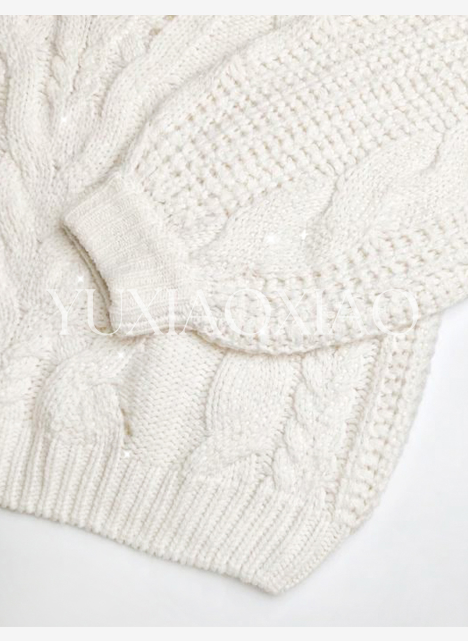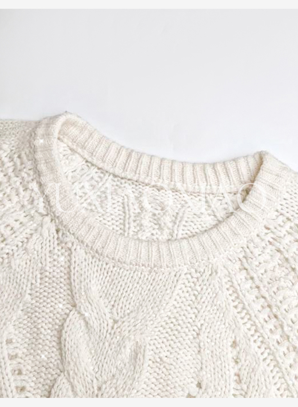 余潇潇【雅致欧尼】时尚烫钻镂空高支澳毛混纺圆领宽松灯笼袖毛衣
