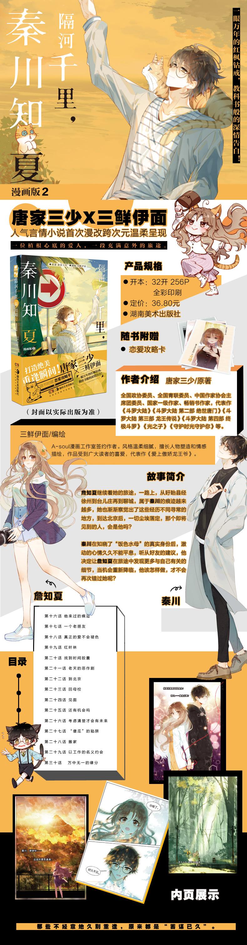 ★网文大神唐家三少 人气都市小说首次漫改,原著具有一定粉丝基数。 原著作者◆唐家三少 作者介绍:中国作家协会全国委员会委员、福布斯名人榜上榜作家、起点中文网白金作家、网络小说很好名家。以平均一年一部超长篇、高质量的作品书写传奇。每部作品均赚得过亿点击、千万收藏推荐、百家媒体关注。作为“中国作家富豪榜网络作家之王”得主,唐家三少连续两年蝉联“中国网络作家富豪榜”冠军宝座,是中国最富有IP价值的作家之一。 代表作:《光之子》《狂神》《斗罗大陆》《神印王座》《冰火魔厨》《生肖守护神》《斗罗大陆Ⅱ绝世唐门》《斗罗大陆 第三部 龙王传说》等。 《隔河千里,秦川知夏》原著小说是网文大神唐家三少继《斗罗大陆》《为了你,我愿意热爱整个世界》《拥抱谎言拥抱你》《守护时光守护你》后再度书写的都市情感力作,2019年在咪咕阅读上线,唐家三少倾情推荐,读者反响热烈。由中南天使出版的《隔河千里,秦川知夏》实体书,同样受到了诸多粉丝的喜爱。 ★漫画家三鲜伊面倾情改编,温暖、细腻的视觉化呈现。 《隔河千里,秦川知夏》漫画版由人气漫画家三鲜伊面改编,其温柔细腻的画风,独到的叙述视角,使得漫画情节贴合原著同时引人入胜。 三鲜伊面为业界很好漫画工作室A-soul的成员,画工扎实,作品出色,有可观的粉丝群以及知名度。三鲜伊面擅长细腻温柔的言情作品,其风格与原著相辅相成。代表作《爱上傲娇龙王爷》在快看漫画APP连载期间积累了极高的热度,人气值破110亿。 ★快看漫画APP独家更新,平台重磅推荐。 2020年9月上线快看漫画平台,首页轮番推荐,触达上亿用户!上线首周登快看漫画APP新作榜第17位,飙升榜第6位!收获众多粉丝以及关注! ★中南天使旗下《爱格》《神漫》,快看漫画APP作品页,多媒体平台轮番推荐,连续数月的书籍活动推广,触达百万粉丝群体。 中南天使旗下《爱格》微博连载,《神漫》微博、微信、杂志活动广告不停歇,快看漫画APP活动持续推广!宣传力度强劲,触达百万粉丝,读者热情高涨,对实体书翘首以盼,未售先火!